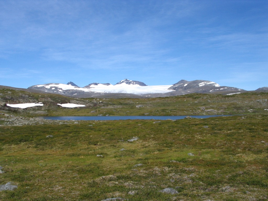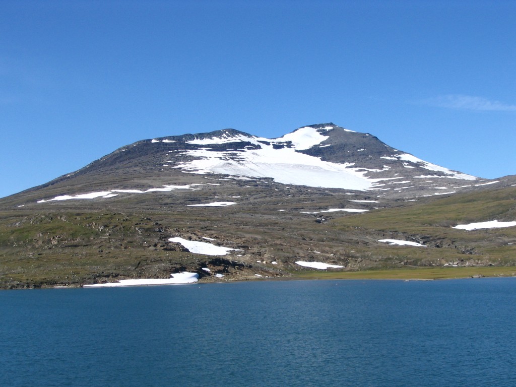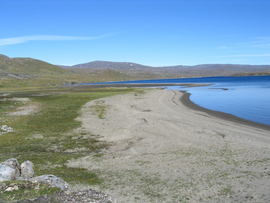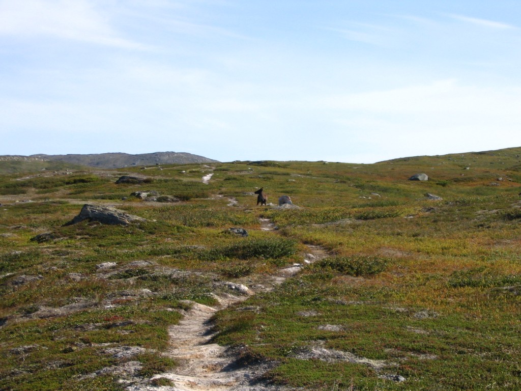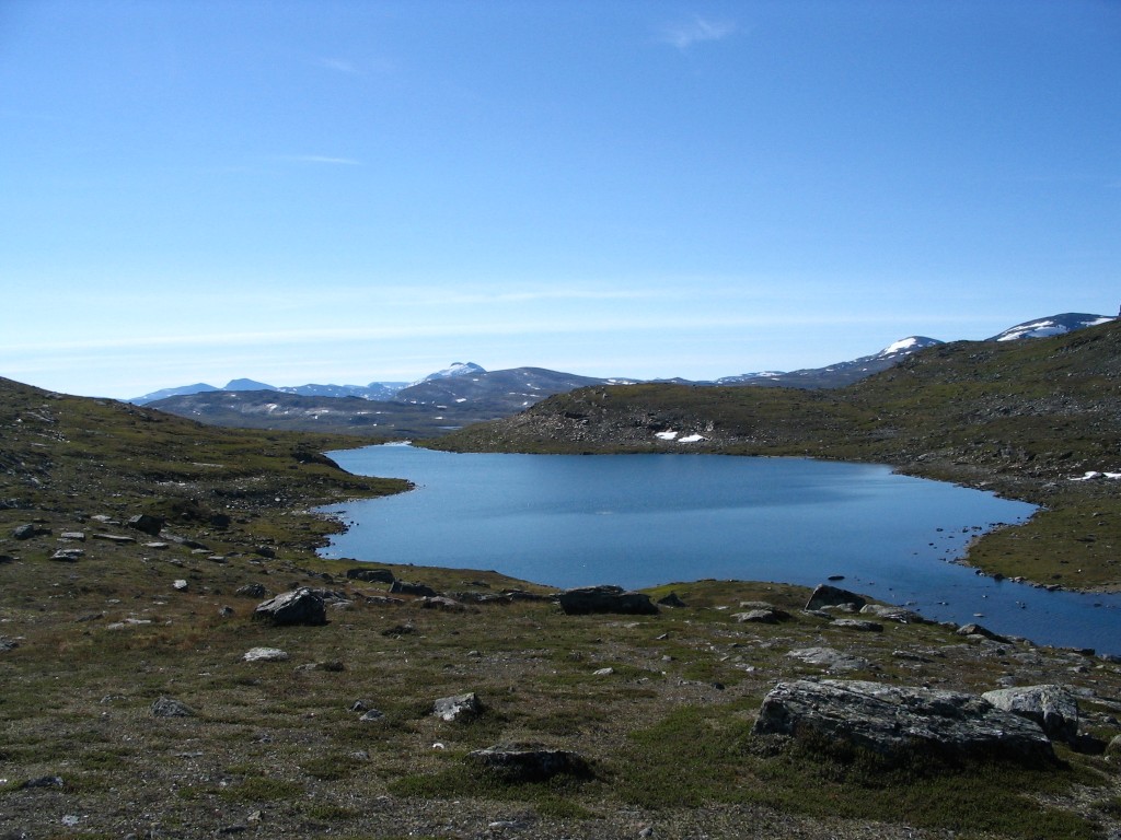 The terrain slanting down to the southern shore of the lake was very uneven, and after a while I descended to the water. A little ways later, in a patch of wet sand, I saw a number of reindeer tracks, but the ground was too dry and coarse in all other places to retain any kind of marks. Soon I had to climb the slope again, since the incline down by the shore grew too steep; going was not really difficult per se, but somewhat demanding just the same.
