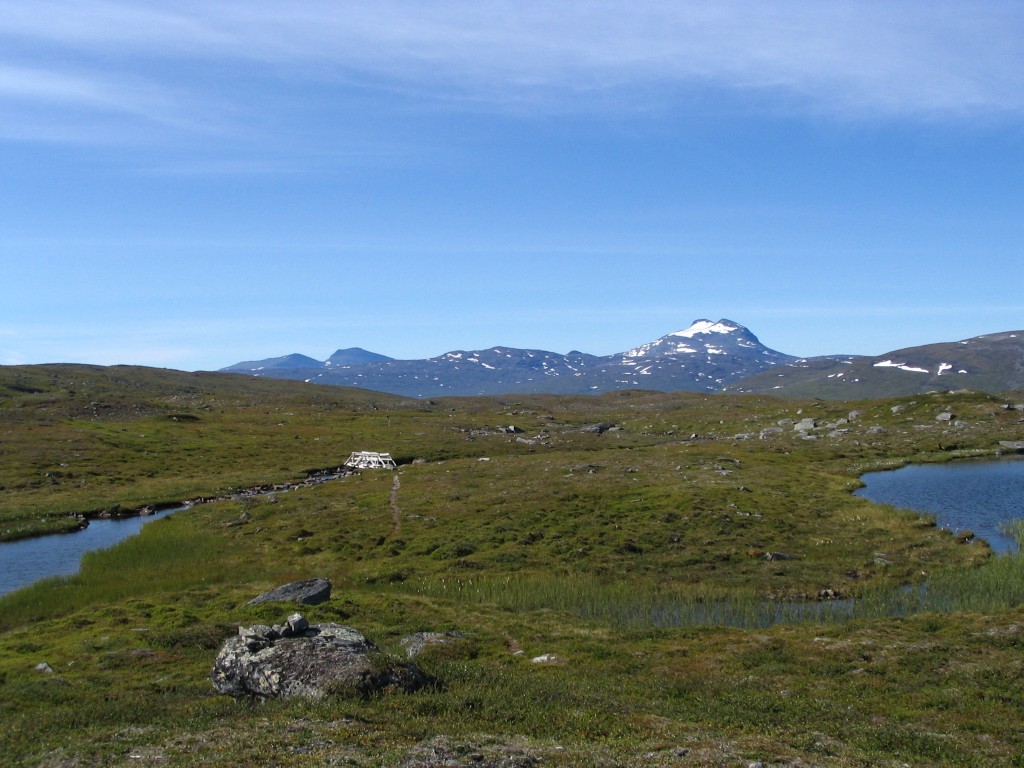 There was some wind again, so I put on the shirt; I also didn't want to expose my naked skin to the sun for too long. On the other side of the bridge the path was not as evident as it thitherto had been, but on the other hand the trail markings were almost excessively clear. The ground was both stonier and wetter as well, but progress was still easy. I noted the point where the old trail joined the new one, coming from Varvvekråhto where the old Varvek hut had been. Formerly there was a small cabin close to that location, but it is no longer included on maps of the region. However, earlier in the day I had seen a structure of some kind just where the cabin was supposed to be, so perhaps it is still there, only too deteriorated to serve as shelter.
