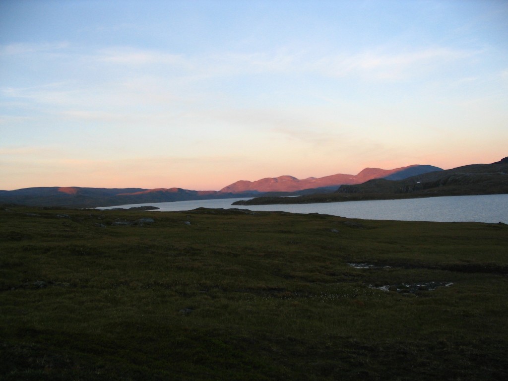 When the sun disappeared behind the neighboring fjelds, temperatures dropped quite noticeably, and I changed into some other clothes more suited for the occasion. I continued to work on my crossword for a bit, and then I went out for a short walk in the refreshing evening. Upon returning I solved some crosswords constructed by others, and then had a real snack this time. By then the wind had subsided a good deal, and some thin whisps of cloud had found their way onto my part of the firmament. I went to bed after 22, reading for a while before turning in.