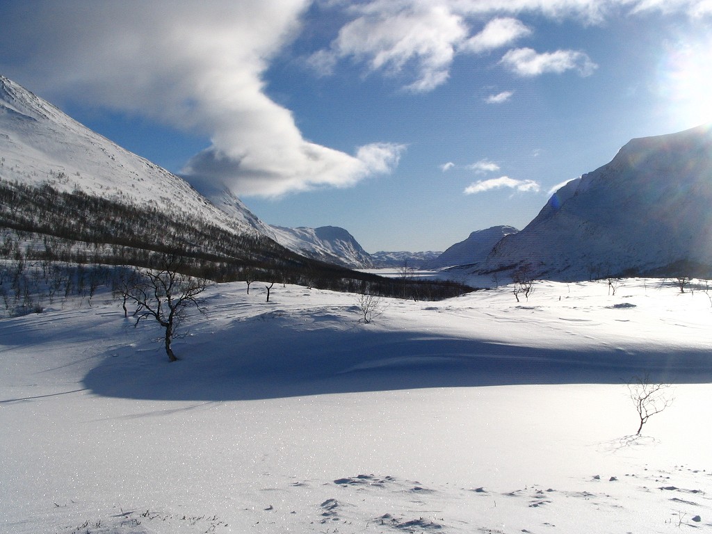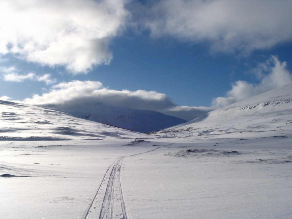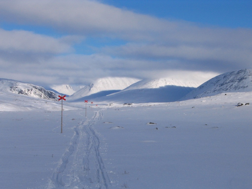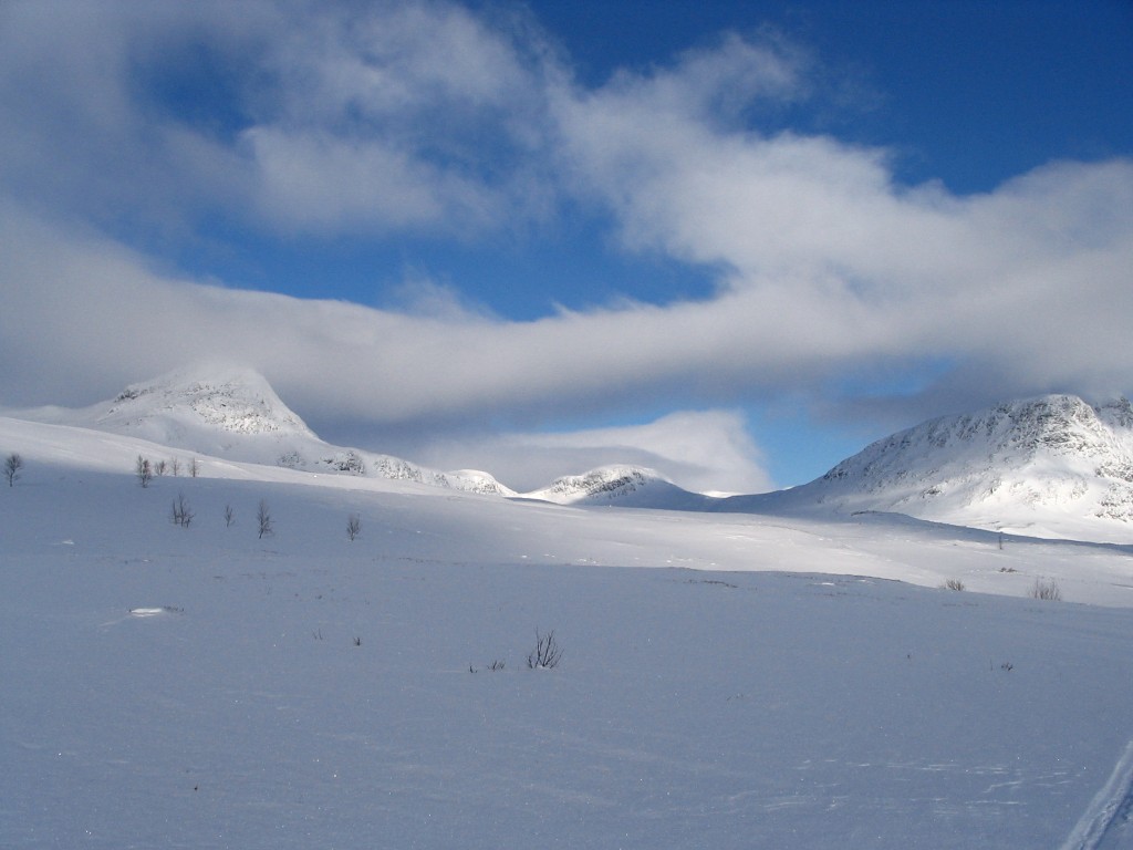 I left after 08:45 in a light wind which faded to nothing in the woodland, and it was not long before I reentered the sunlit expanse. Since it was rather warm I changed into the thinner cap and mittens, but as I was passing the bridge where the summer trail crosses Čeakčajohka the wind had grown back in force, so I switched back. Clouds were hanging in the southwest and northwest, as well as around most peaks in view. I found my old tracks from day 2, which a snowmobile driver had travelled upon (I don't know why certain drivers seem to have a pathological need to do that, thereby destroying them for other skiers), but I could still make them out, and I followed them north for a bit before crossing the stream. I proceeded on its eastern bank until the trail turn under Stuor-Jiertá, where I started following the markers. By then it was rather cloudy behind me, and in central Čeakčavággi elongated clouds were flowing out of the orthogonally connecting valleys.