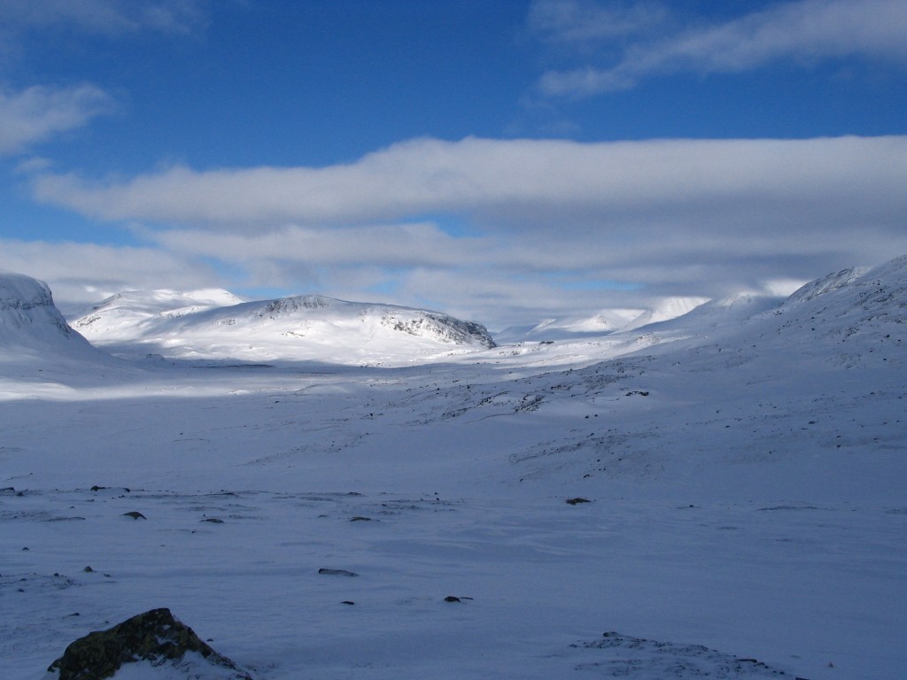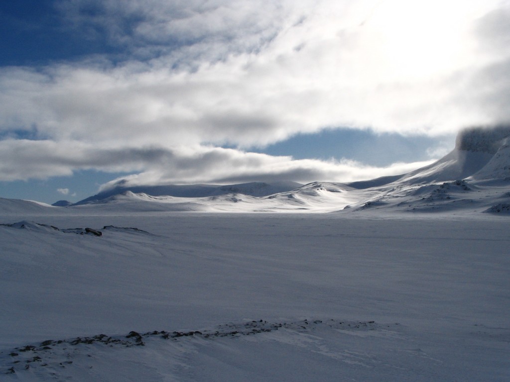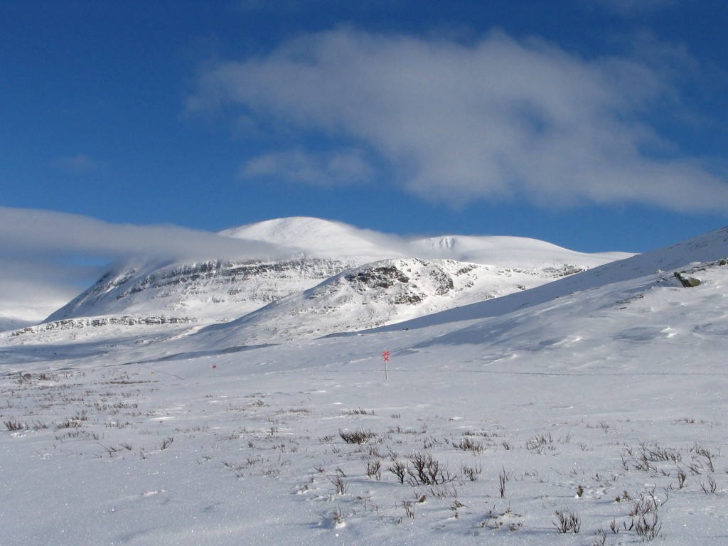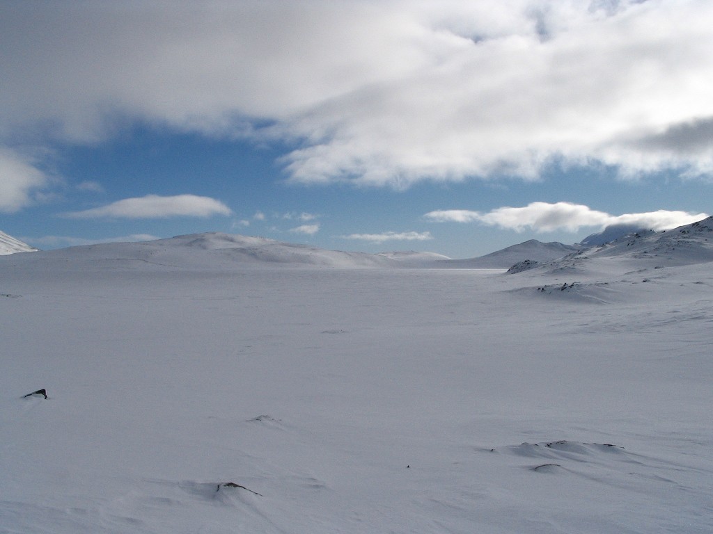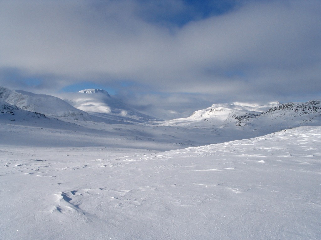 After a short bit I returned to skiing on the stream, and a kilometer or two further ahead I broke away northeast to a signpost where a summer trail branches off between Unna Jierttáš and Stuor-Jiertá, passes Jierttájávri and then between Unna Jierttáš and Liddunjunnji, to connect with the Kebnekaise trail in Láddjuvággi. The signs themselves were broken and gave no information, but the marking cairns were clearly visible, and I skied upwards just south of these. The peak-clouds, which had been absent for some time, were now growing again, and particularly Stuor-Jiertá was hidden in large parts. I noted a multitude of animal tracks as I climbed to the small pass northwest of Jierttájávri, and then the sun was swallowed by the S-J cloud. With a clear view of the lake I sat down with my back against a sizeable rock at 11:30; the westerly wind had reached appreciable strength, with keen gales.
