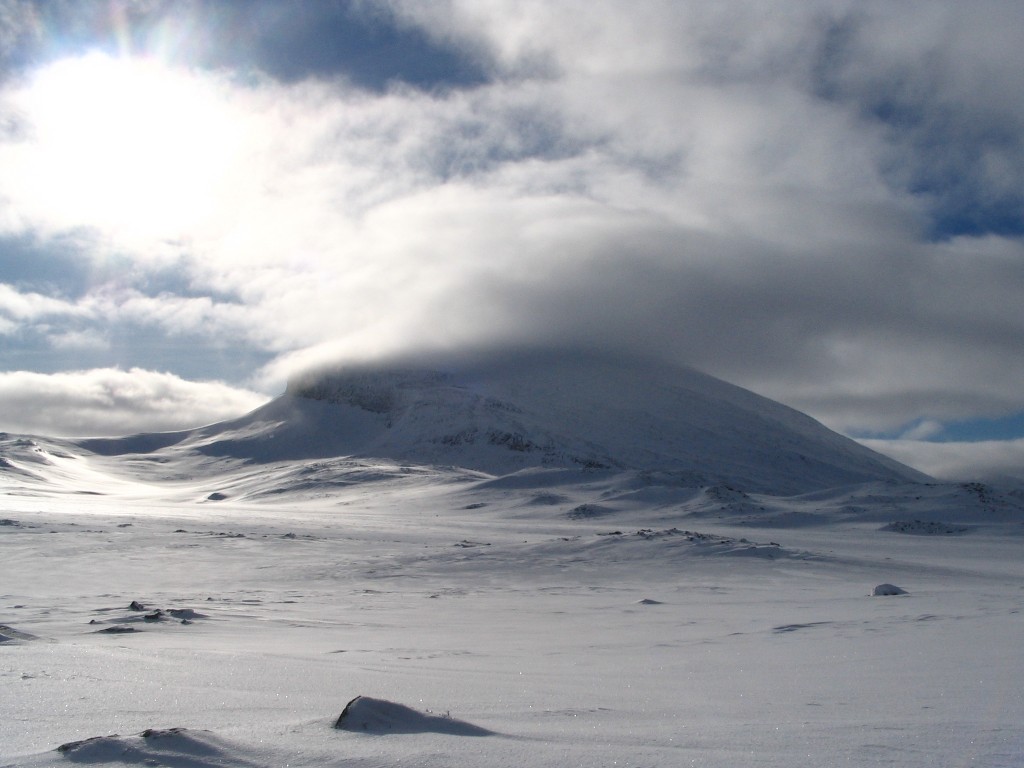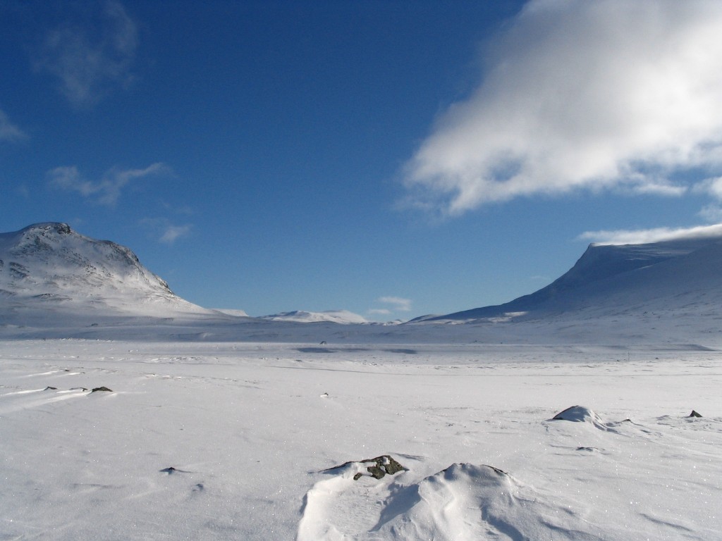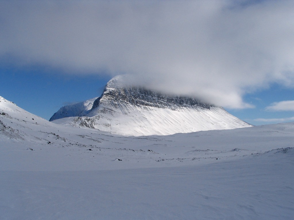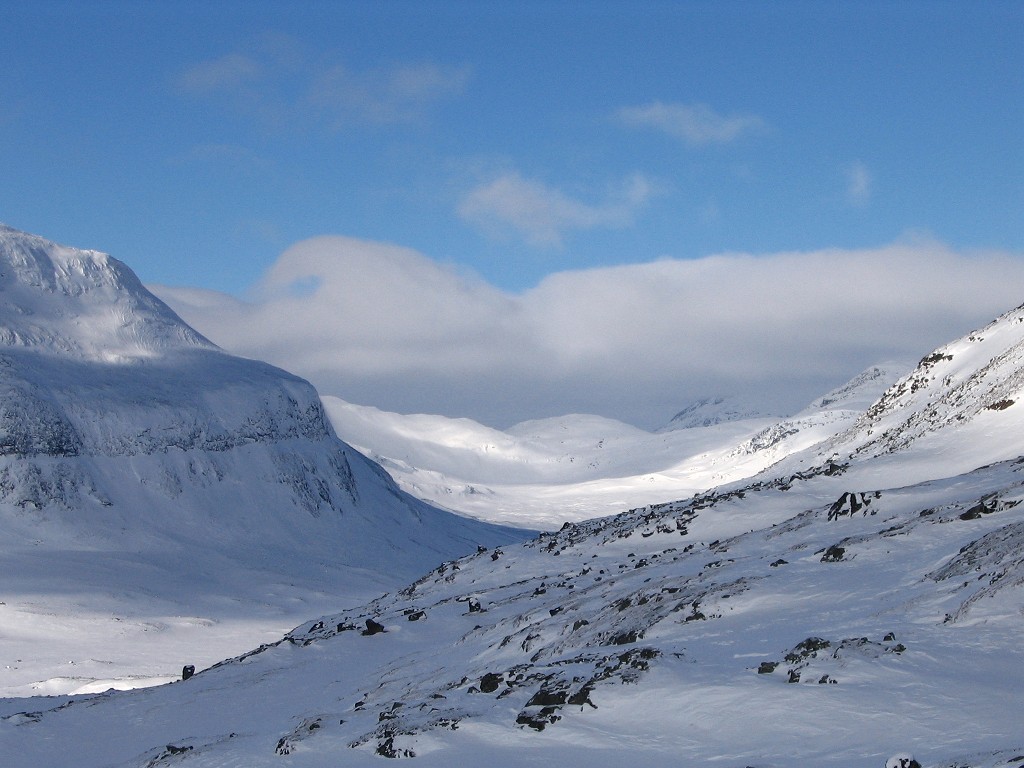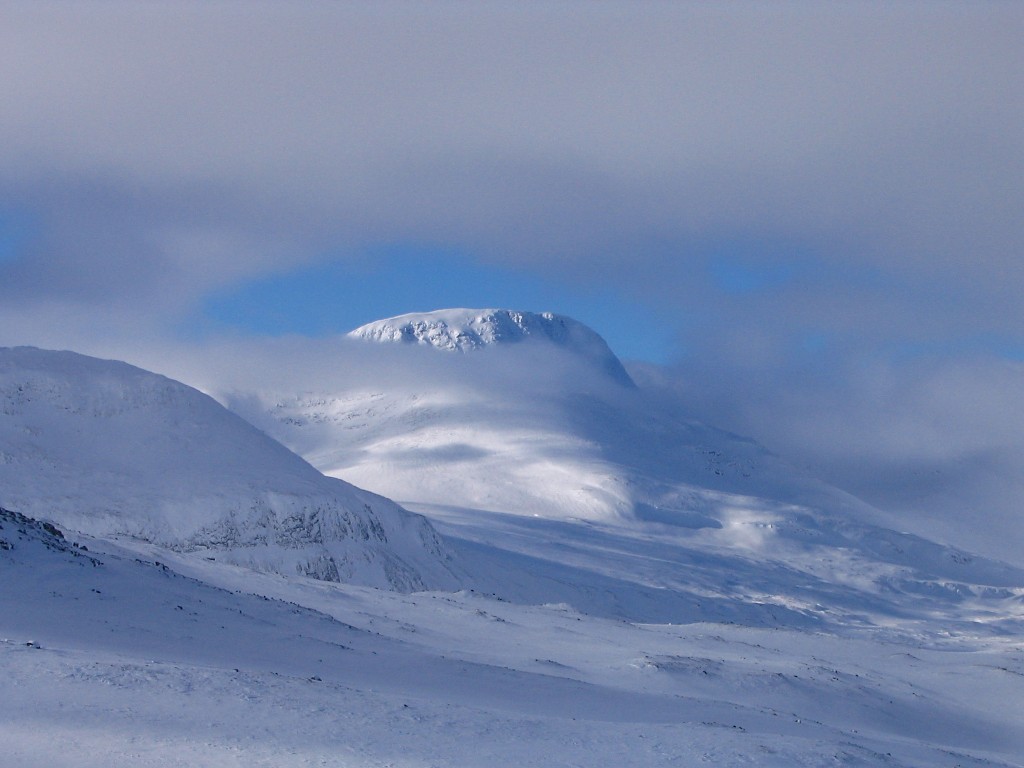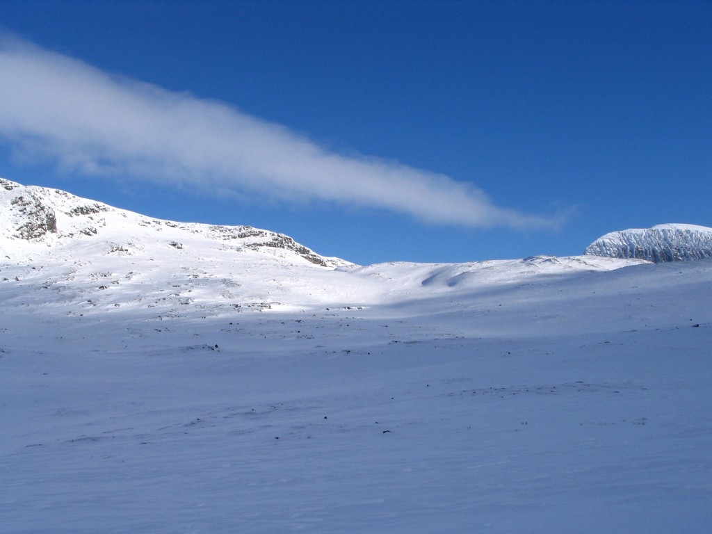 After a short bit I returned to skiing on the stream, and a kilometer or two further ahead I broke away northeast to a signpost where a summer trail branches off between Unna Jierttáš and Stuor-Jiertá, passes Jierttájávri and then between Unna Jierttáš and Liddunjunnji, to connect with the Kebnekaise trail in Láddjuvággi. The signs themselves were broken and gave no information, but the marking cairns were clearly visible, and I skied upwards just south of these. The peak-clouds, which had been absent for some time, were now growing again, and particularly Stuor-Jiertá was hidden in large parts. I noted a multitude of animal tracks as I climbed to the small pass northwest of Jierttájávri, and then the sun was swallowed by the S-J cloud. With a clear view of the lake I sat down with my back against a sizeable rock at 11:30; the westerly wind had reached appreciable strength, with keen gales.