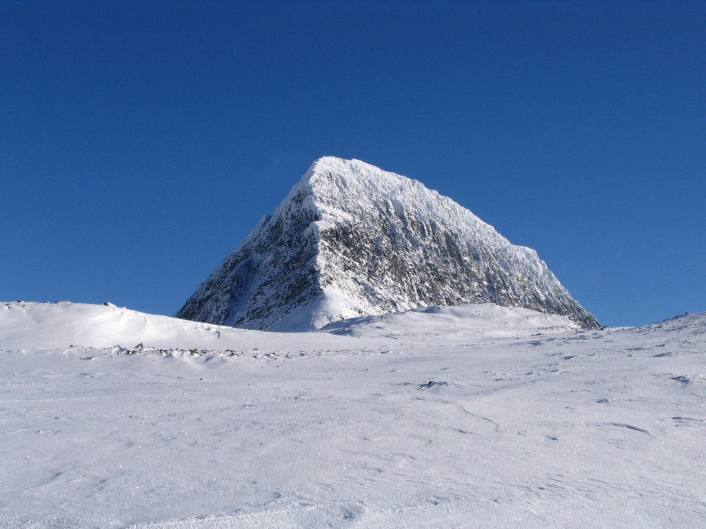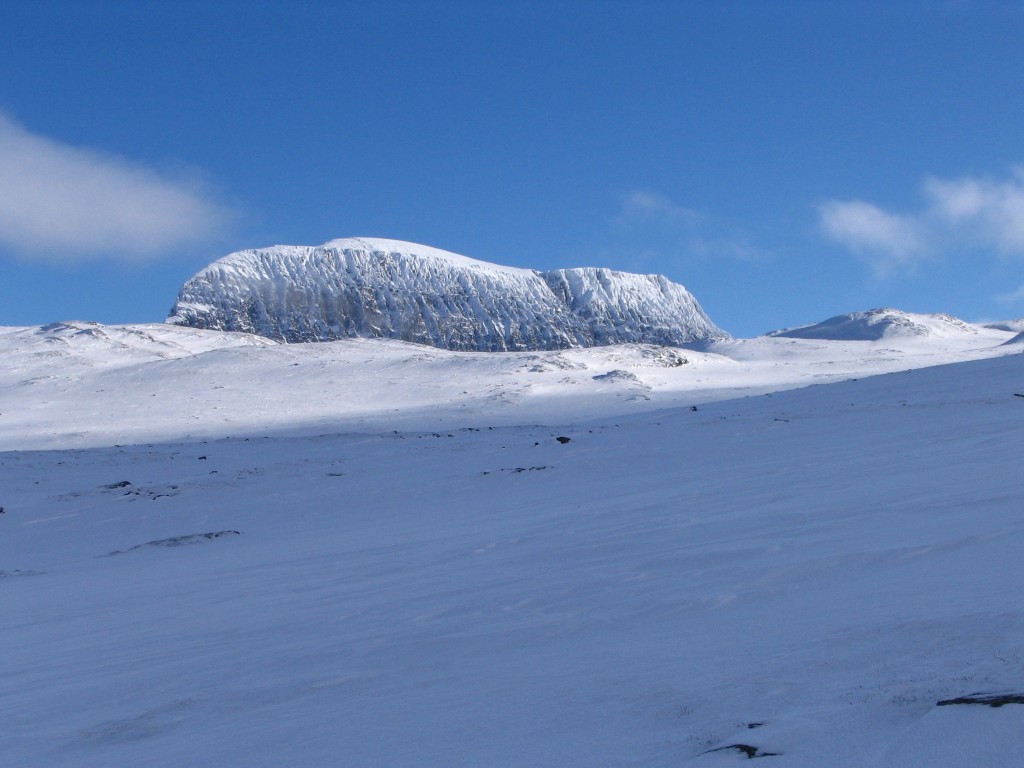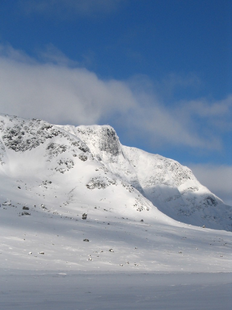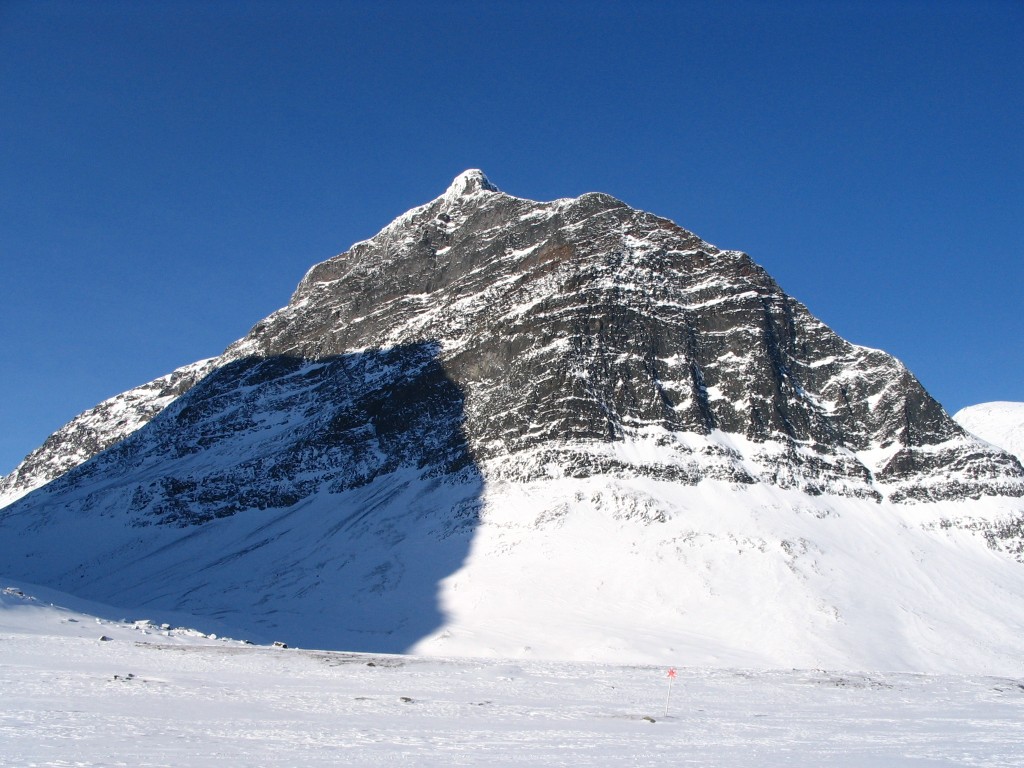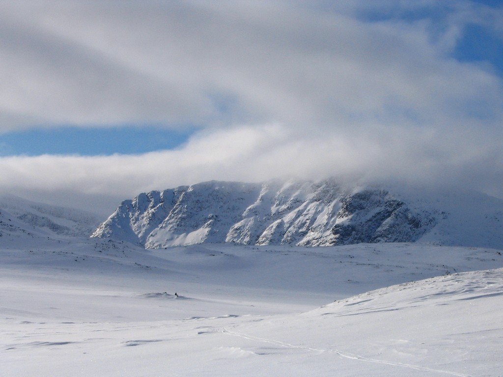 After a short bit I returned to skiing on the stream, and a kilometer or two further ahead I broke away northeast to a signpost where a summer trail branches off between Unna Jierttáš and Stuor-Jiertá, passes Jierttájávri and then between Unna Jierttáš and Liddunjunnji, to connect with the Kebnekaise trail in Láddjuvággi. The signs themselves were broken and gave no information, but the marking cairns were clearly visible, and I skied upwards just south of these. The peak-clouds, which had been absent for some time, were now growing again, and particularly Stuor-Jiertá was hidden in large parts. I noted a multitude of animal tracks as I climbed to the small pass northwest of Jierttájávri, and then the sun was swallowed by the S-J cloud. With a clear view of the lake I sat down with my back against a sizeable rock at 11:30; the westerly wind had reached appreciable strength, with keen gales.
