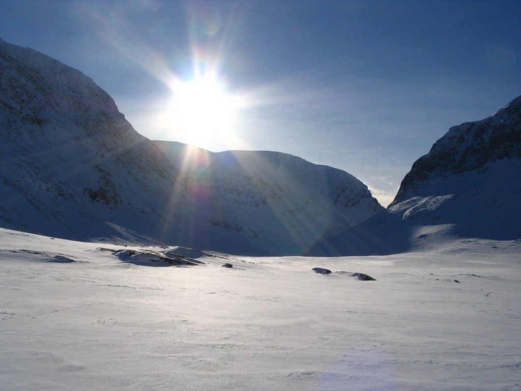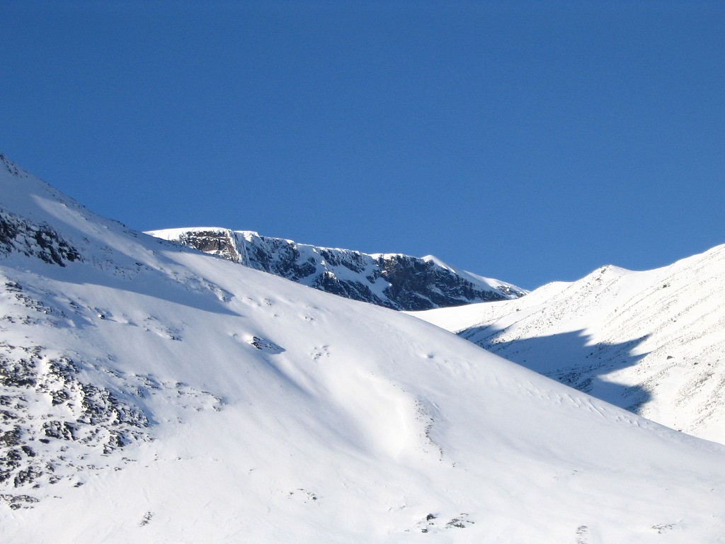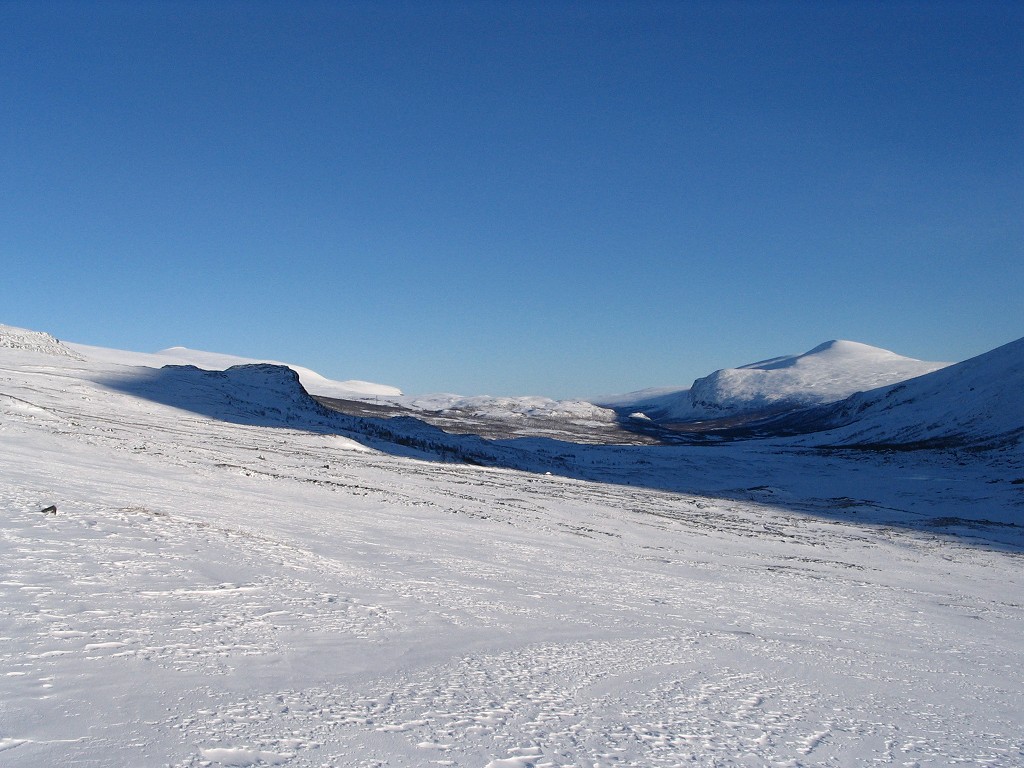 There was still no sun while I ate and more clouds were appearing, especially around Liddubákti; it was clear to the northeast and southeast, though. Again I proceeded a bit south of the still visible cairns, and I had no more started moving before the clouds parted, the sun came out, and the wind decreased. Figures. In the next pass there were snowmobile tracks going off towards (or coming from) Liddujávrrit, and I also saw some snowmobiles down in Láddjuvággi. For some reason the trail has been drawn down the steepest possible section of the slope, and that's where the tracks headed as well; I took an easier route myself, coming onto the main trail when the cairns did. In the valley the wind was back to full strength, and soon I entered the shadow of Liddubákti.