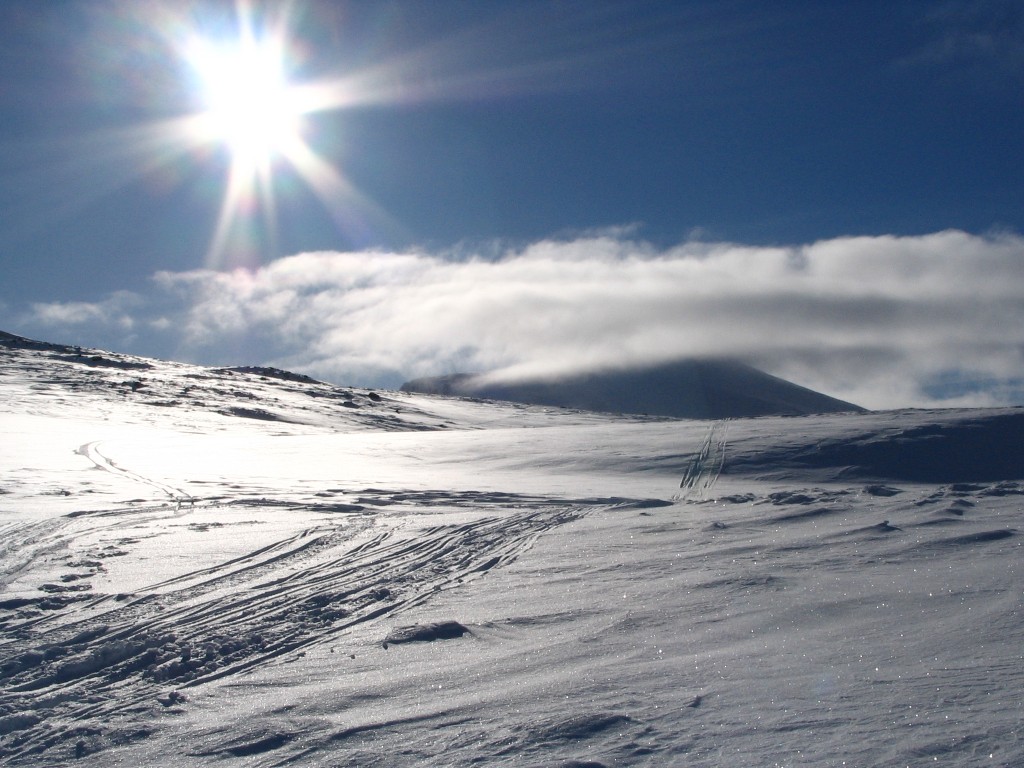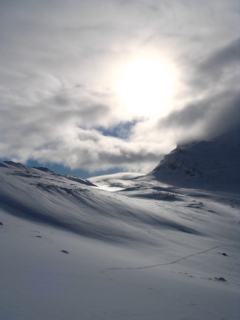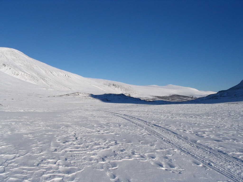 I skied in an older snowmobile track beside the trail at first, going back to it at the bend. The clouds had been lifting behind me all the time, and now that I could see into the broad parts it was clear that it was clear in that direction too. Just before the small bridge over Šiellajohka, back in the sun, I turned upwards, passing west of Lillberget in/beside some old (and frozen) ski tracks. There the wind had subsided again, but higher up the slope it rose substantially, now coming from the southwest. I was feeling a bit worn for some reason, but I had some easily accessible chocolate left to raise by blood sugar, and the nice weather wasn't exactly hurting things.