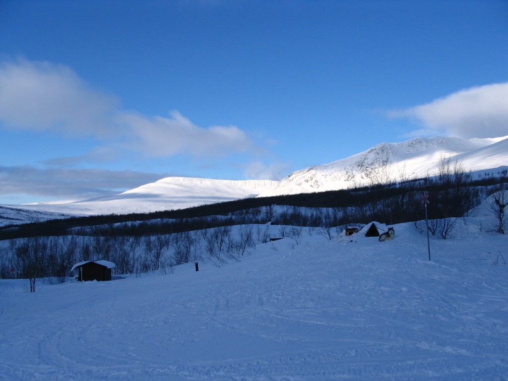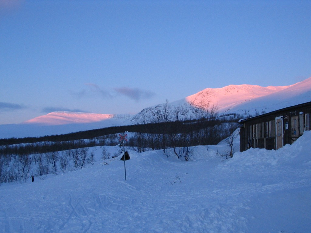 In places the snow cover was thin, and I made several course corrections as I first aimed for Jökelbäcken and then straight at Kaipak, all in a wind which couldn't decide what it wanted to be. I found an old set of tracks the tangent of which pointed towards Kitteldalen, and I followed these to the crest between Kaipak and Mastberget, where there was hardly any snow left. Coming from that direction the canteen was the first section I passed, so I thought it natural to go inside for a snack. I was accompanied by several other staffers who were also on leave, while outside the clouds had started to reclaim lost ground.