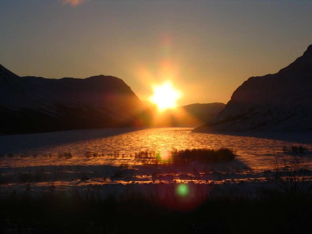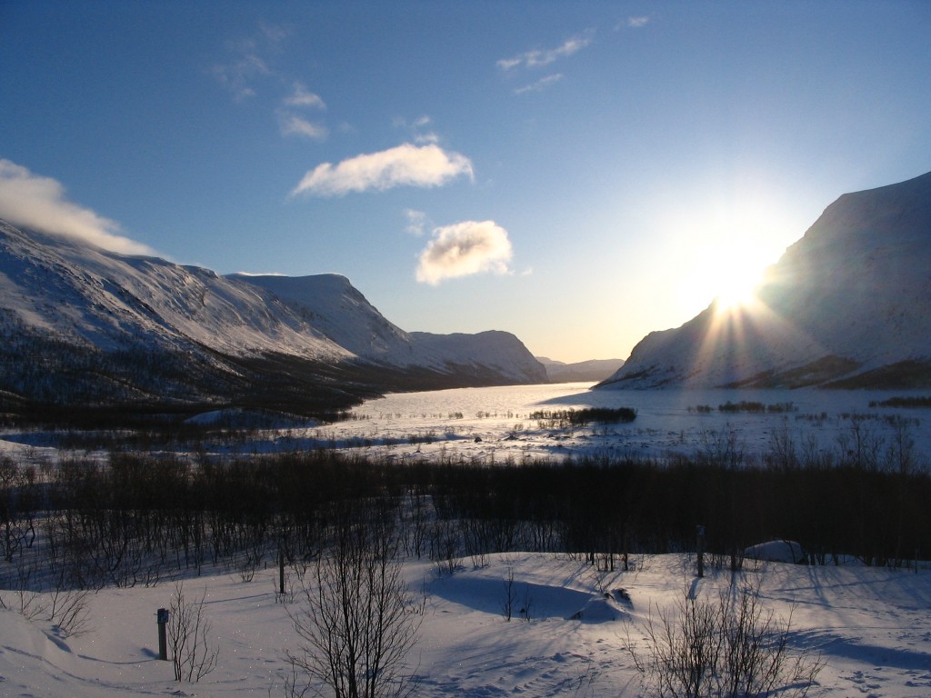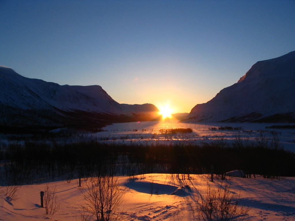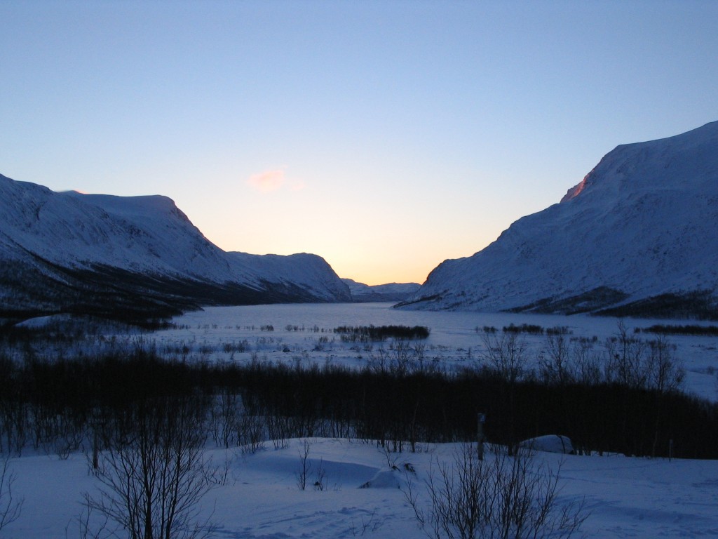 After another night's good sleep I swung my legs over the edge of the bed at 06:30, seeing blue sky with a few wisps through the window, and there was some westerly wind. I started a fire and then went out to witness the amazing sunrise – this time of year dawn will occur at the far end of the lake, right in the gap between Čoalmmebákti and Čoalmevárri, which makes for a very nice framing effect. I packed up and made breakfast, and when I was all set I went over to say good-bye to Maj-Lis and Henry; more clouds had appeared, it was a bit windy, and the sun was passing behind Livamčohkka, but it was still fair indeed.