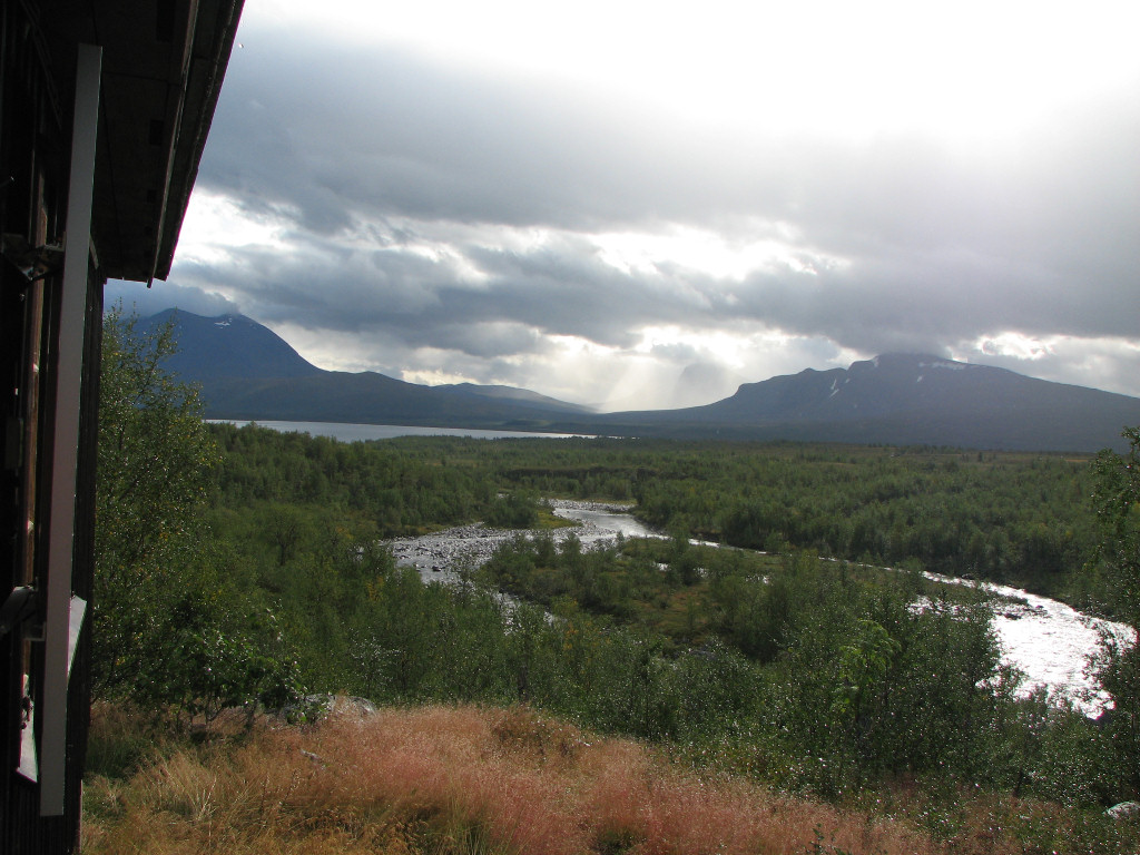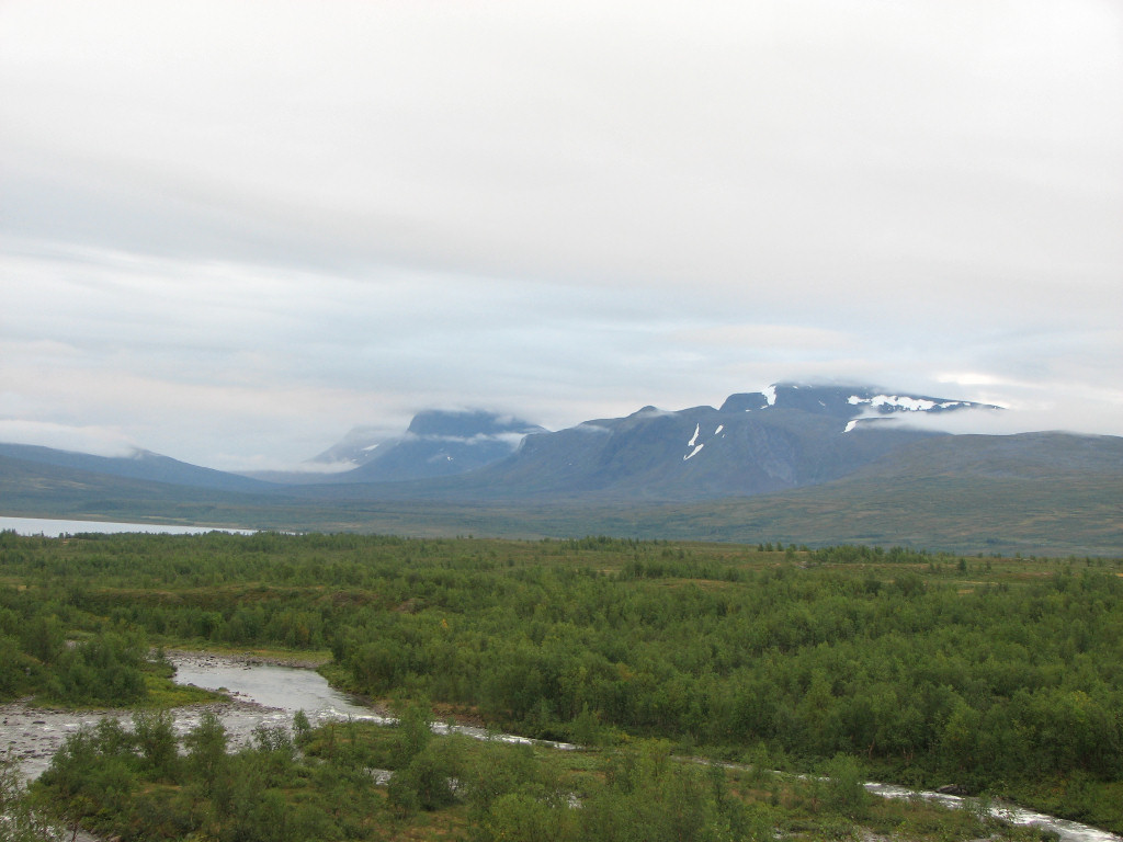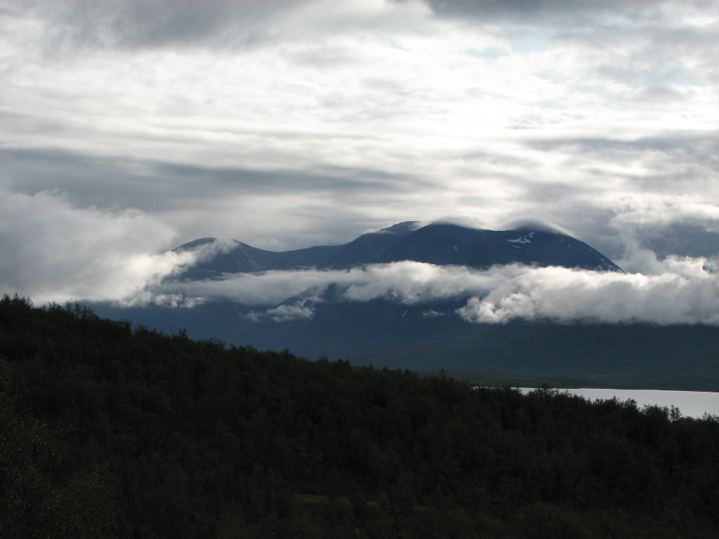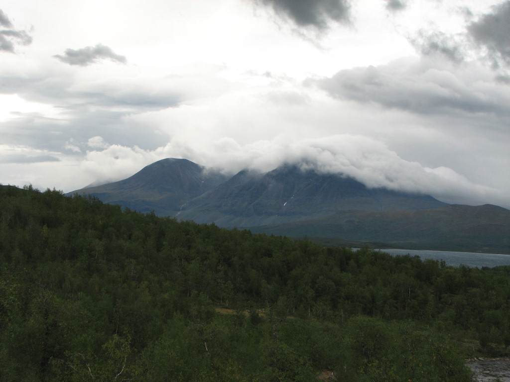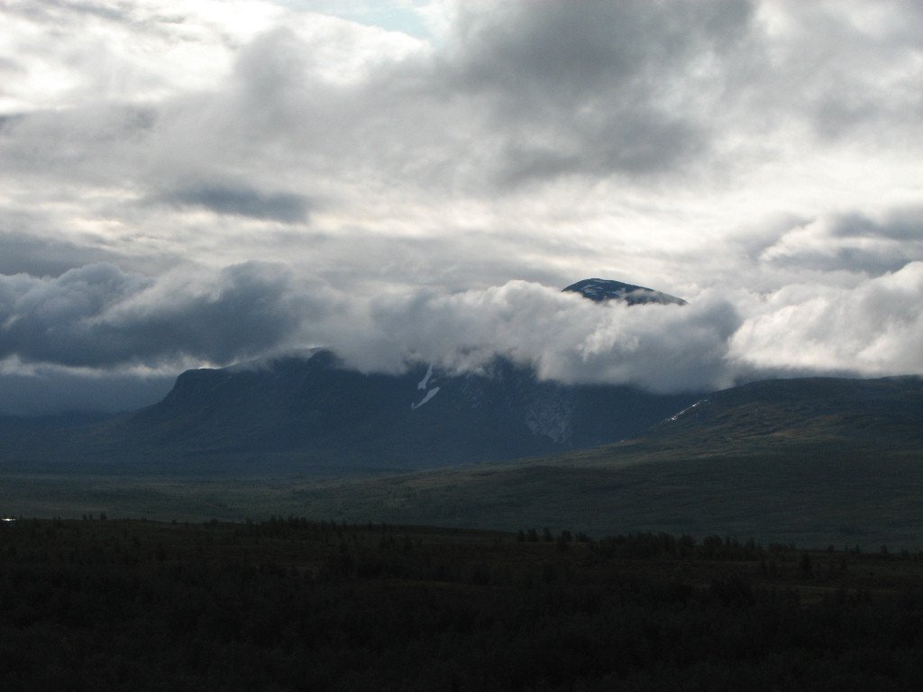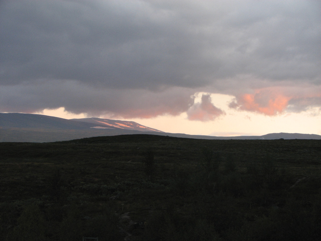 Now it was time for everyone to prepare food, and I ate to Finnkampen. The clouds were breaking apart anew, but another large and dense bank was waiting in the southwest. As the evening went on this bank seemed to pass west of our location, but in the end it came anyway, starting its work by pulling a haze in front of Máhttoajvve. I followed the Finnkampen broadcast to its end and then went in to the Norwegian for payment and talk, and we continued to discuss this and that while we waited for his roommate the bus-bound Swede to return inside. A good long talk with the others followed, and a light rain fed by a stronger one in the Swan valley passed by. As I was going to bed at 22 it was almost still and rather cloudy, but the rain had stopped.