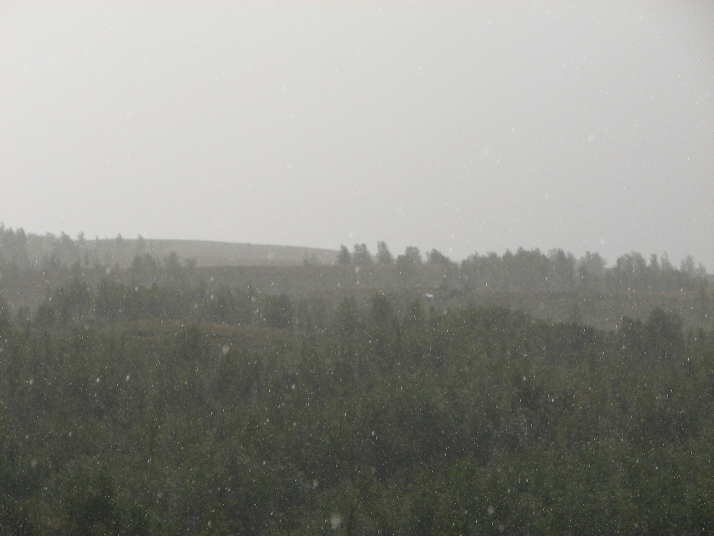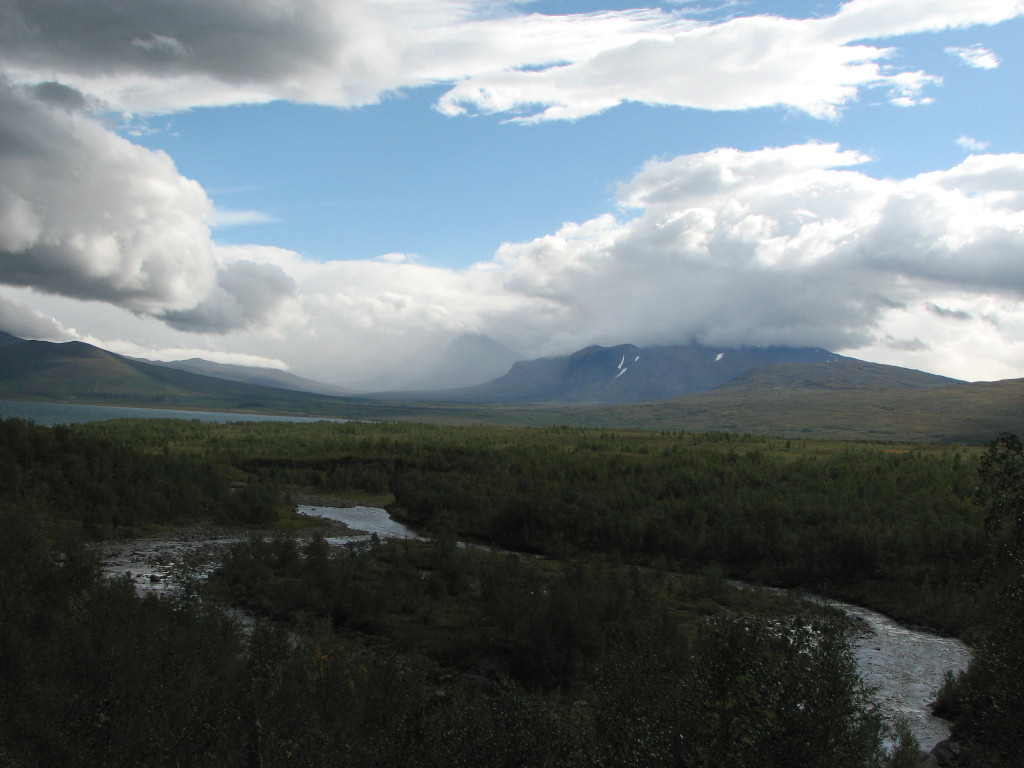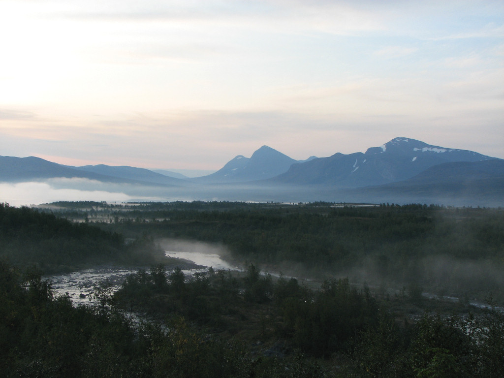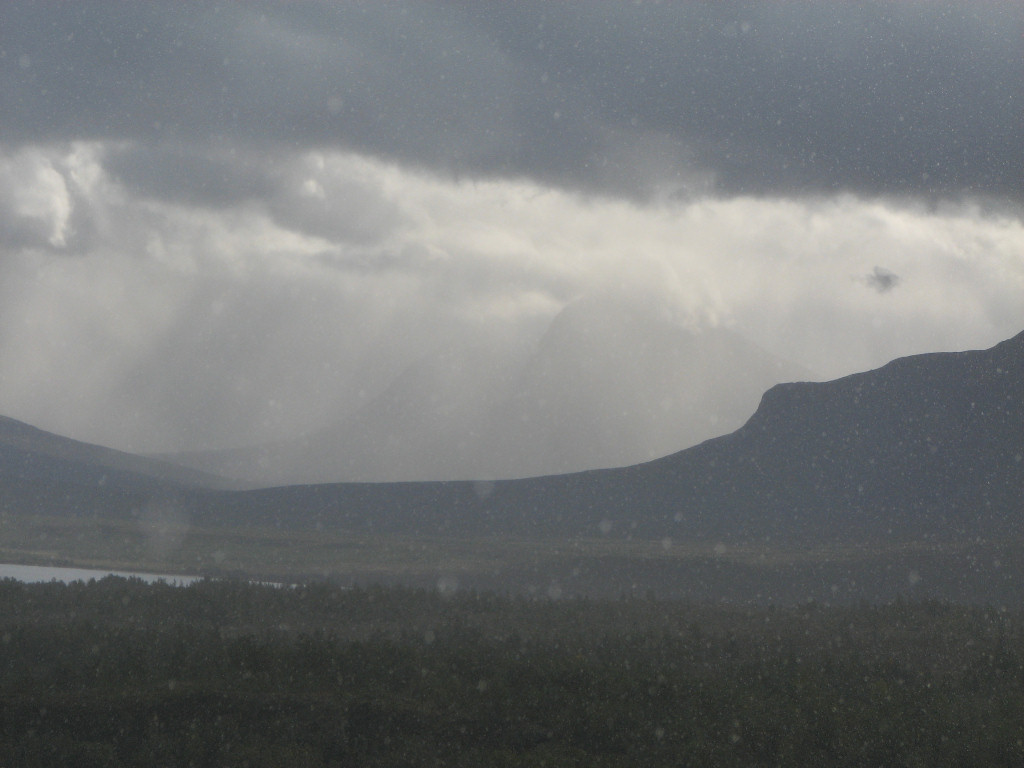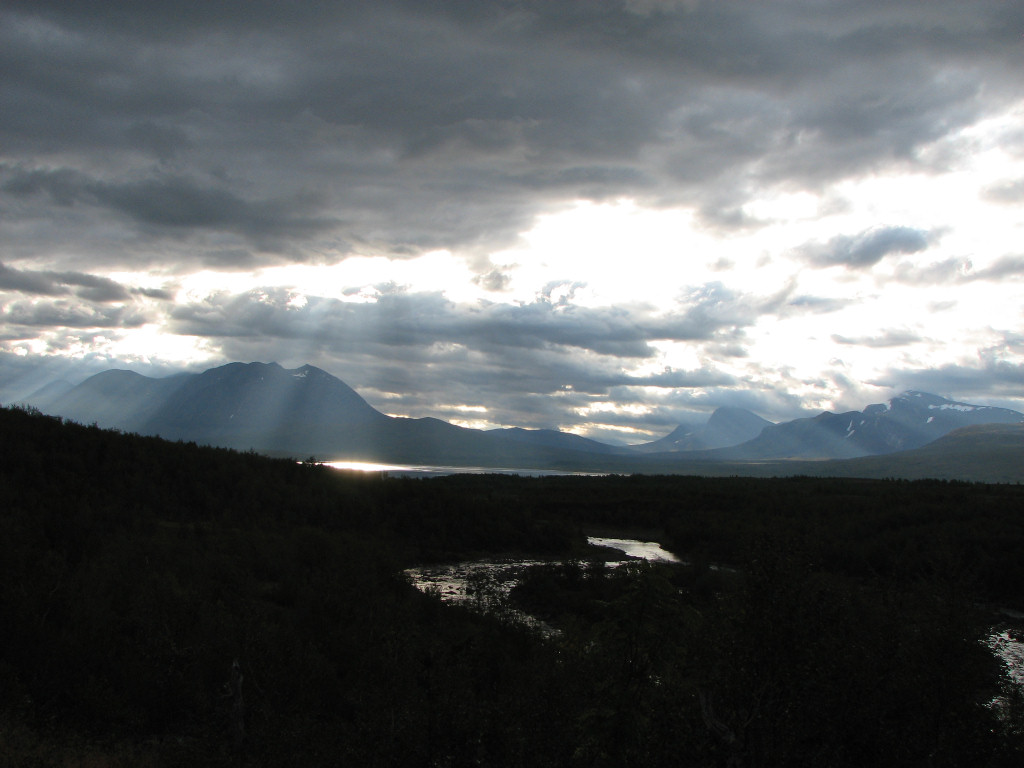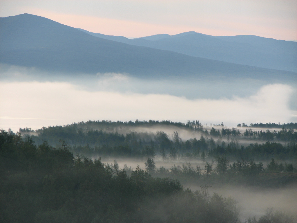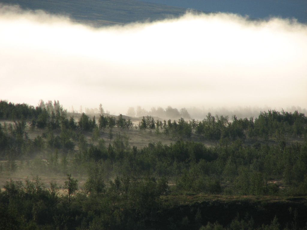 Now it was time for everyone to prepare food, and I ate to Finnkampen. The clouds were breaking apart anew, but another large and dense bank was waiting in the southwest. As the evening went on this bank seemed to pass west of our location, but in the end it came anyway, starting its work by pulling a haze in front of Máhttoajvve. I followed the Finnkampen broadcast to its end and then went in to the Norwegian for payment and talk, and we continued to discuss this and that while we waited for his roommate the bus-bound Swede to return inside. A good long talk with the others followed, and a light rain fed by a stronger one in the Swan valley passed by. As I was going to bed at 22 it was almost still and rather cloudy, but the rain had stopped.