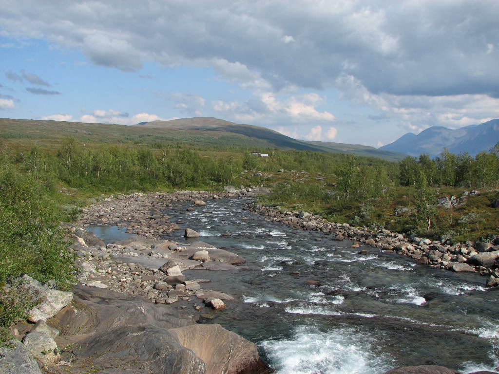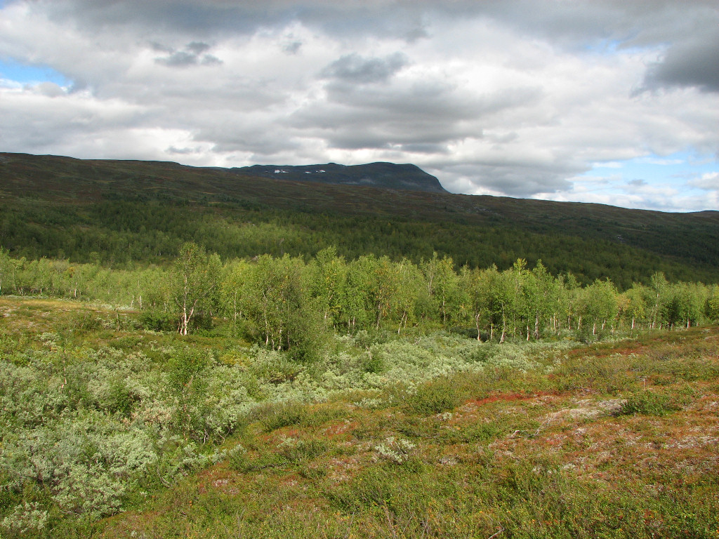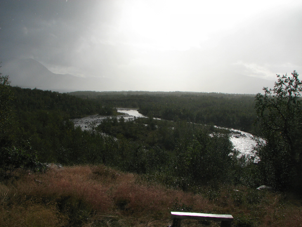 When I was ready to start the wash proper the sun had come out, and I did the whole thing out on the porch while the clouds amassed anew. Rinsing took place below the bridge, where I used to brush my teeth, and then I hanged everything (save the toothbrush...) on the outdoor clothesline. When I was done a German guy came walking from the north, and since he was going to Kvikkjokk I seized the opportunity to have him deliver the Låddejåkkå letters. While he took a break I went down to the lower bath place to collect some stones I needed to adjust the bench's padding, and walking down through the forest I distinctly felt the advent of autumn. I then spent some quiet time with the radio, and shortly after noon I set out for another lunch tour.