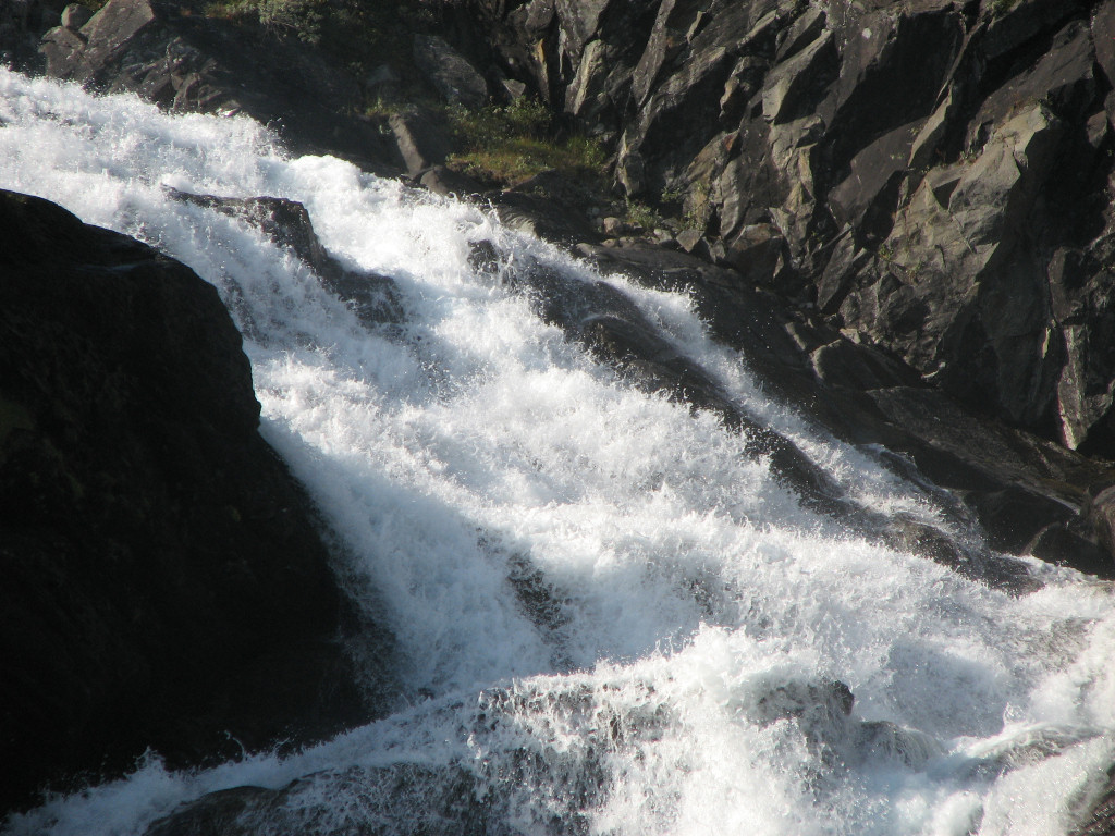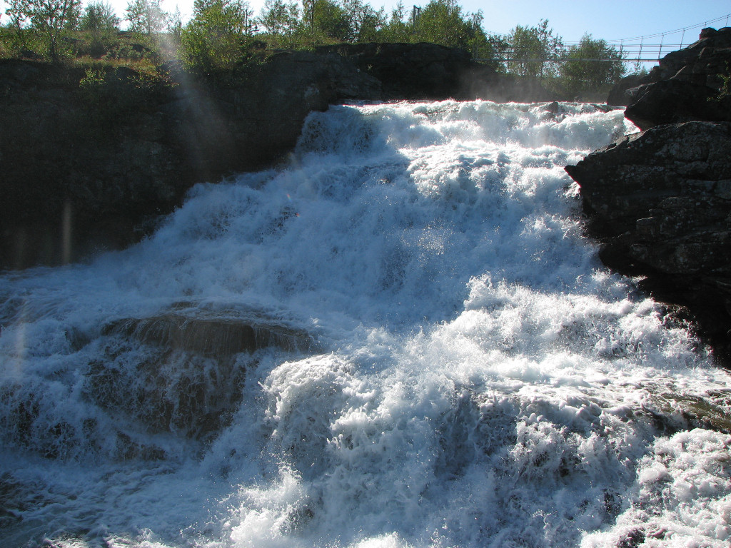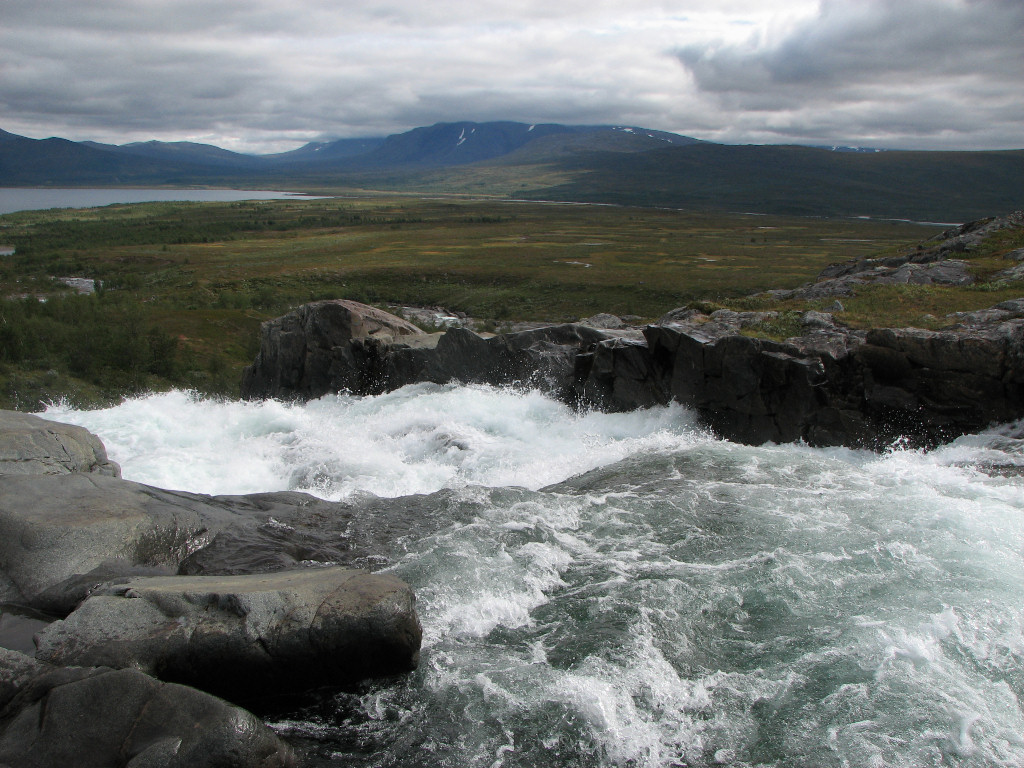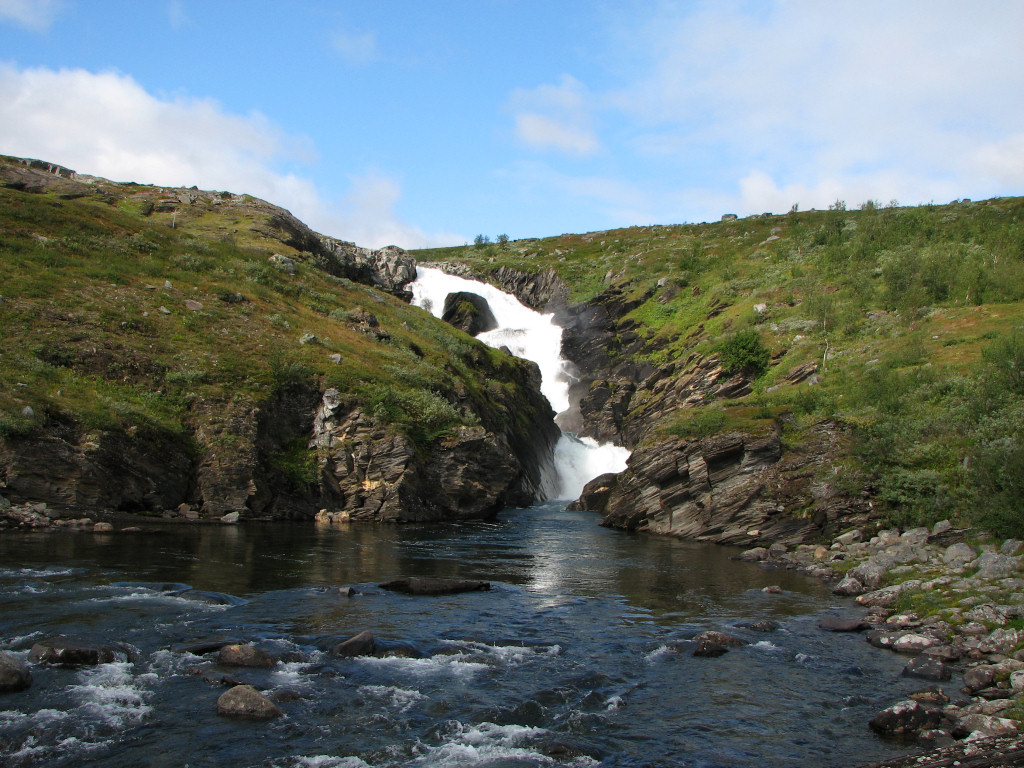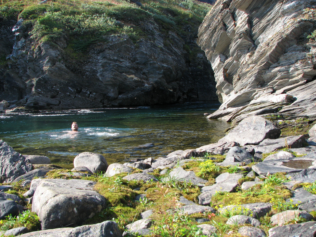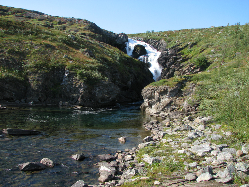I then sat down on the heath with a full view of the fall, soon lying down to read in the sun. I sat still for quite some time, taking in the scene – right from the start I had associated its setup (waterfall, canyon, pool, lush slopes) with a tropical island or suchlike, and since both the STF buildings and the Sámi ones as well as Padjelantaleden itself were hidden from view it was not hard to imagine myself far away from, well, everything. I walked over to the bathing place to check it out more closely, and liking what I saw I went back to get the towel that I had brought; this would probably be the best opportunity to try it out.