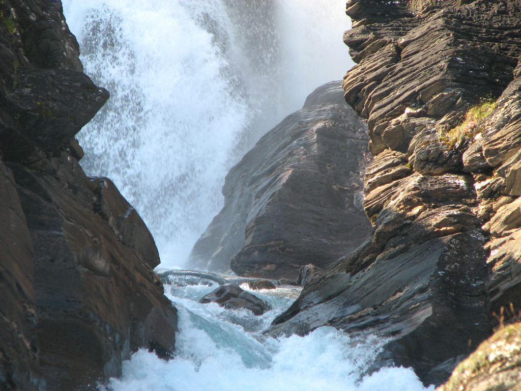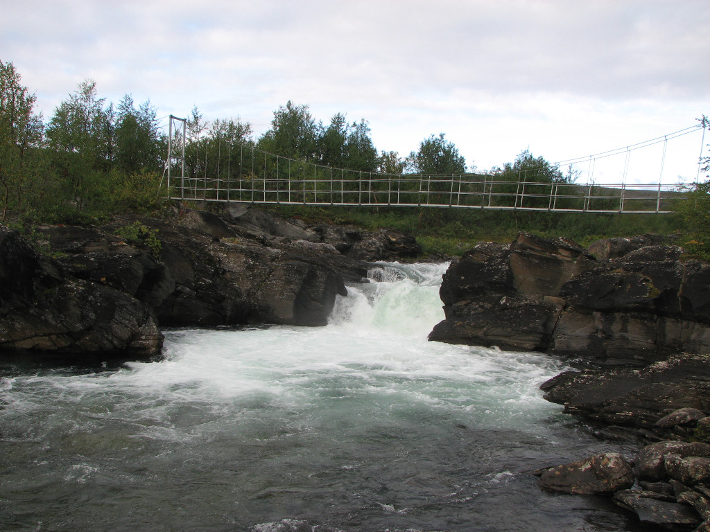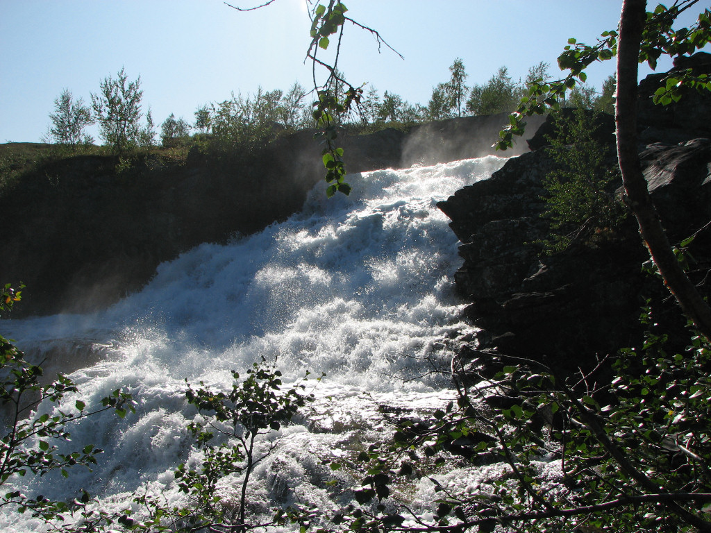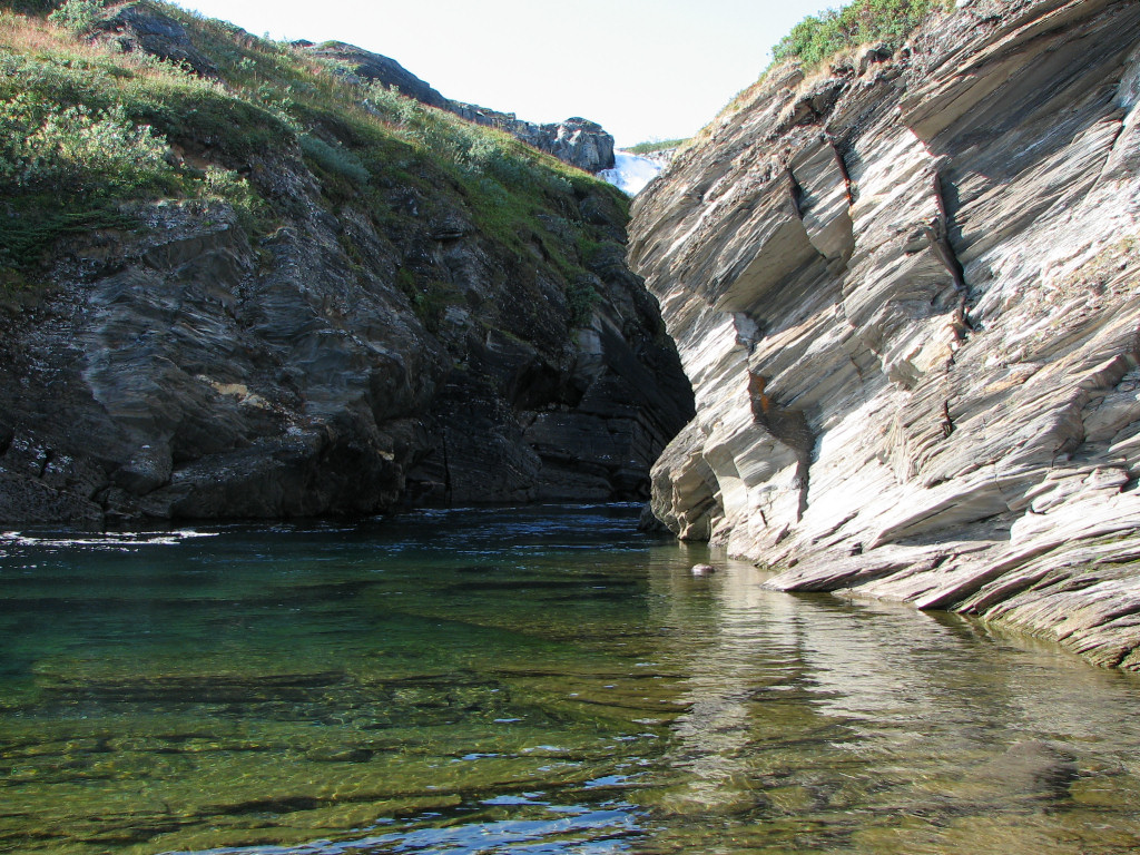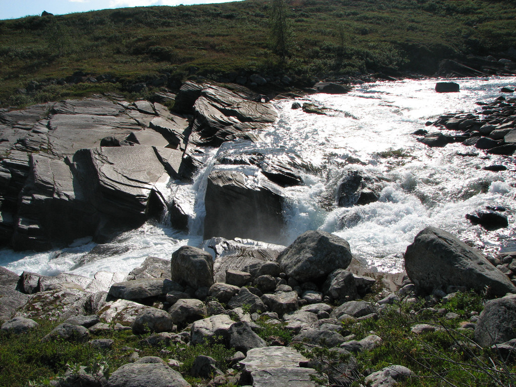 Once there I sat down with my back against the blessedly cool cliff, and a bit of wind combined with some soft spray from the fall perfectly matched the sun. During the course of the lunch I still had to remove my shirt due to the heat, and after reading some more I lay down to bask for a while. After spending an hour mostly hidden from view in this way I returned up to the cottage, which had seen no visits in the meantime, and the room containing the stove had cooled off well. I rearranged my pack and then set off again, heading up to The Spot, which I have given the informal name Ruovdásjvuolle – the place beneath the canyon.