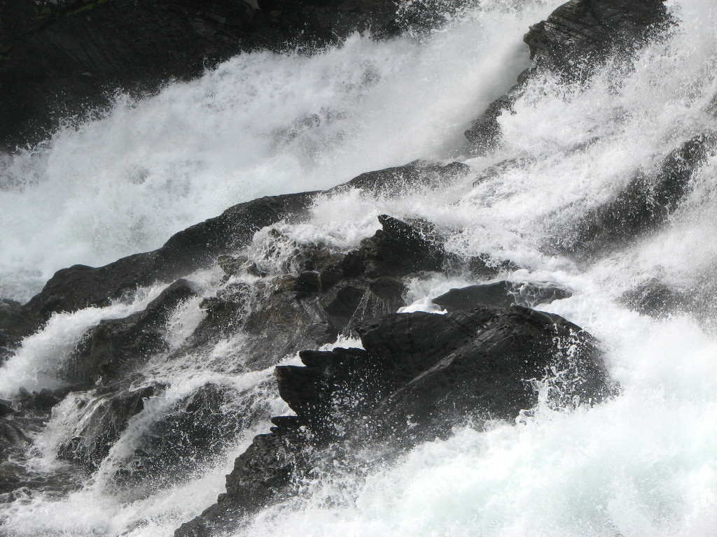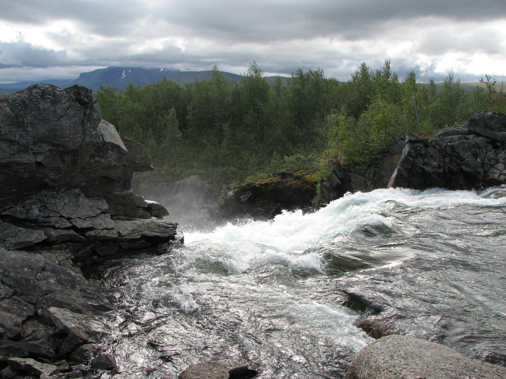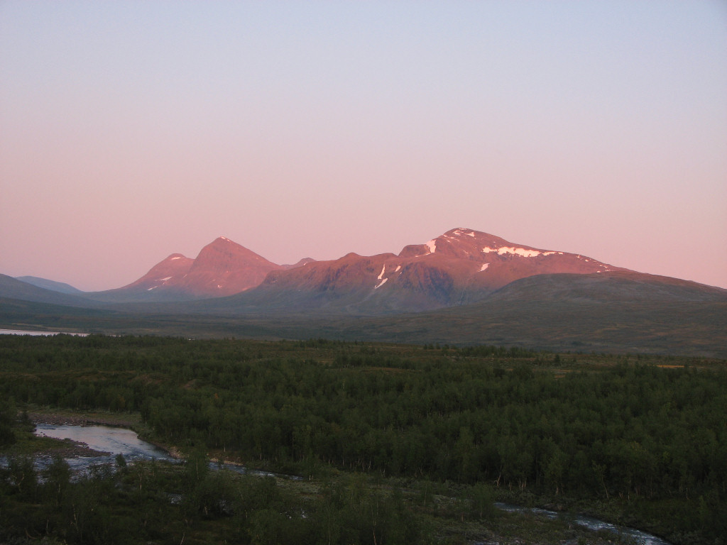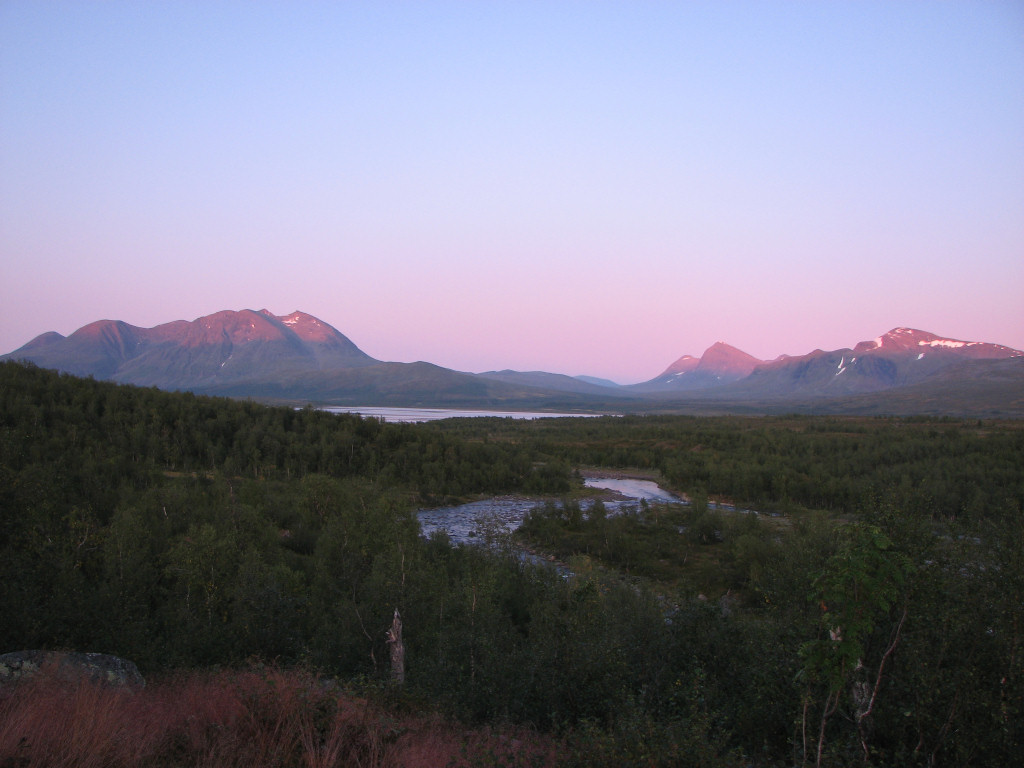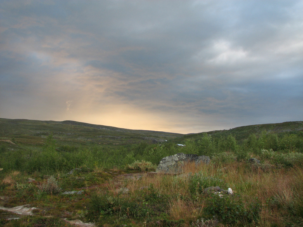 When I went over to the Swedish guests I was surprised to discover that another girl had arrived; she was known to them from Vaisaluokta, but had managed to sneak in without my noticing. I talked some with the assembled people and then stood outside with some others, enjoying the beautiful evening. As I went down to the stream after the evening snack I observed that the water had already started to recede. It was a perfect time for long-exposure photography, and obviously the girl had had the same idea for she sat on a cliff further downstream wielding a camera. Other people had contented themselves with sitting on the porch wrapped in duvets, and on the western sky there was a fascinating light. It was getting chillier but just the same I decided to leave the still damp clothes outside, crawling into my warm bed after 22.