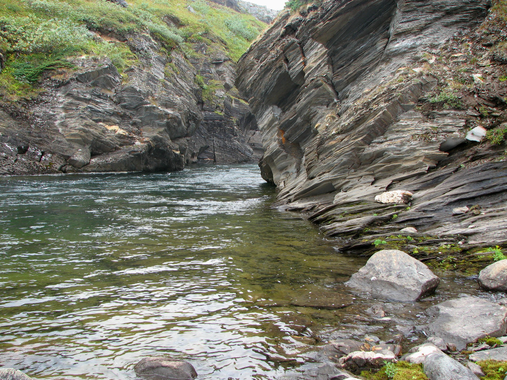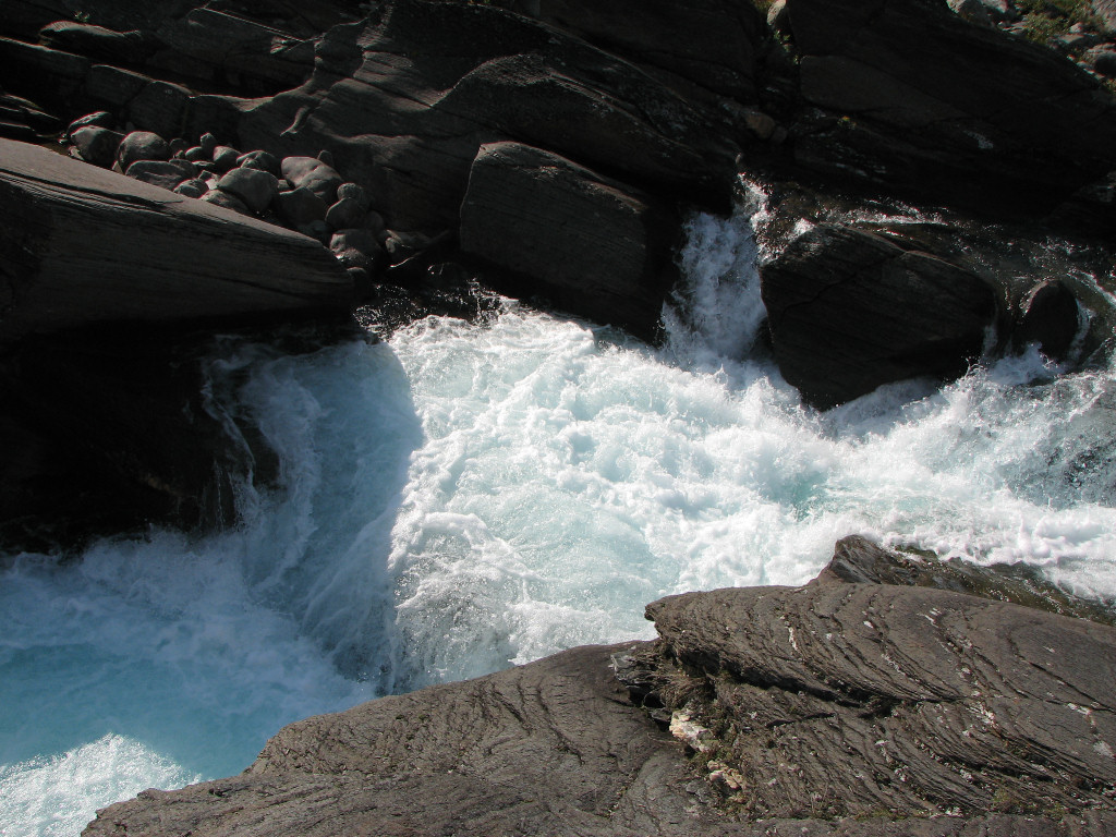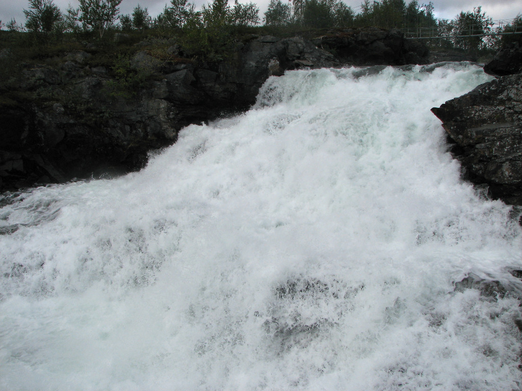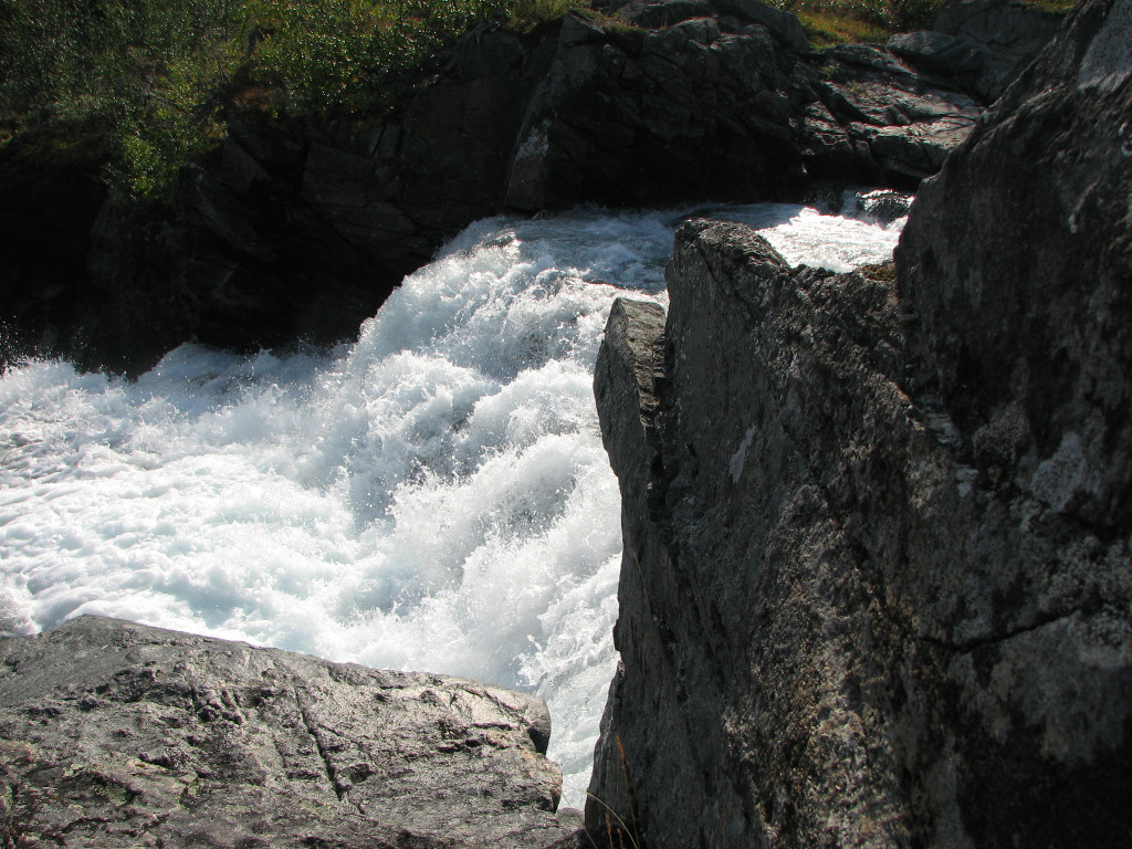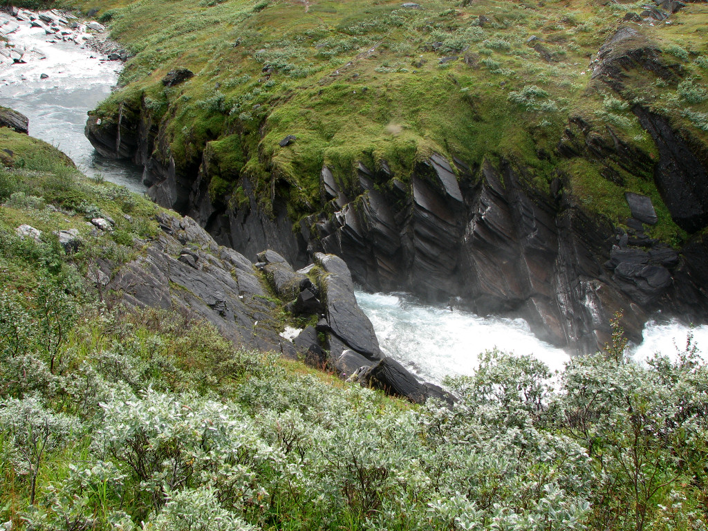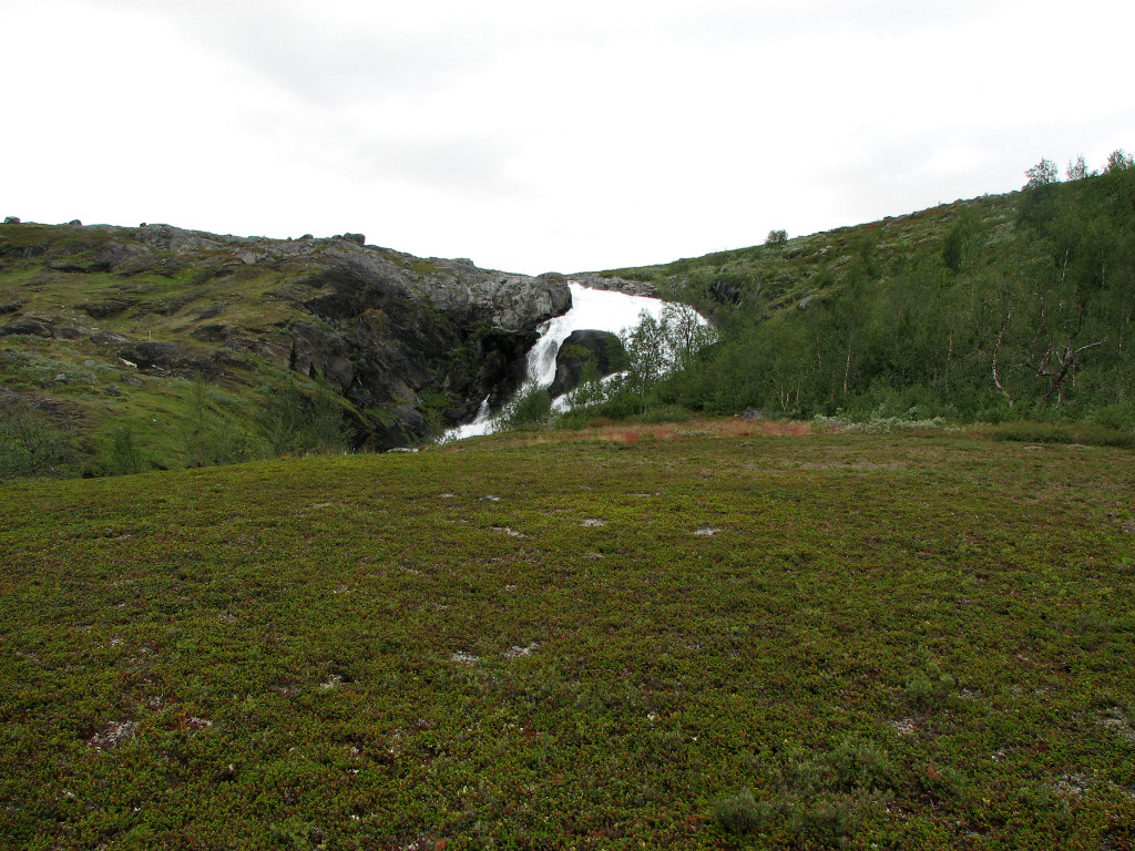 When I left I made my way up a blueberry-ridden slope beside the canyon, munching as I climbed, and then came upon a small path which I followed for a bit. Then I scrambled up a steeper section to another path – clearly of reindeer make – and kept on it until I reached the head of the waterfall. A short bit upstream there were more smooth rocks and a few nice bathing places, but I was not in the mood to try them out.