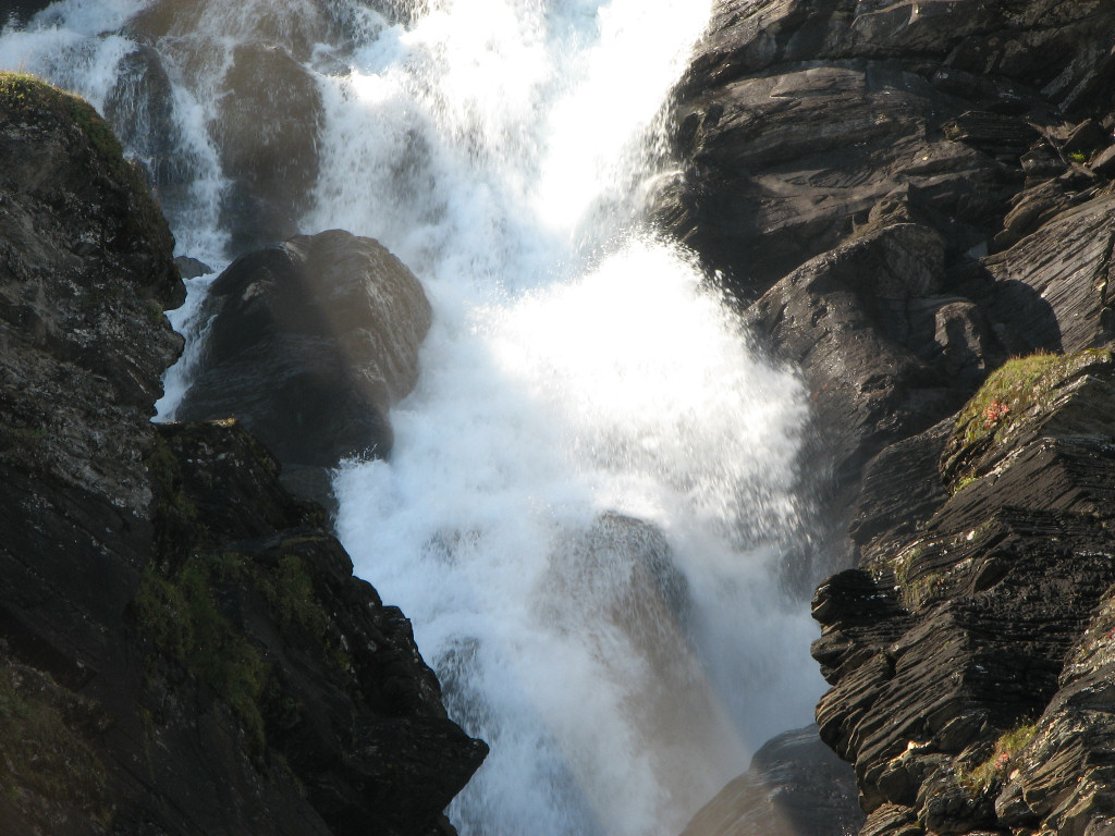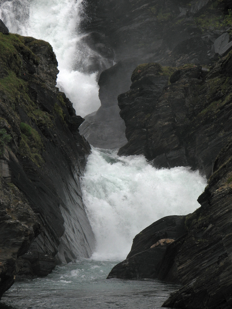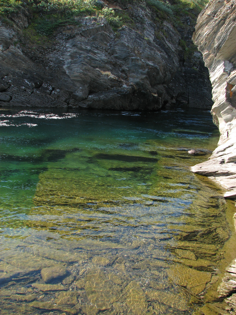 It was indeed a terrific place for a dip, and the current was weak enough that if one wanted one could well swim upstream a little ways through the canyon, further exploiting the strong illusion of a secret place. The only drawback was in getting up, as there were large, slanting rocks on the bottom, but no worries. The little "beach" was also perfectly located, being sheltered beneath a cliff, and it only took moments for me to get warm and dry. I jumped back in for a longer time, floating right at the end of the canyon, with the roar of the fall just above. I have seen some mighty fine places on my journeys, but this one was more special than most, and I was tremendously happy to have stumbled upon it.