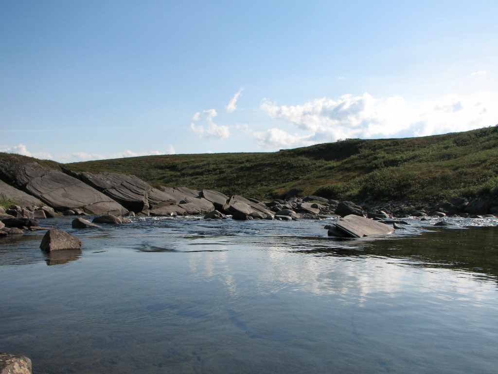 After the reindeer-watching hut I took a lower path until the wetness of the ground made me break off somewhat; I was wearing the sandals but no socks, so getting wet was not really that much of an issue, but I still wanted to see if it was possible to reach my destination in dry condition. I passed through some thickets and came out to the stream, where I found the other little path, and then went out onto the curiously layered, slanting rocks at the outflow of the calm section.