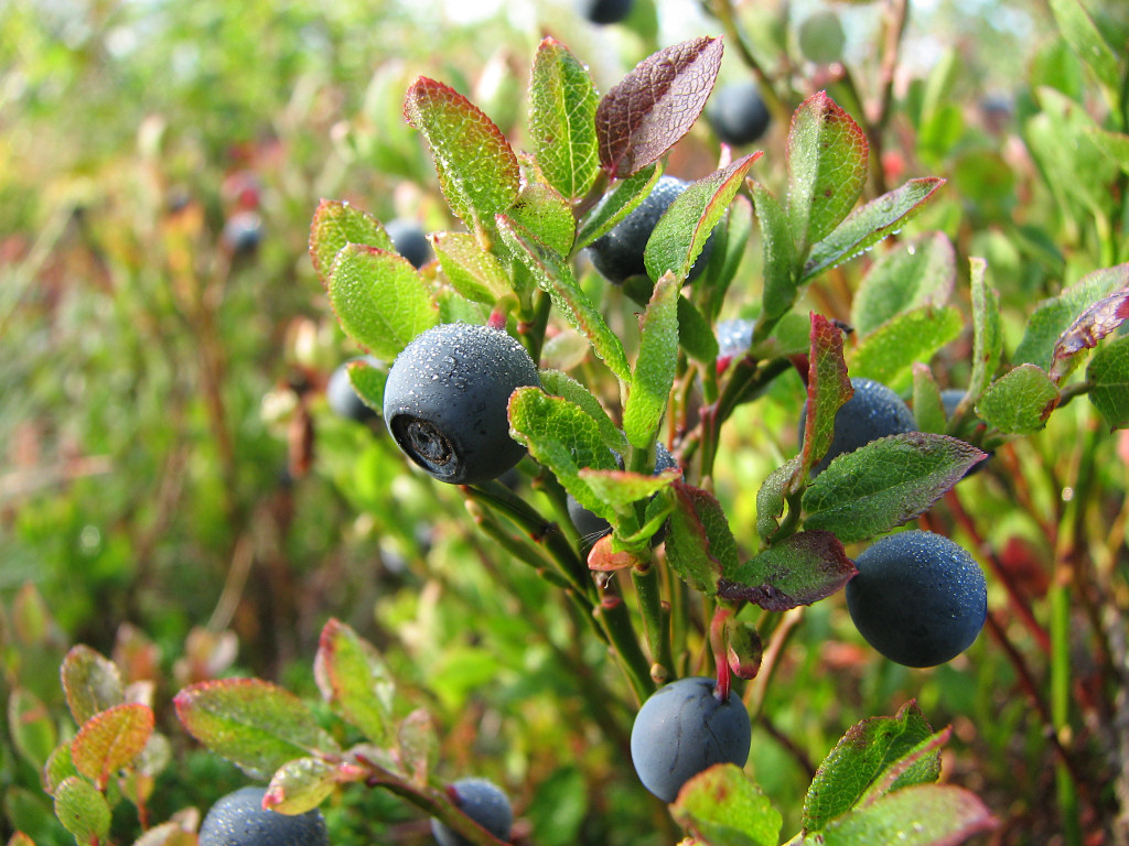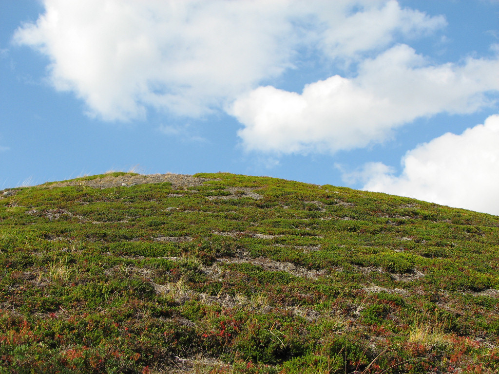 In the afternoon the clouds broke apart more but it had grown rather windy instead. After playing some solitaire I went out for a round of berry-picking, breaking off the southbound trail after the first duckboards, heading to the cloudberry spot I had discovered previously. Here I took off my fleece jacket and started picking; the first patch was almost past its due date, but then I hit better ground. However, as the berry supply increased so did the insects, and I applied repellant against the latter.