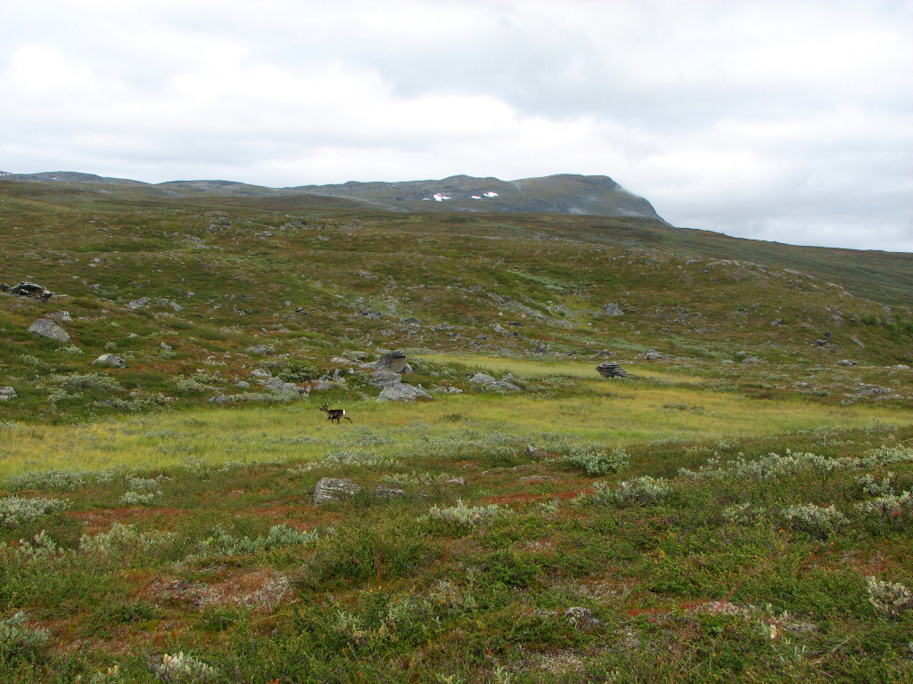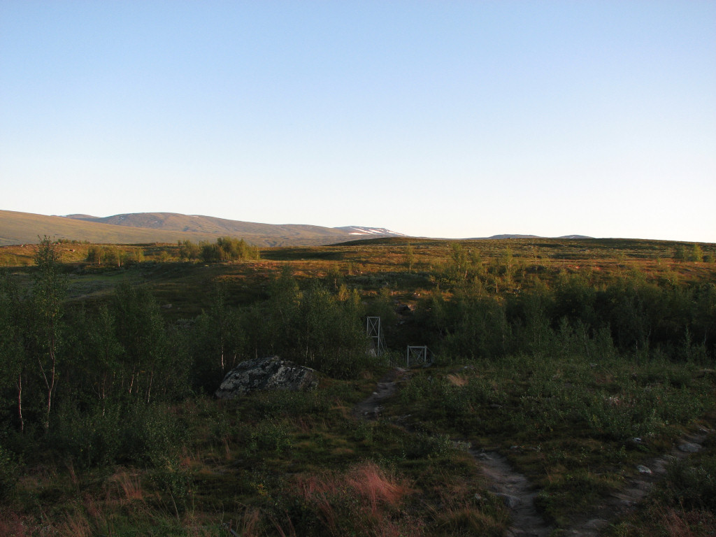 I came to a low plateau where another reindeer path took by, but I turned right when it hit the first osier thickets, walking through some lower shrubs until I reached the start of a miniature vale containing a brook running north of the rise I had scaled on my last lunch outing. Here there were more bushes but progress was not difficult, and more reindeer paths simplified matters. There were, however, some insects to fend off, and they increased much in number when I came down onto level(ish) ground. There was no wind at first, but when it finally came it took the flies with it. They returned when I came onto the side path above the privy, though, but vanished again as soon as I walked onto the "yard" after 14.