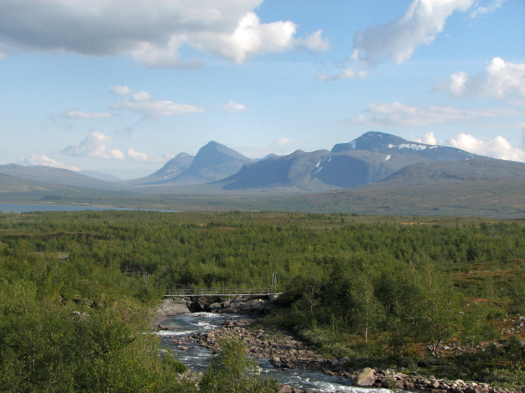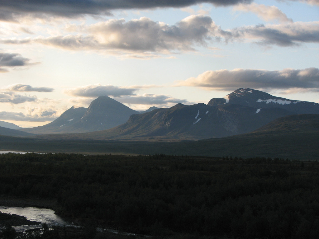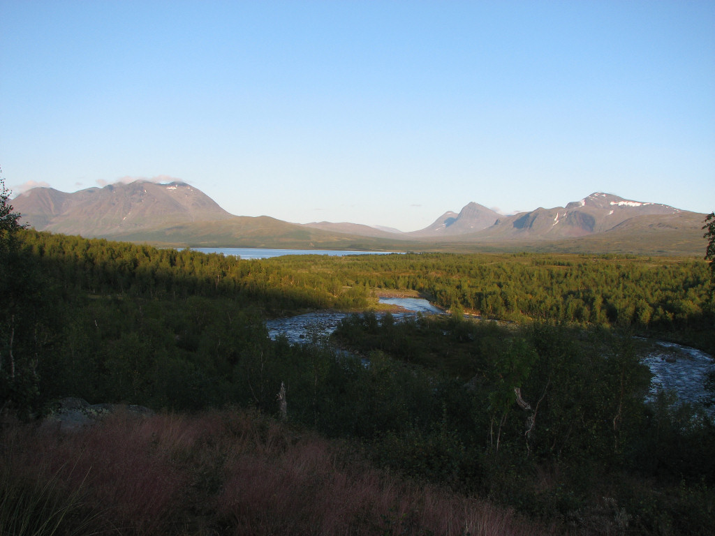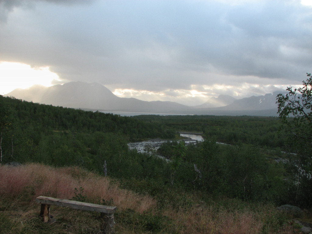 The place was empty, but soon enough two Germans-who-were-actually-Swiss came. I had a small snack and then rested with the radio, feeling tired, and when the sun reappeared I went out to my new bench and had another light snack. The Swiss also exited and walked off in the direction of the fall, upon which a lone hiker came from Vaisaluokta. Said hiker also soon went out again, and was in turn replaced but yet another arrival from Låddejåkkå, followed by two more from the opposite direction. Also the second loner took off for the fall, while the first returned and sat down to read instead. There were four more arrivals, and the two people who had just come went on their way, so the guest count settled on eight. In the evening the sky cleared almost entirely, but a few light clouds lingered among the eastern peaks.