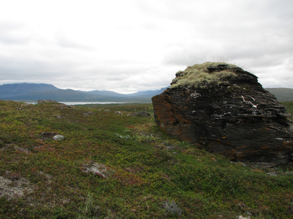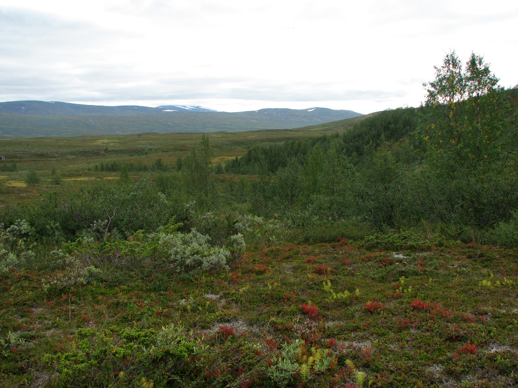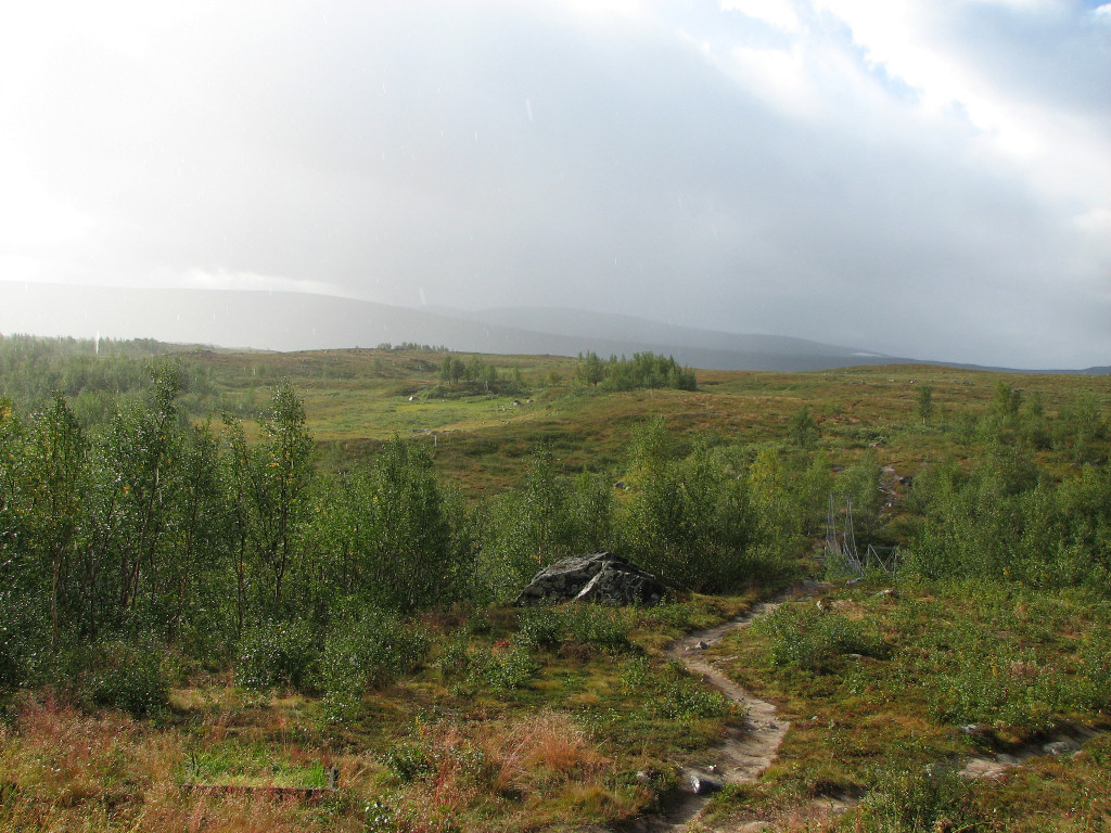 I awoke early again and noted a chilling, somewhat strong southeasterly wind blowing underneath an extensive cloud cover. After sleeping some more I arose to approaching rain, but in general the weather seemed to be improving slowly. When the foursome were about to leave I discovered a LED headband and a pair of glasses on a bed shelf, for which their owner was much thankful. The other Swede had left early, so now only the Norwegian remained, and we entered into a discussion of fjeld weather before I sat down for breakfast. It was raining over at the higher places, but at Kutjaure there was but an intermittent drizzle, which a bit later turned into sun-rain. This all moved off to the southwest before long, as did the Norwegian. Myself, I wanted to do another fishing tour, regardless of the broken rod, and went out for that purpose after 10.