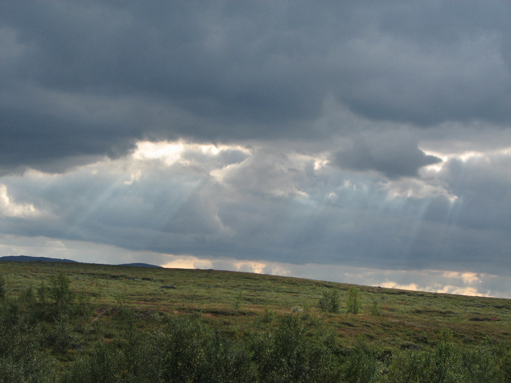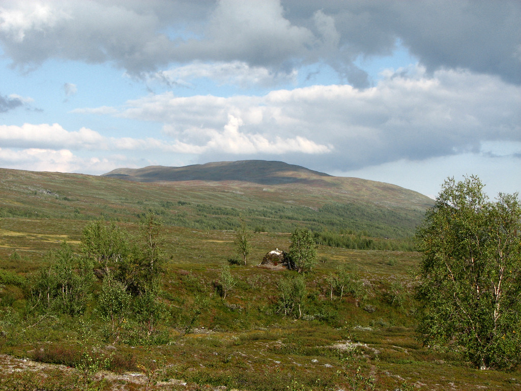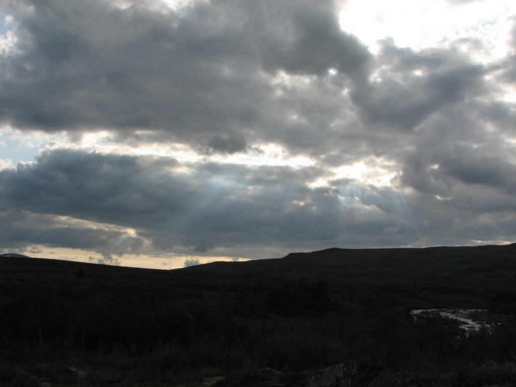 In the early morning it was overcast and somewhat low, and after I had arisen later on it was also windy with drops in the air. The Norwegian woman left around 07:30, and after the others had gone not soon thereafter I went back to bed for another hour. I had cloudberries with my breakfast and then set about doing various indoor tasks, while the wind increased outside. Eventually it grow lighter and a patch of blue appeared above to the south/southwest, but at the same rain moved out of Ruohtesvágge. I read some in a magazine I found in a drawer, and as I did so the clouds split apart and revealed the sun.
