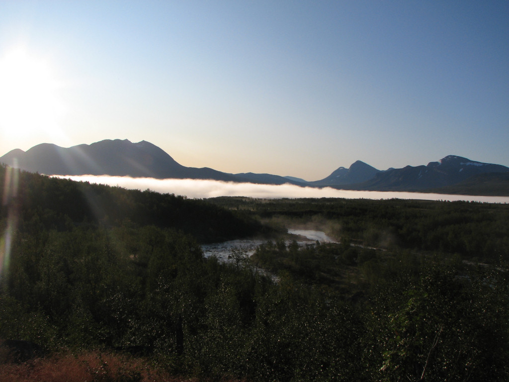 Sticking my nose out at 06:00 I discovered yet another still, beautiful morning with fog upon the lowlands, and the sun was hidden in a thick veil. Since I was still feeling tired I got back to bed, where I remained until all the morning forecasts had passed. I ate and then went over to the women, giving them some advice about where and how to go for a day tour, and because they had forgotten their map in Låddejåkkå I lent them one of the cottage's maps. The sun was growing in power, and when they left for a visit to the waterfall (and beyond) the sky was almost clear. As for me, I needed to bake more bread, and while the dough rose I cut some firewood as I intended to make use of the iron stove this time. After forming rolls I fired up said stove and then read some in another book until it was time to put in the goods. I also wanted to take the opportunity to bake a cake, so while the first batch was in I mixed the batter.