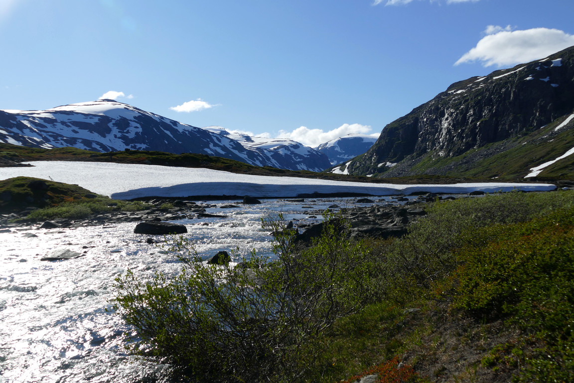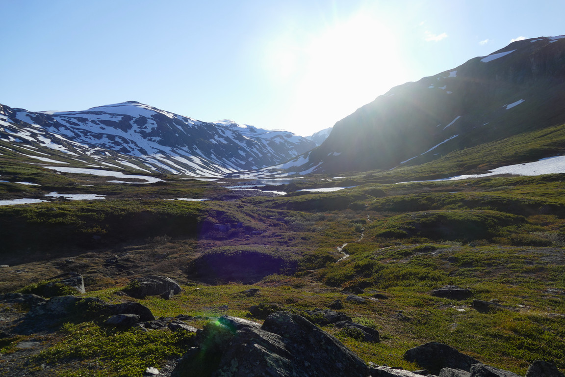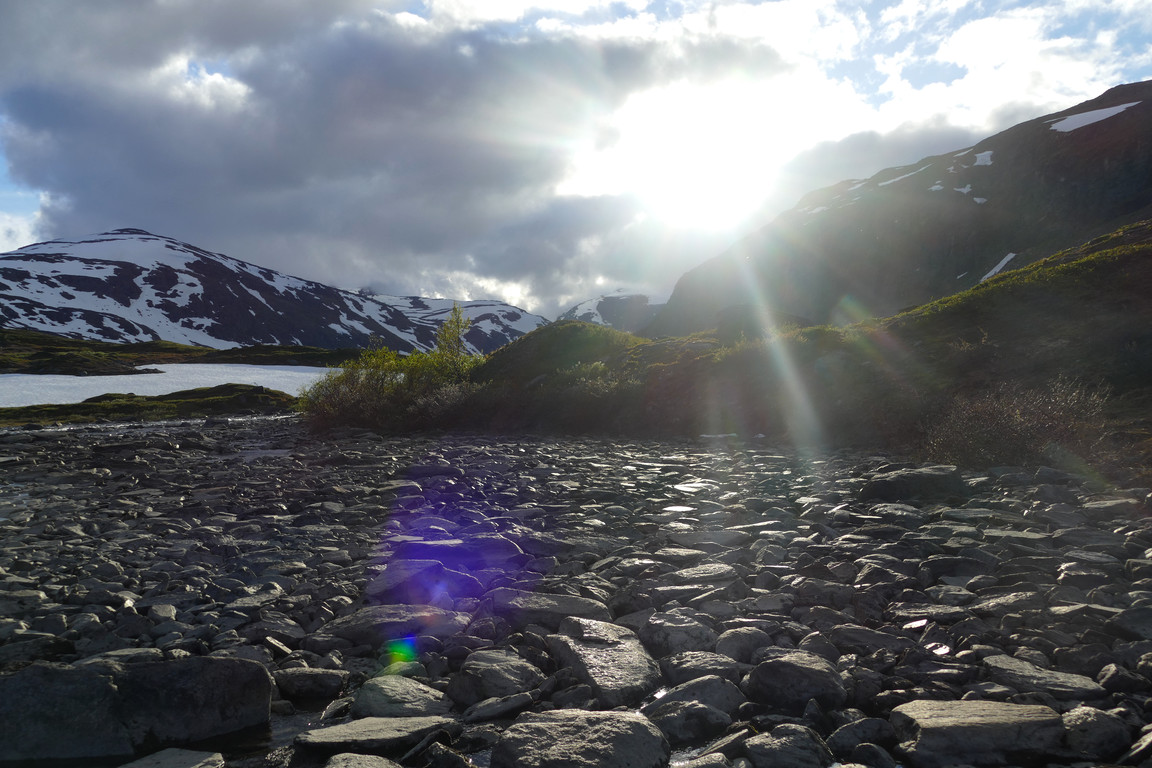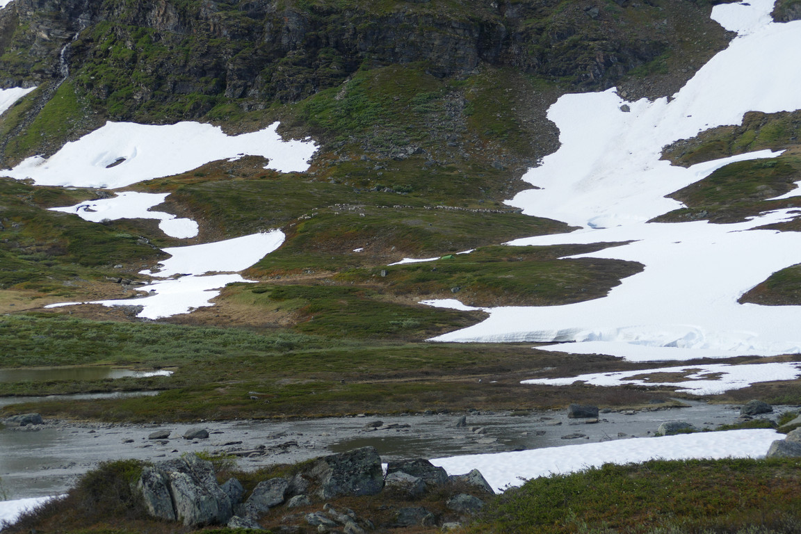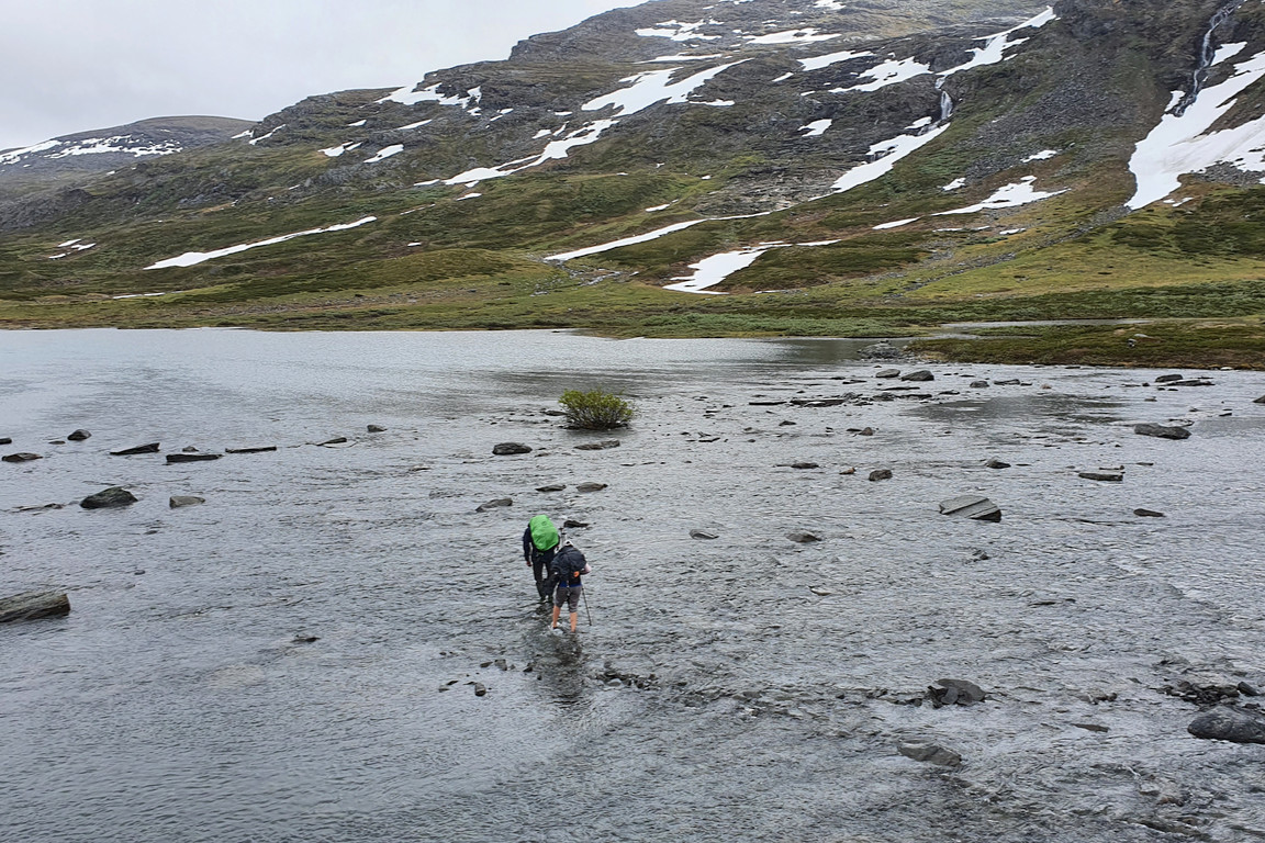 After lunch it was sunnier, but still rather windy. Having completed the baking session, which took some time due to several dough rise waits, I went for a short walk. Things were indeed looking up, but there was no real warmth in the air – and especially not in the wind. After dinner I had to go fetch more people upstream who were attempting to ford in the strong and deep current, one of whom was reluctant to acquiesce before he lost one of his slippers to the unheeding waters. This group consisted of four young guys who had their sights set on Låktatjåkka, but upon hearing about current conditions (including temperatures and opening hours) they decided to stay here in the valley and went in search of nearby campsites.