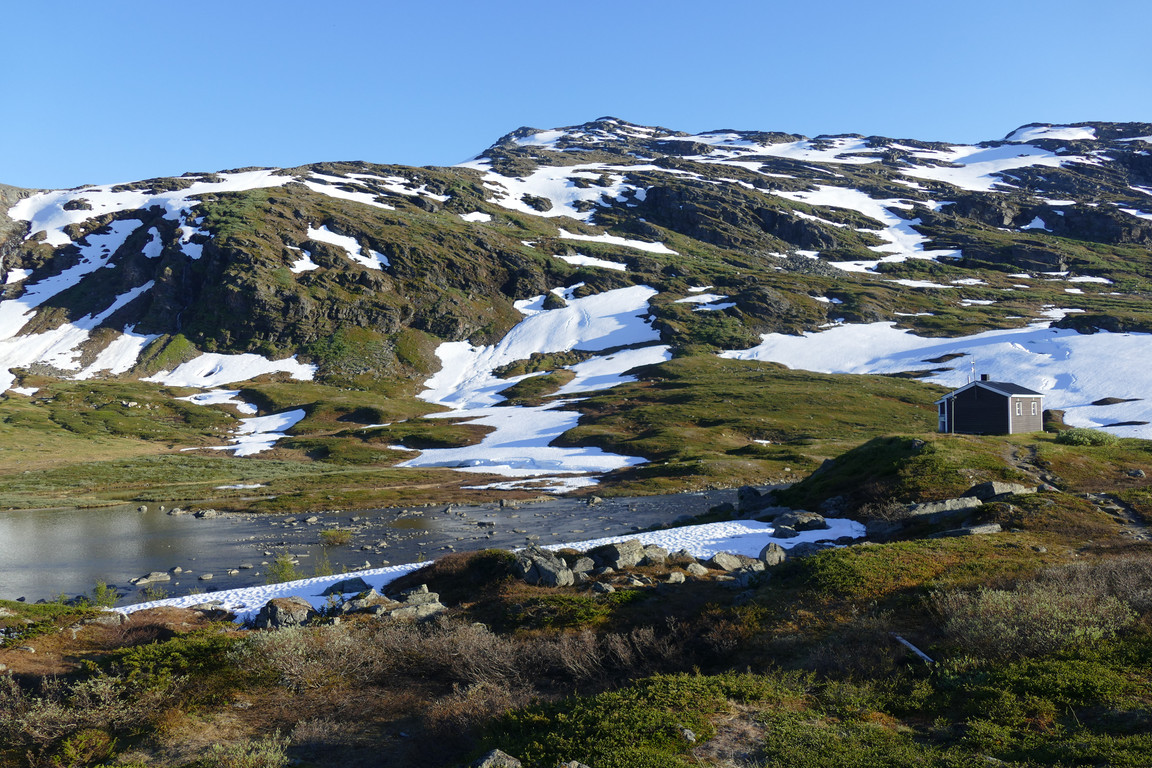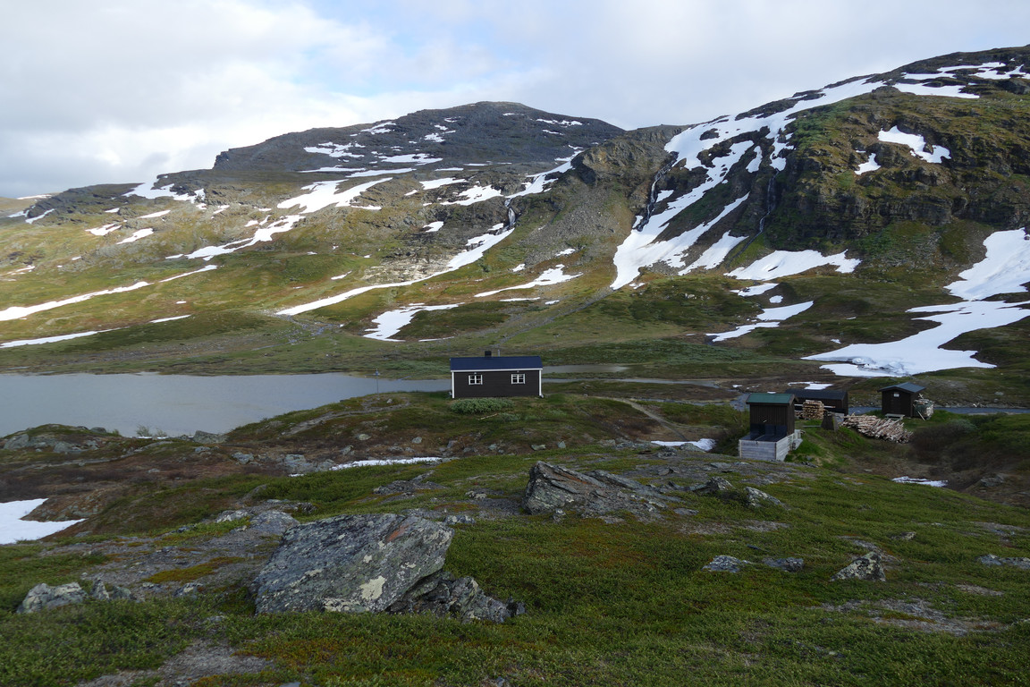 As I was having a very nice char dinner three new cottage dwellers came, followed by two Finns who had braved quarantine and were quite happy to put up their tent some distance away from everyone else. I finished eating, including a dessert, and saved the last bit of fish for breakfast. A family with two children then arrived who would also be staying inside, so now both rooms were in use again. Having settled everyone I walked around a bit myself, noting that the four guys were still camped among the hills, and as I turned in around 22 it was back to cloudy.