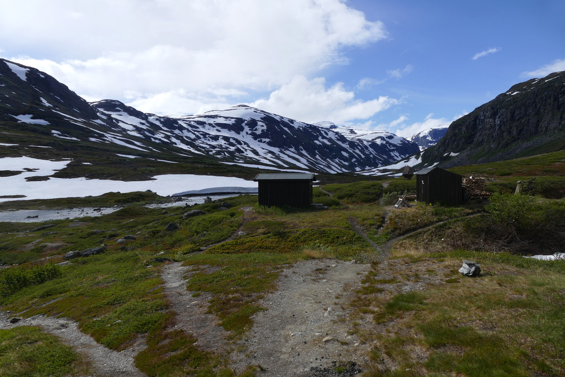 It was a rainy night, but when I got up in the morning it had stopped. The trio left fairly early and made me aware of a nightly visit by a wet tenter, but there was neither anyone extra inside nor an extra tent nearby now. A helicopter was making several landing runs to the topmost visible part of the Abiskojaure route, for reasons unknown, but eventually it continued on over the ridge southwards. Suddenly I noticed that the woodshed door was ajar, and going over to close it I discovered that that wet tenter had taken up residence inside, but as he looked fast asleep and no one was in need of firewood at the moment I let him be for now.