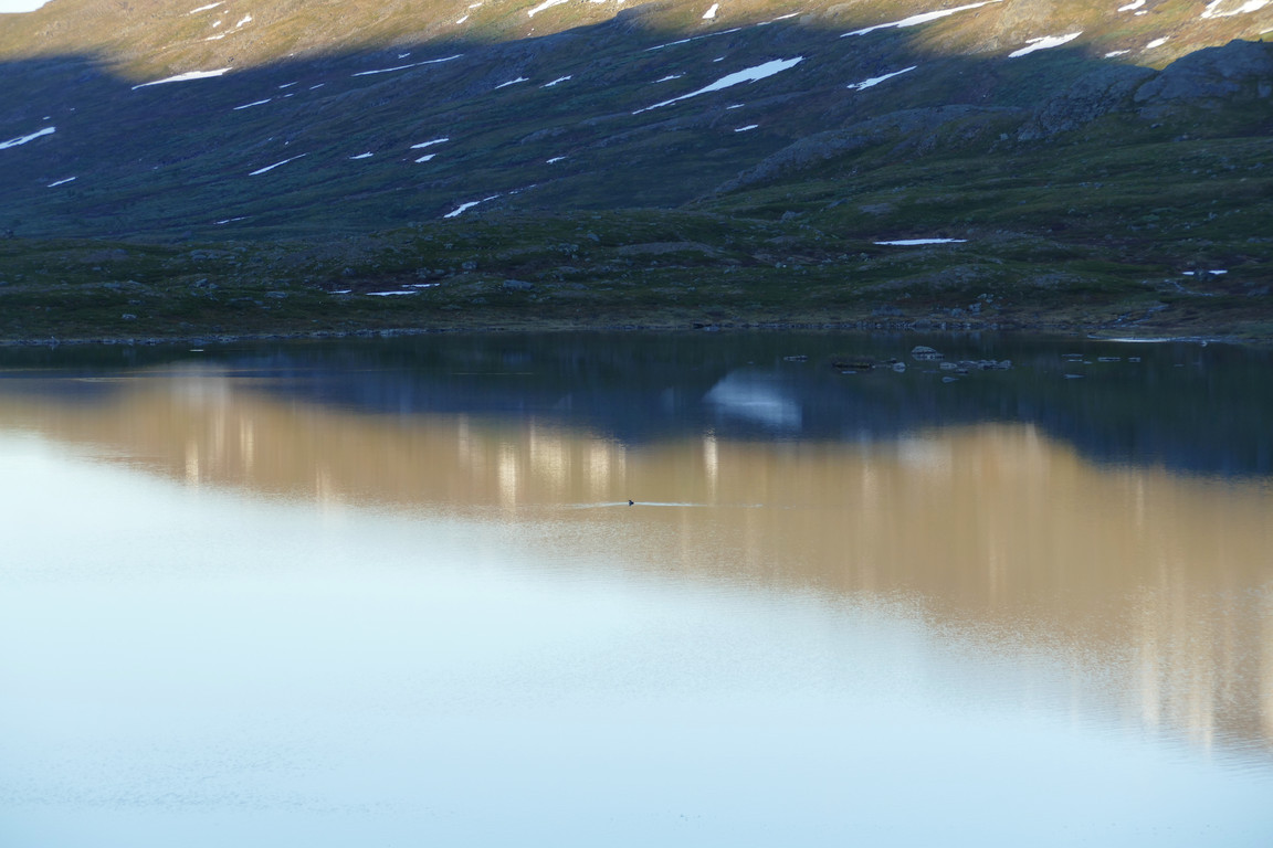 As I was having dinner two people walked down from Abiskojaure, and this time they took the correct route. They took quite a long time finishing up, and when they finally came up onto the hill I learnt that they were also campers who were headed for Abisko, but for now saught a campsite close by westwards. Later in the evening the two scientists from before came at last, and soon yet another pair from Abiskojaure took the ford, nearly falling in due to a suboptimal choice of heading through the deeper parts. Once across they chose to have a late dinner next to the old warden's cottage before heading downstream. I had a photo visit by a quartet who had taken up camping position on the larger headland in the lake, and after saying goodnight to the tripod guys I went to bed at 22:15.