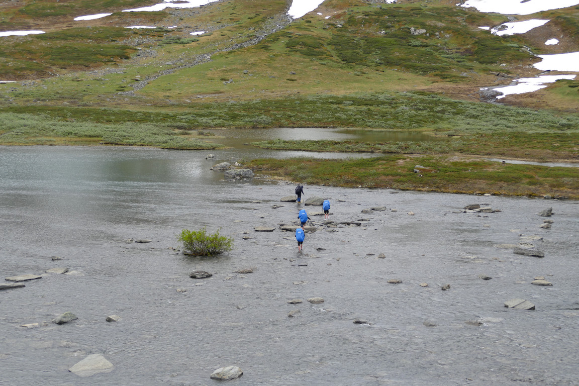 Since they still hadn't appeared at the ford when I was done I went over to check, and discovered that they were just about to try the crossing in the rapids upstream, which is the worst place to do so, so I approached on my side of the stream and signed for them to go downwards. Once in the right place they crossed wearing light, low shoes which would never have kept them dry even late in the season, at first attempting to jump on the exposed rocks but in the end they just splashed through the shallow water. The group turned out to consist of a Danish father with his two sons, and I found his dialect (but not theirs) to be of the more understandable kind. They had been on a long tour through Lapporten and the Mårma pass, where there had been a lot of snow, and they now wanted to stay the night, but since they had no reservation I bade them to wait until later in the evening.