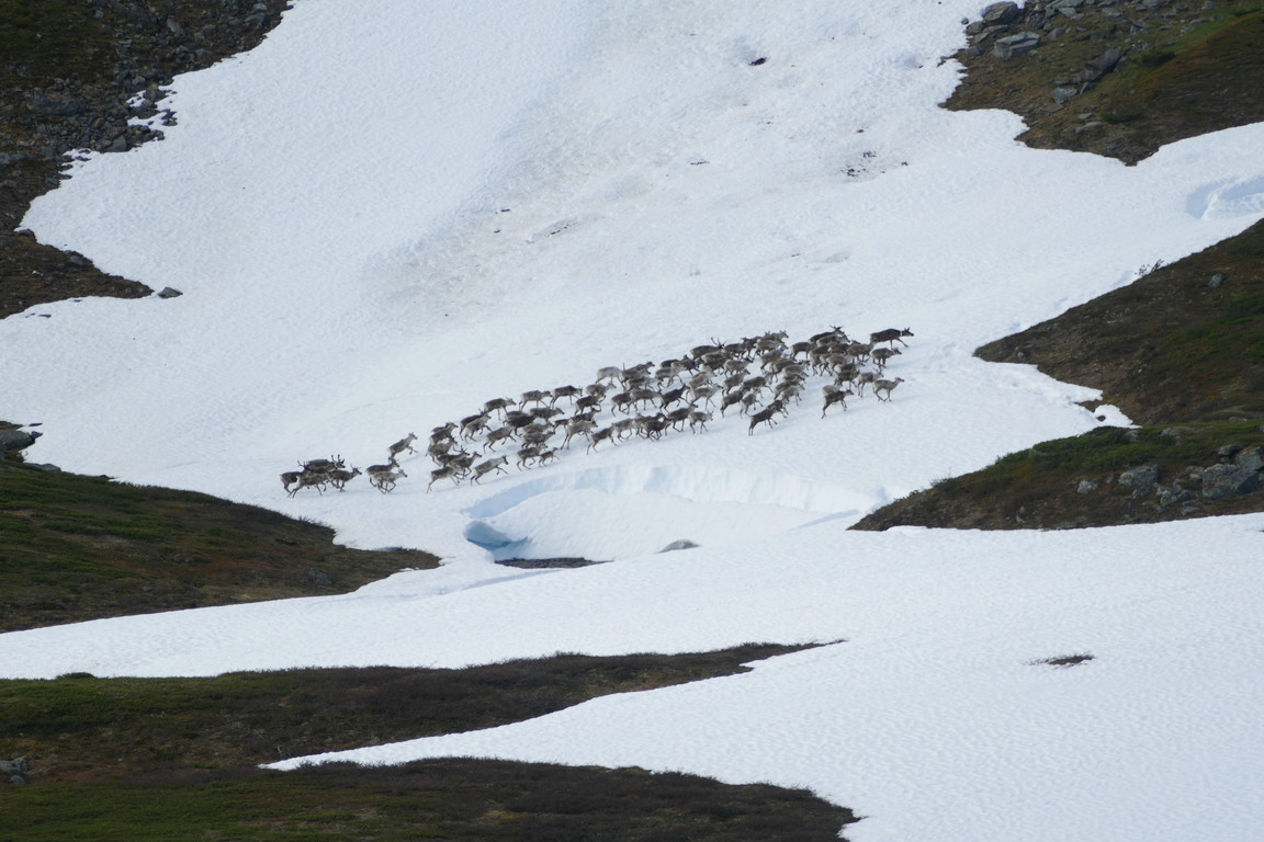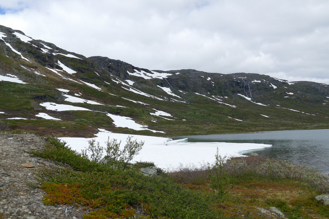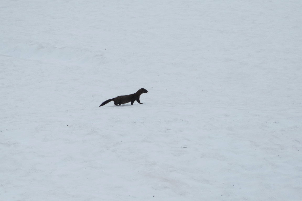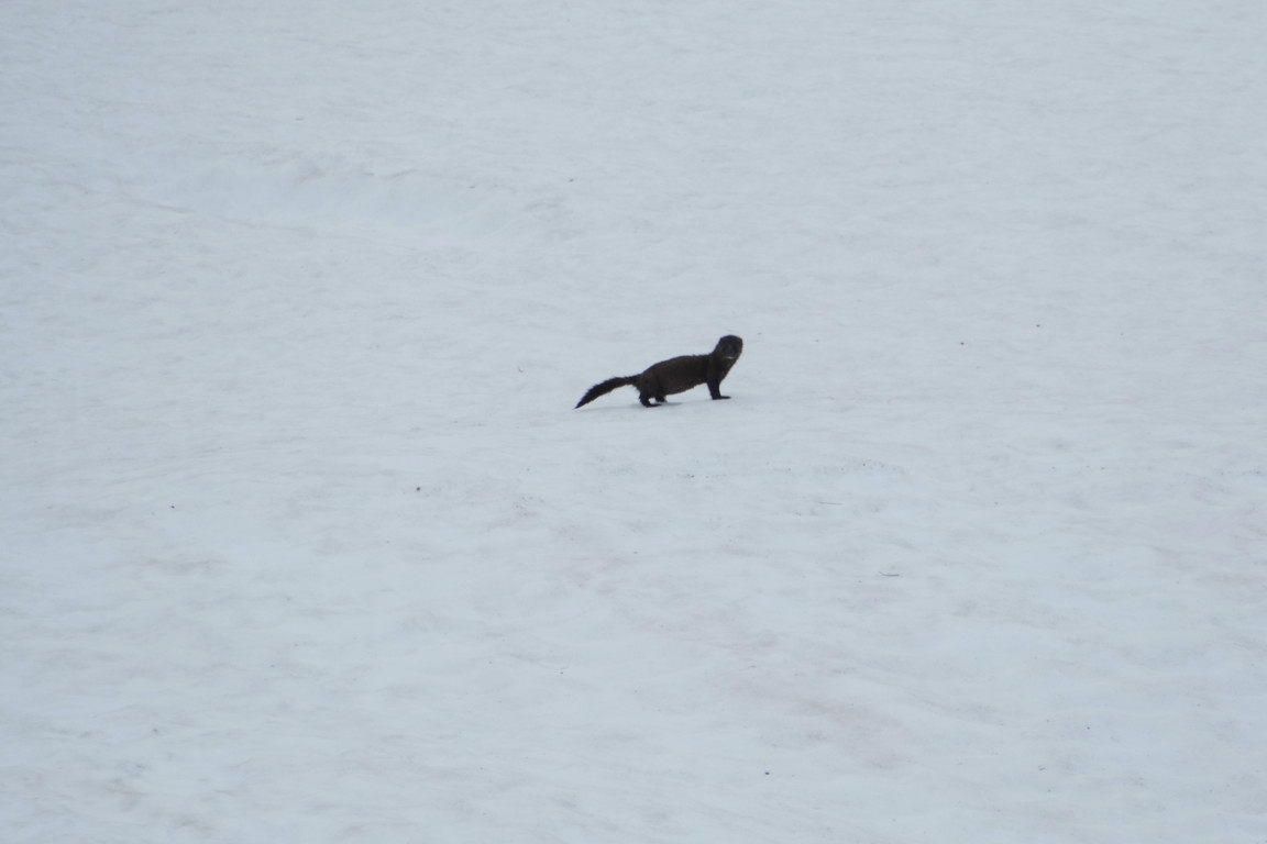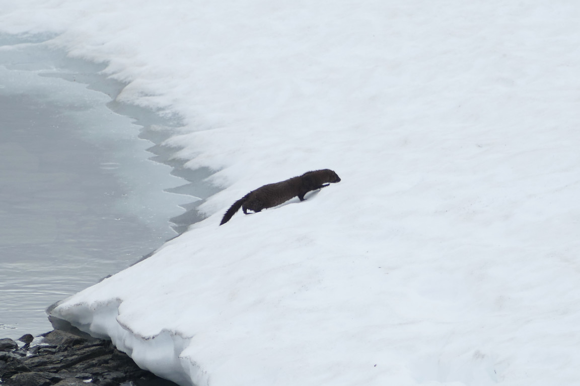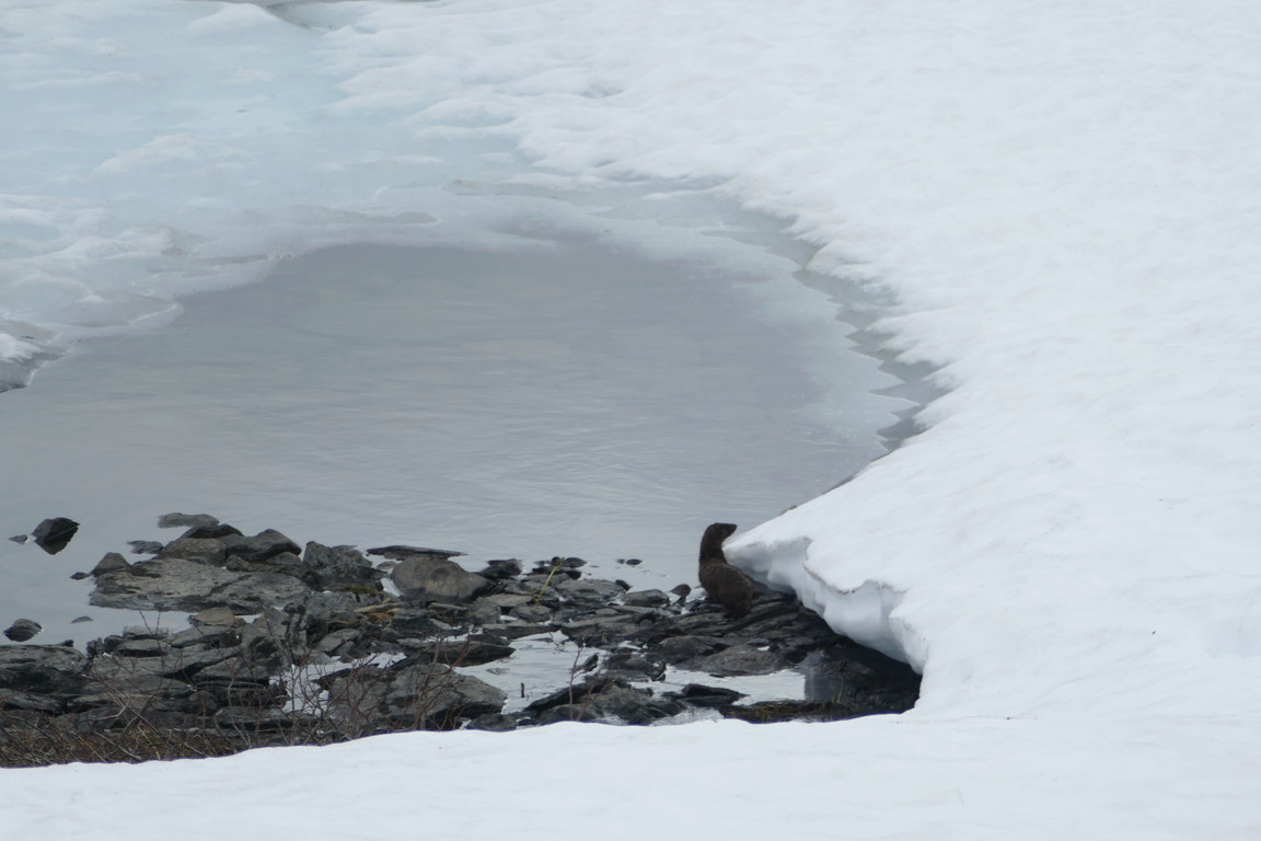 The two people who had come from the north the day before and camped by the lake soon came by and asked about routes towards Hoiganvággi and Riksgränsen, but I had no fresh information about either. As it turned out they were friends of Anna who was to relieve me as warden later on, and they were, in a manner of speaking, out scouting for her benefit. After they had left, continuing into the valley, I observed a shy mink down at the still extensive snowfield by/in the lake, and managed to document its presence before it disappeared.