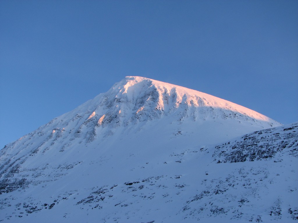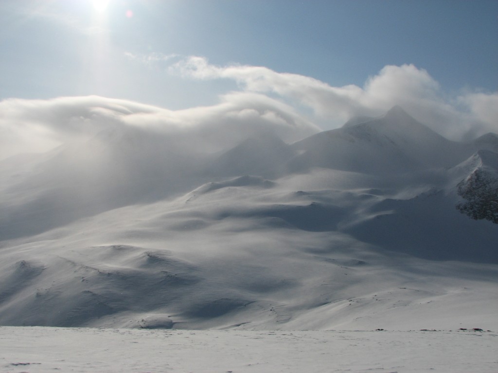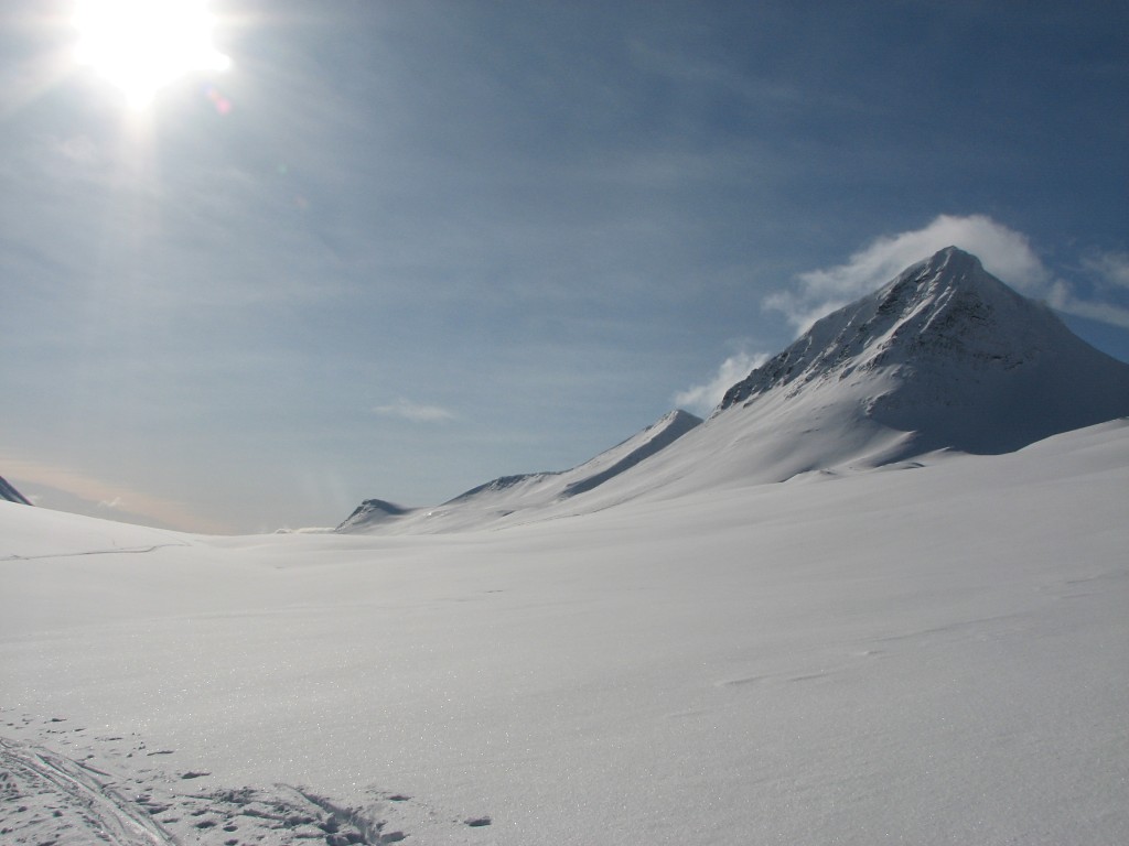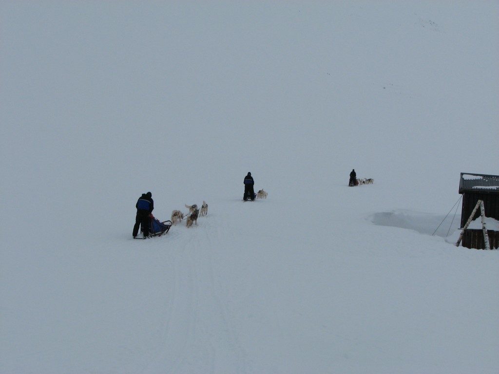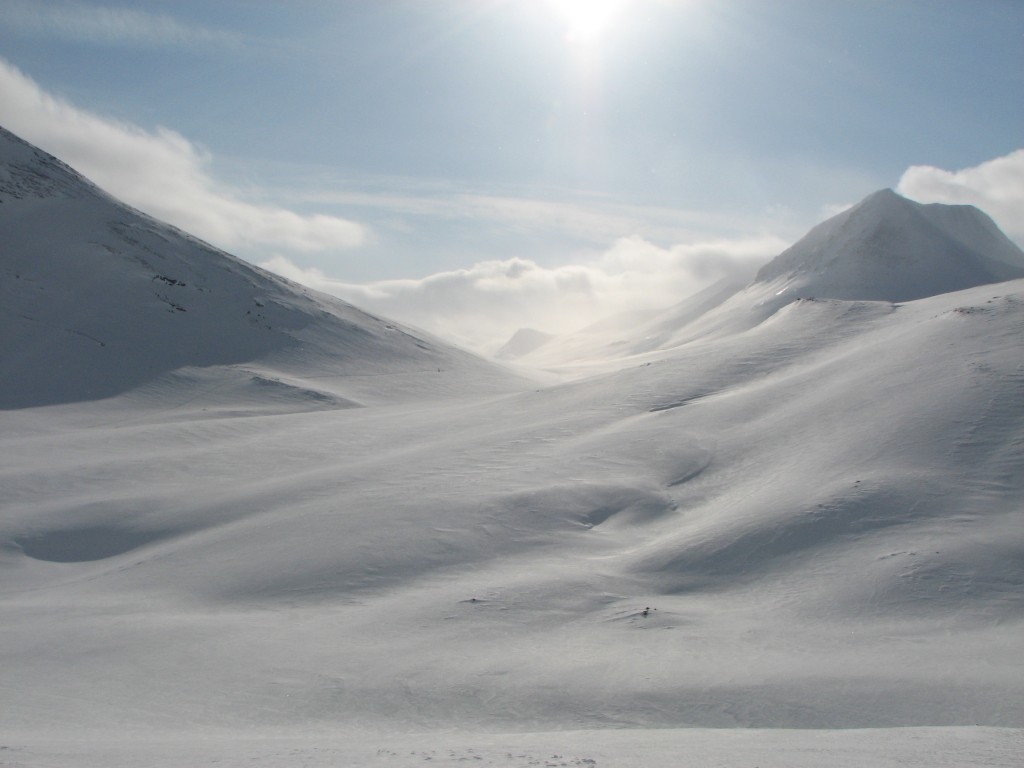 I spoke some with Erik while the sled guys went out to reconnoiter the route, being greeted by a significant haze that grew out of the west together with a cold wind. Finally the two figures I had seen earlier showed up again, and as they came down the western slope I identified them as the Belgians. They had had a great day ascending and descending Nállu, never making the full circuit as I had done. The Norwegian decided to press on to Sälka, which she had to do in pretty bad weather, but this soon passed.