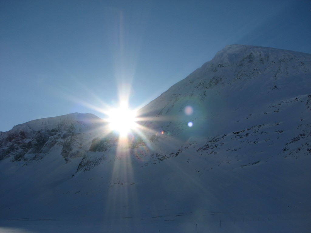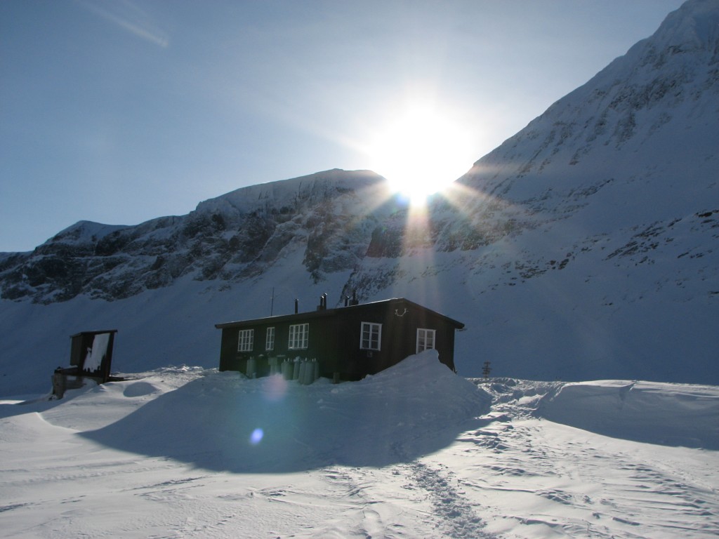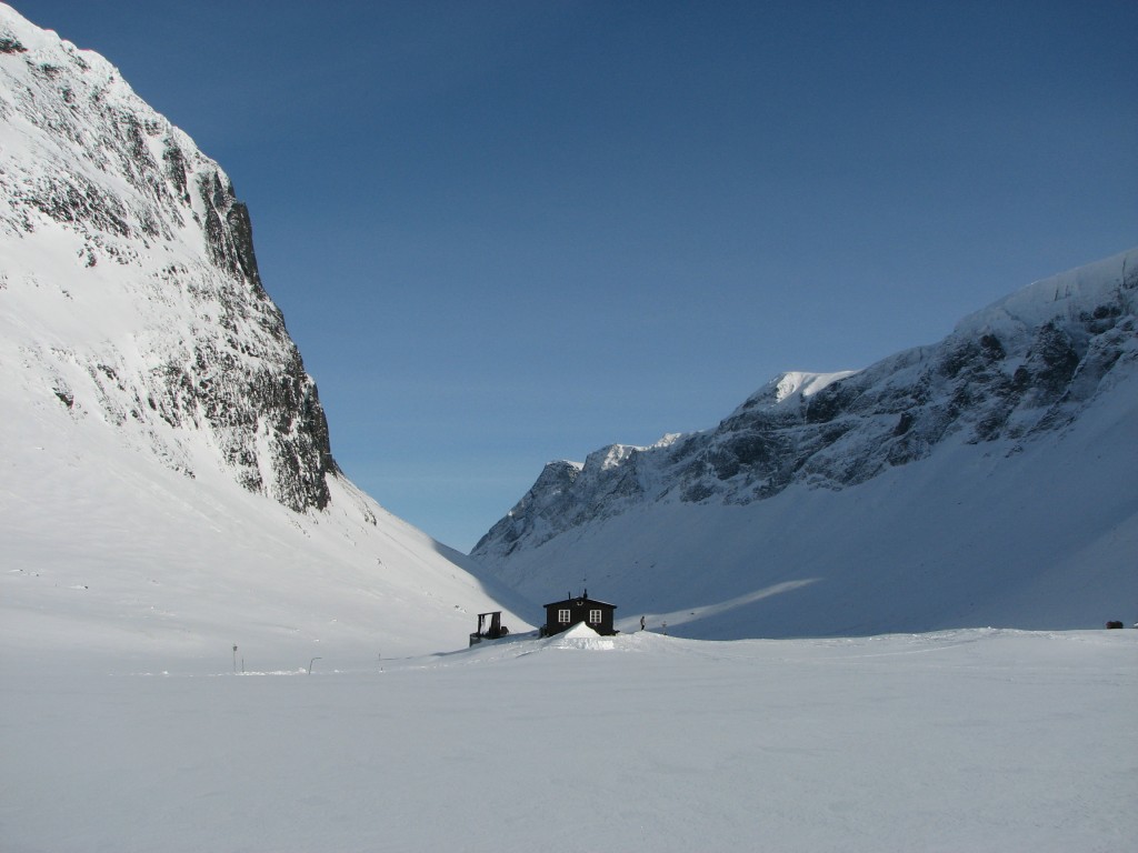 After admiring the grand view for a while – especially the perspective on the peaks around Šielmmávággi was terrific – I turned my skis downhill and set off. At first the snow was a tad too deep for comfort, but then it got better – much better, and I had a great run down to the track which I then followed back to the cottage, meeting a dogsled with two people just behind the woodshed around 13:30. I spoke some with the dog-person inside, whom I soon realized was the same woman – with the same dogs – as I had met in that very room last winter. I then went for another run in the slope before going in for real.