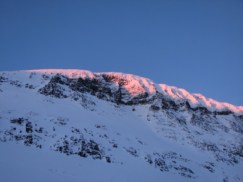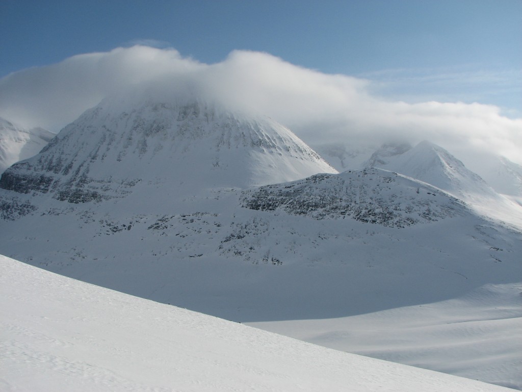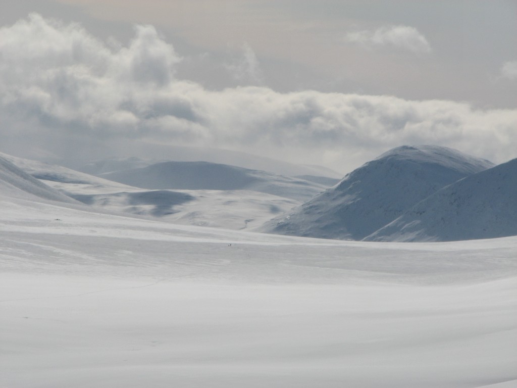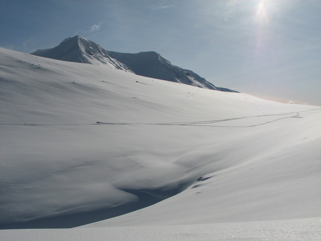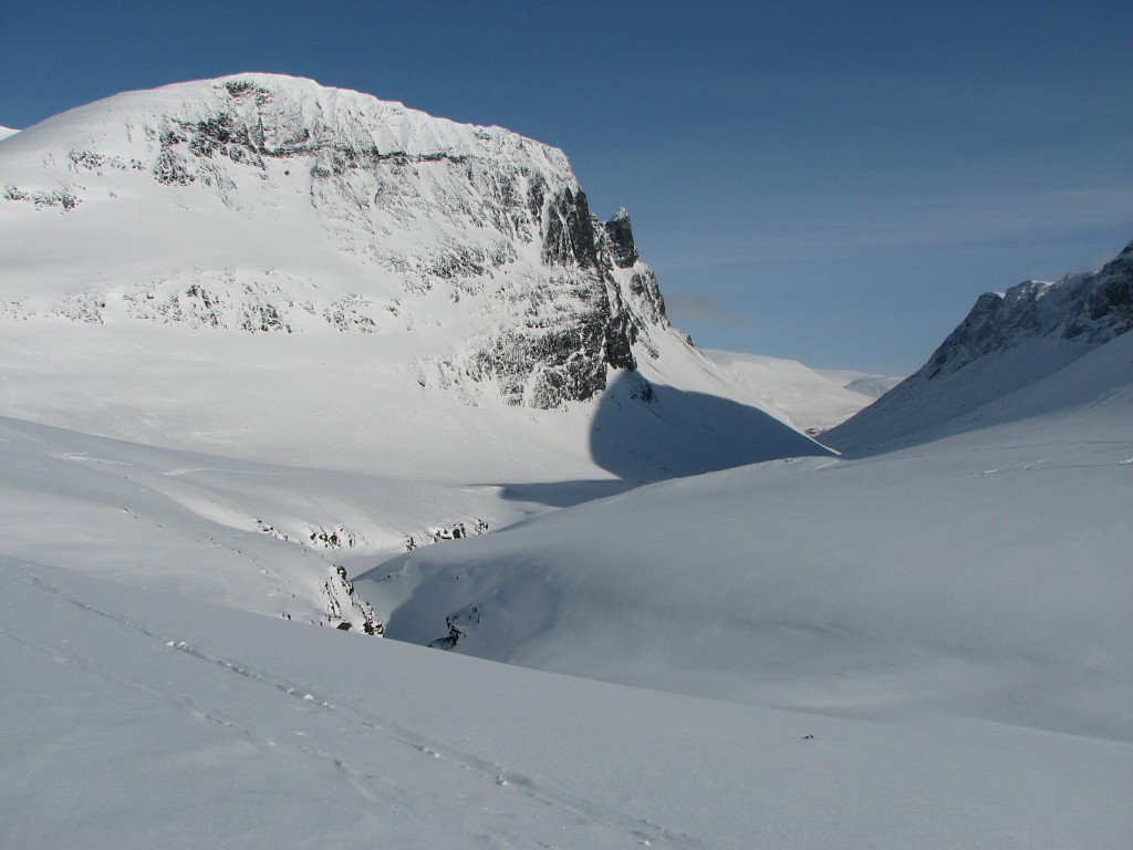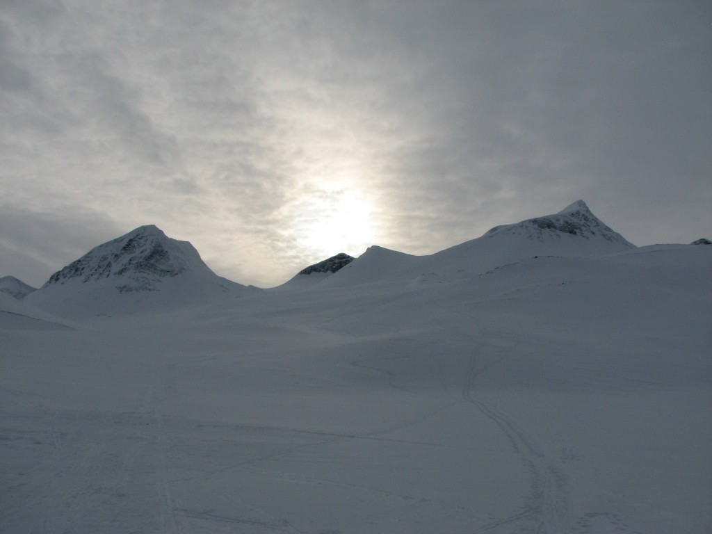 The peak-clouds were growing thinner, but to the southwest they refused to yield. I mostly followed the Belgians' tracks at first, then going straight up the lower reaches of Nállu until I found myself among the rocks. Going down there were partly some tracks from previous turns I could strengthen or cross, but the snow was not too good for the first bit. Further down it got better, and the portion down towards the lake was definitely good. I crossed the ravine just at its beginning and skied over to the start of The Slope, the run down in which was surprisingly good too.