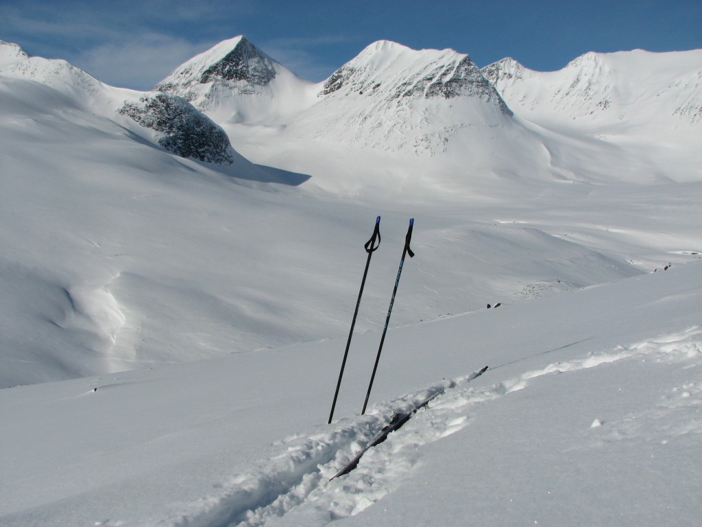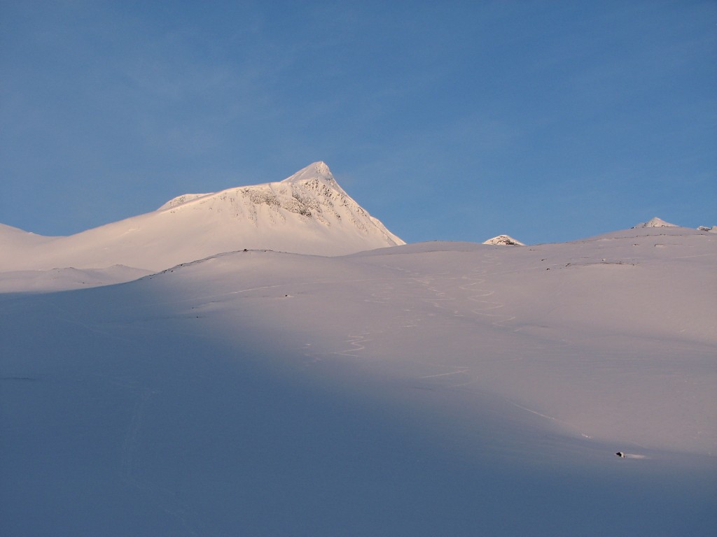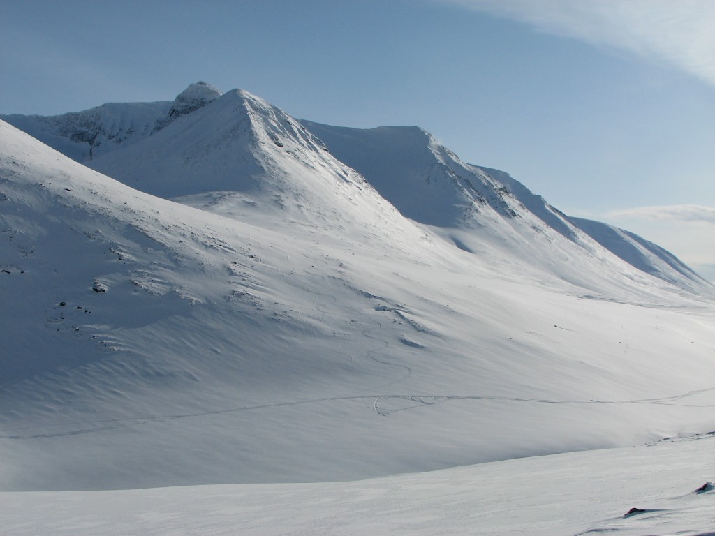 After the break I kept my warm sweater on and started cutting across the slope down to the Sälka-track that went on the northwestern side of the ravine gouged out by the stream from Reaiddájávri, and when I reached the other, larger track above said ravine I took off the sweater and put on the climbing skins instead, as there it was both warm and mostly still. I followed the old track towards Unna Räita for a while, and then I broke off aiming for the peak of 1333, but I went no further than the level where rocks started appearing en masse. The sky had now banished all clouds, and two people whom I had observed out on Reaiddájávri had obviously decided to make the most of it, as they had stopped and from what I could see were digging something for breaking purposes.