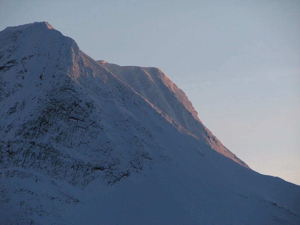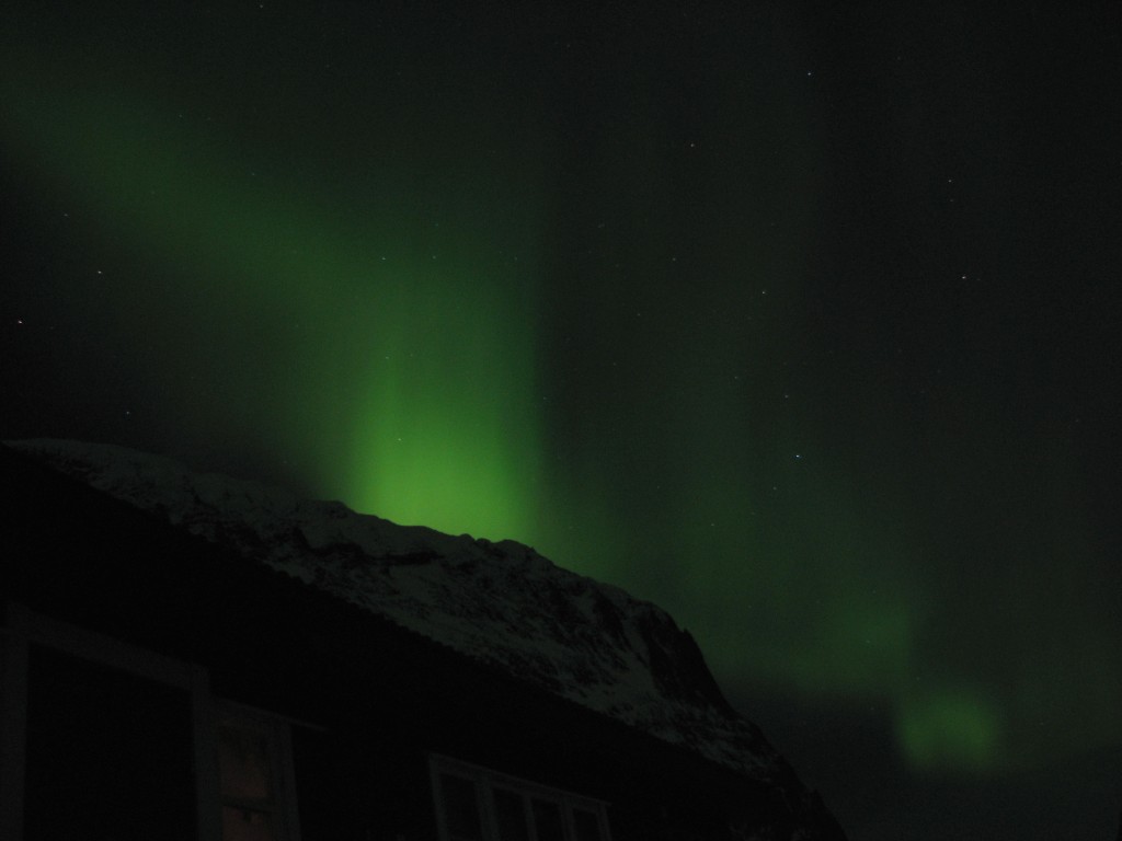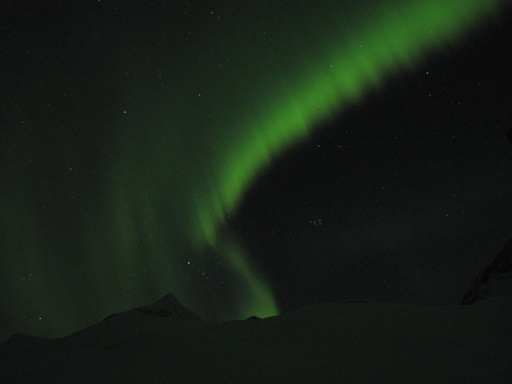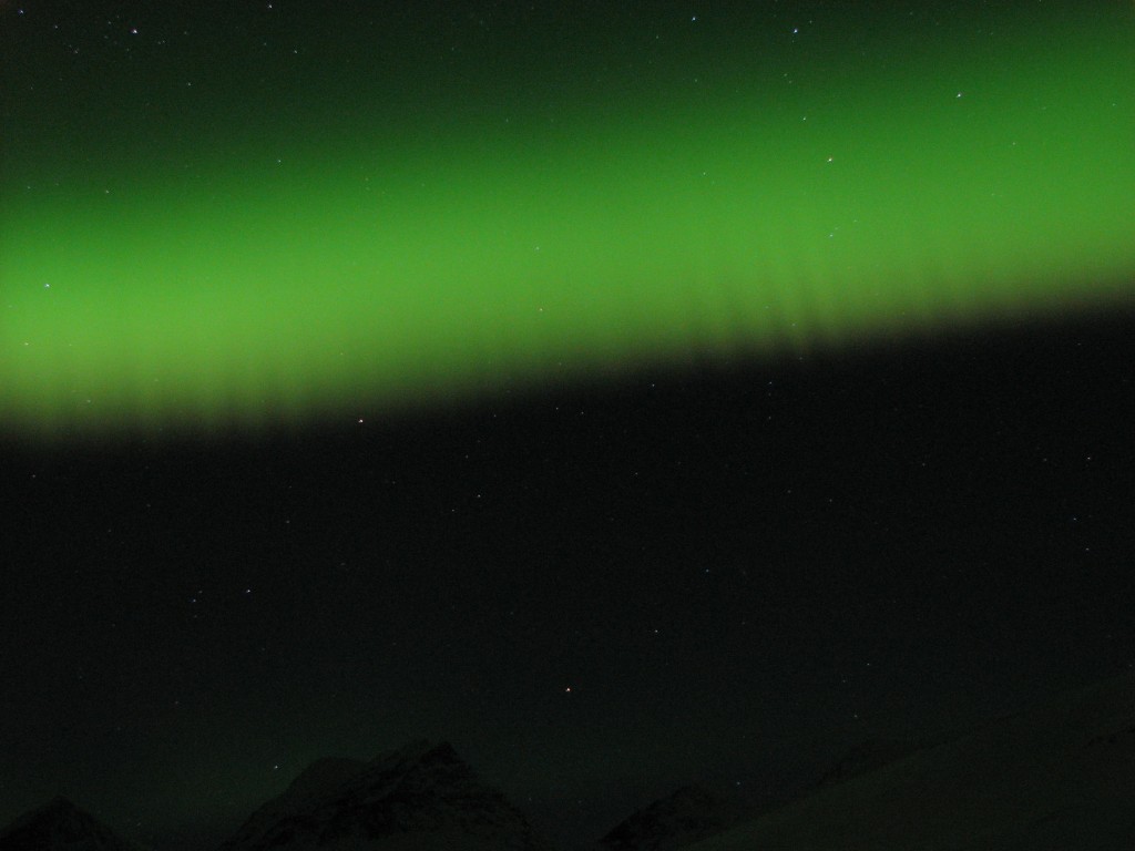 The evening was exceptionally beautiful, and entirely calm. After the advent of darkness there was a tenuous aurora to be seen at first, but after a few hours it exploded into a full-blown display of more colors than the usual green. Apparently solar activity had reached a minor peak, for the dancing bands were now descending almost to the mountaintops – or at least that was how it felt. Truly spectacular, it was.