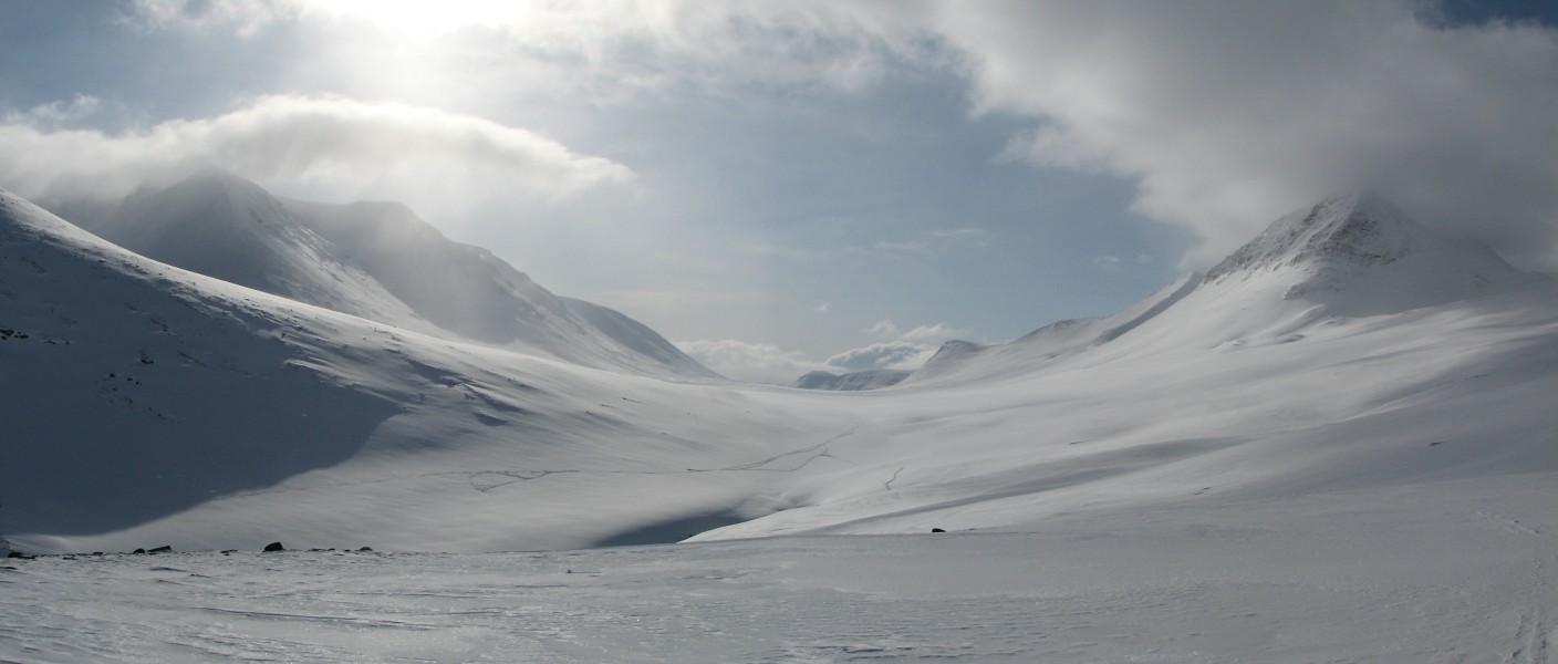 The group was up early, having decided to make a day tour to Unna Räita, possibly including Reaiddáglaciären as well. Conditions for such endeavors seemed favorable, even though there were extensive cloud formations around all the peaks. When everyone had left I cleaned the eastern room and then took it easy outside, not feeling like going out today. A French couple then came from Vistas; they wanted to spend the night, but first they too would make a visit to Unna Räita. Just after lunch a Swedish couple came by way of dogsled, and having parked the canine-powered carrier at the woodshed they came in to eat themselves. When they were ready to leave again a group of six arrived from Sälka, and after seeing them in – and learning that I had encountered two of them at Tärnasjö in 2006 – I decided to go out after all, starting along the same route as yesterday.