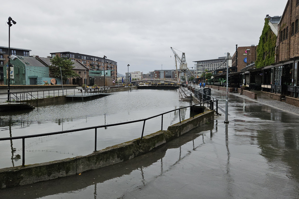 It was actually more of a drizzle as I descended towards the city center, taking a slightly different route than on the way up, but then the rain increased. I had plenty of time and so walked leisurely, and once at the station I found the train already at the platform, so I boarded it without further ado. It also departed right on time, and appeared to be mostly full. The first bit was rainy, foggy and hilly, and some fjords were visible, but the further north we got the more the rain and hills petered out, eventually giving way to flat valleys and finally sunlight.