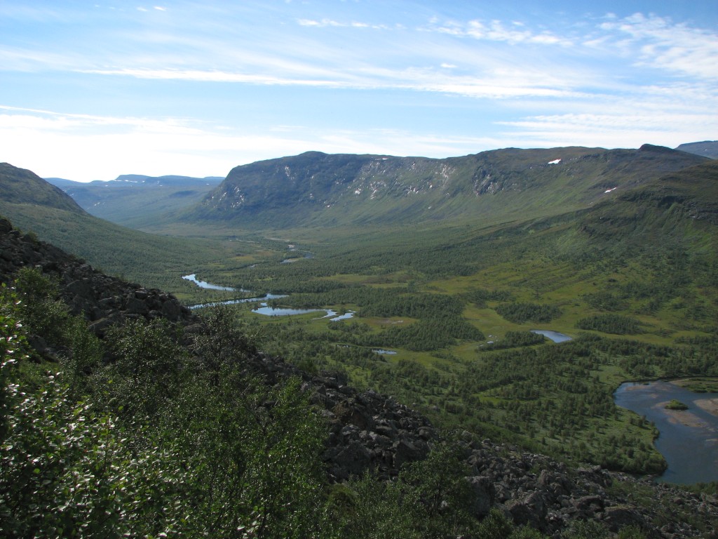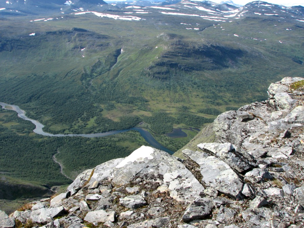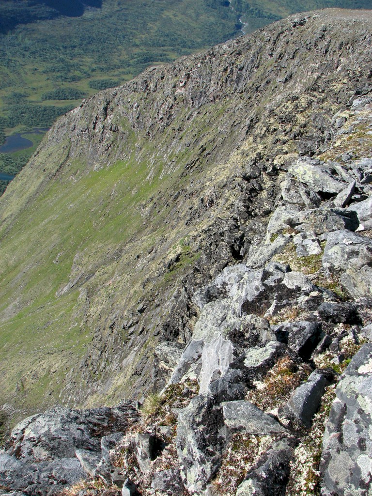 ...and very suddenly I found myself at the verge of a tremendous precipice overlooking Tarradalen far below my feet. I walked around for a while, immensely enjoying the views and the acute sense of loftiness they infused – I could see large sections of Padjelantaleden down in the valley, but even though I scanned its length with my binoculars several times I detected no human presence anywhere. At 12:30 I finally sat down right there on the edge to eat, with the extraordinary vista in front of me. There were a few gusts of wind while I sat there – which I did for quite some time – and the sun was still dimmed. Then I got up and walked around taking photos, during which the opposite motions of the feather and the sun brought the light back to full intensity.