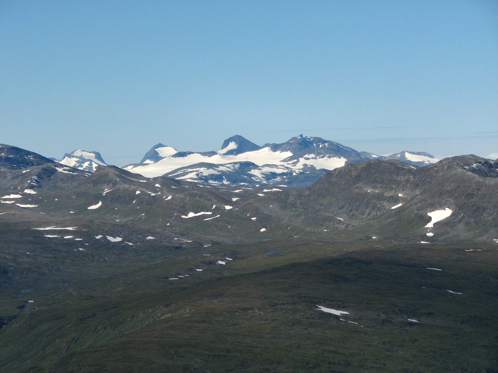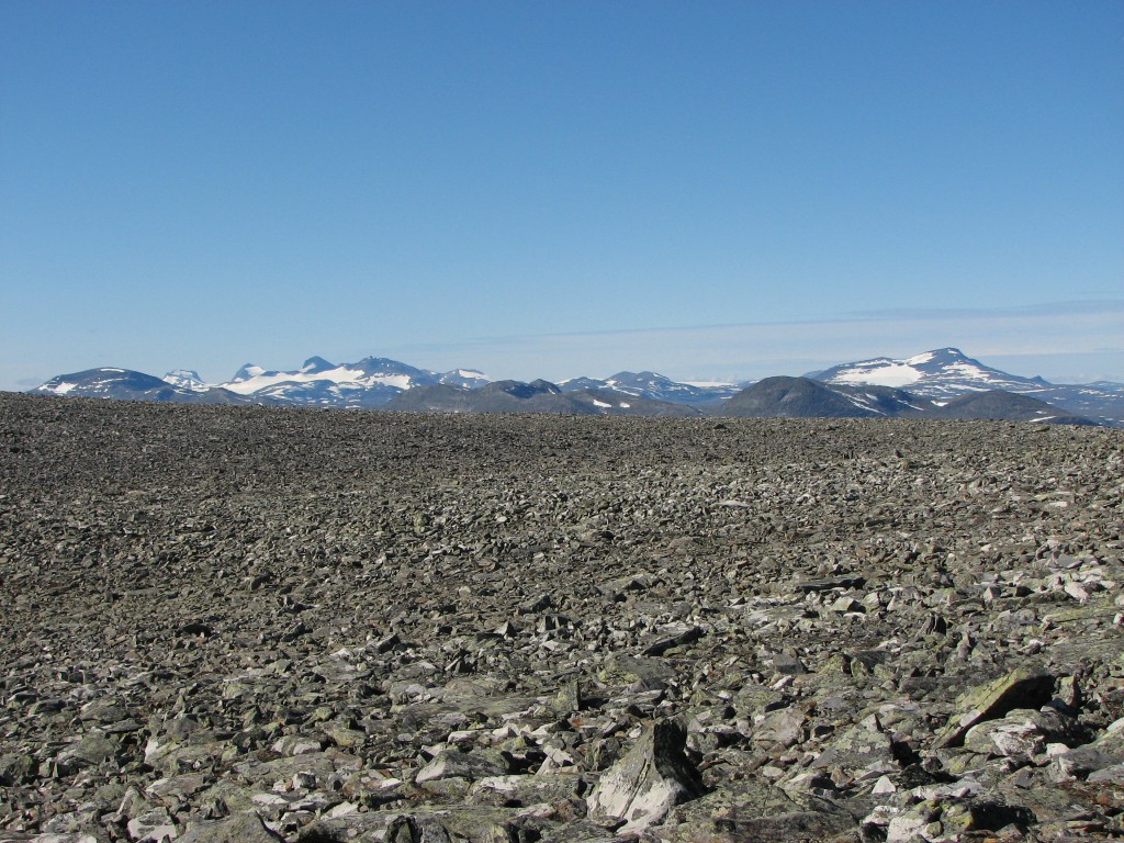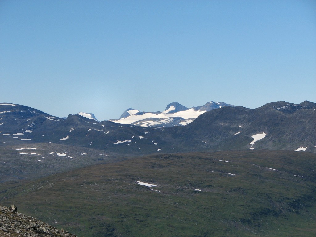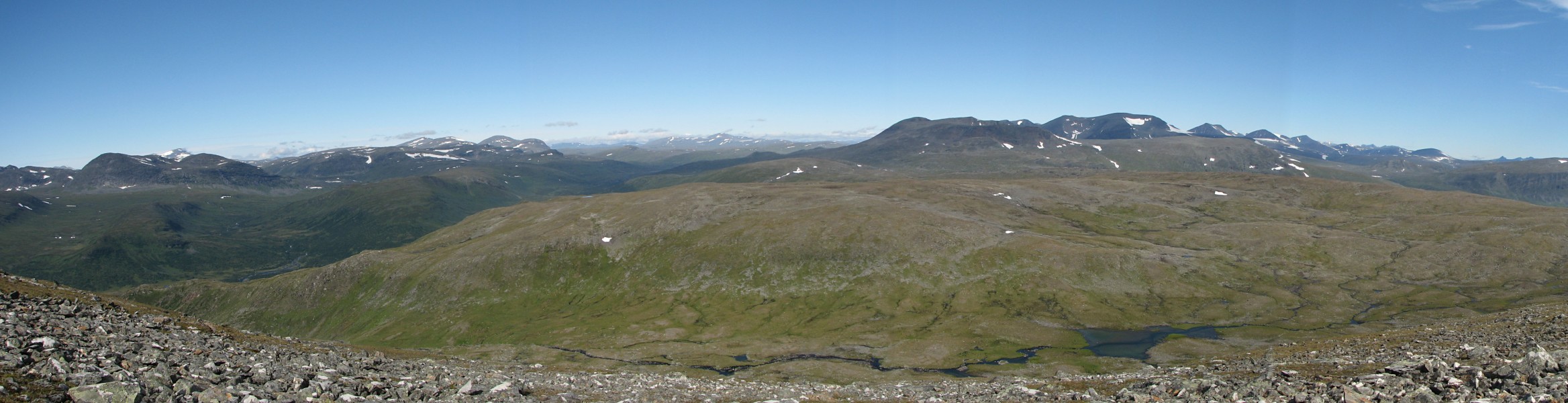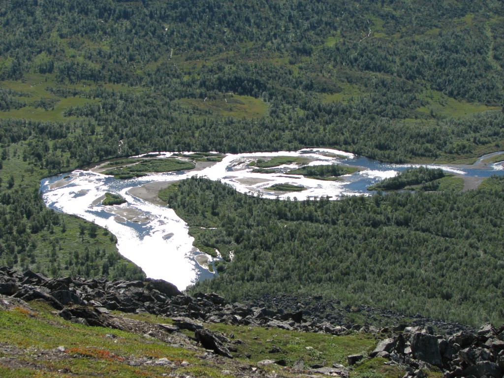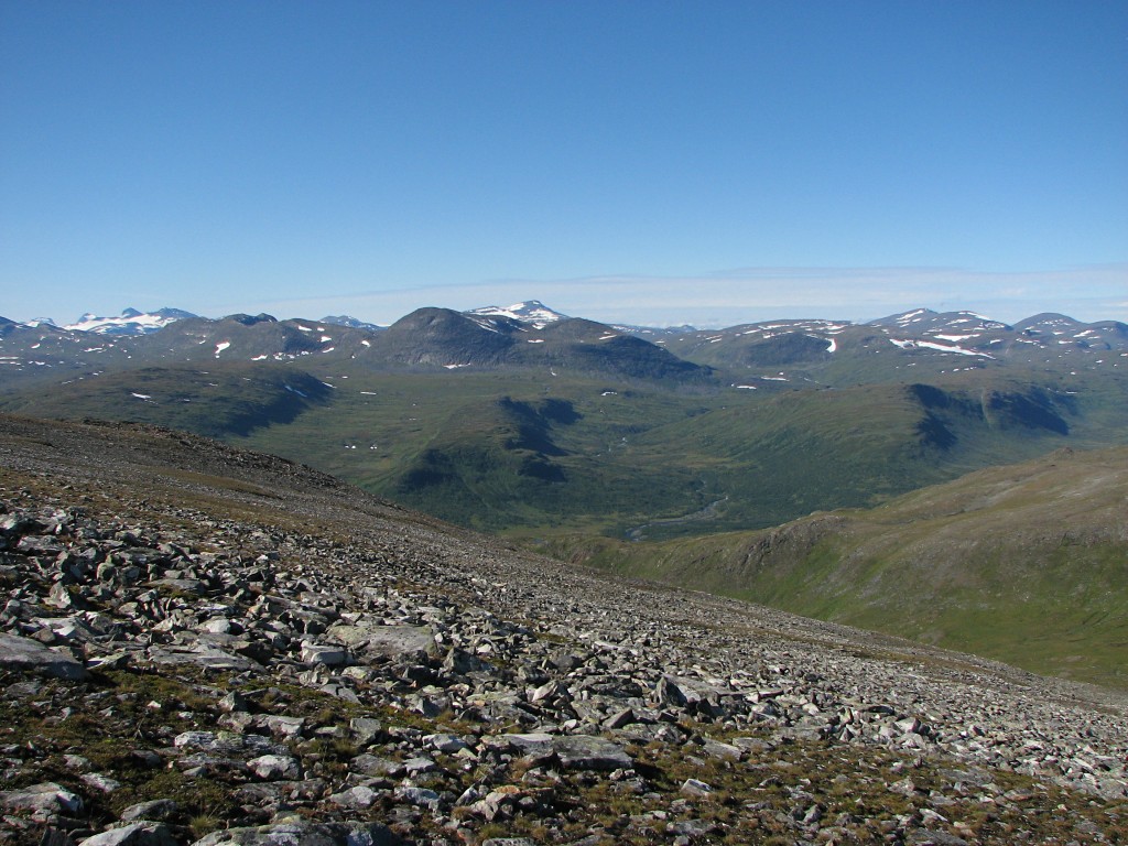 This route brought me down into the small valley between Såmmártjåhkkå and Sivvátjåhkkå a bit below where I had passed on the way up, and after crossing the little ravine I continued on a lower course. I passed north of the rock-hill, which despite the slant was much easier, and when the vegetation started I kept close to Såmmárgårsså – I was still making good progress, but it came with a bit of an effort now as it was getting steeper. I also tried to circumvent the lower rock field, but that turned out to be a bad idea – I ended up in a very awkward position from which the only escape was a precarious actual climb up a wall of boulders. When after a bit of a struggle I had overcome that obstacle the continuation was also anything but simple, and through it all the brilliant sun together with the physical exertion made everything hot indeed.