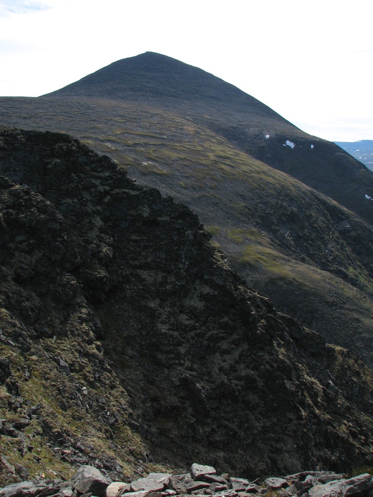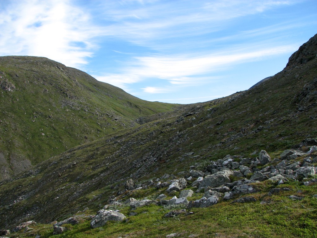 An easy portion of mostly grassland strewn with stones followed as I walked up onto the crest of the long slope, continuing high above the cleft until I reached a small ravine of a brook coming from the south. The celestial veil had now passed in front of the sun, which made for more pleasant walking conditions as I kept on going upwards, cutting across the northern slope of Såmmártjåhkkå after the ravine. At first the ground consisted of grass and going was easy, but the higher I got the more numerous the stones became, and eventually I turned straight up where the terrain seemed better. This it was, and it soon also started levelling out...