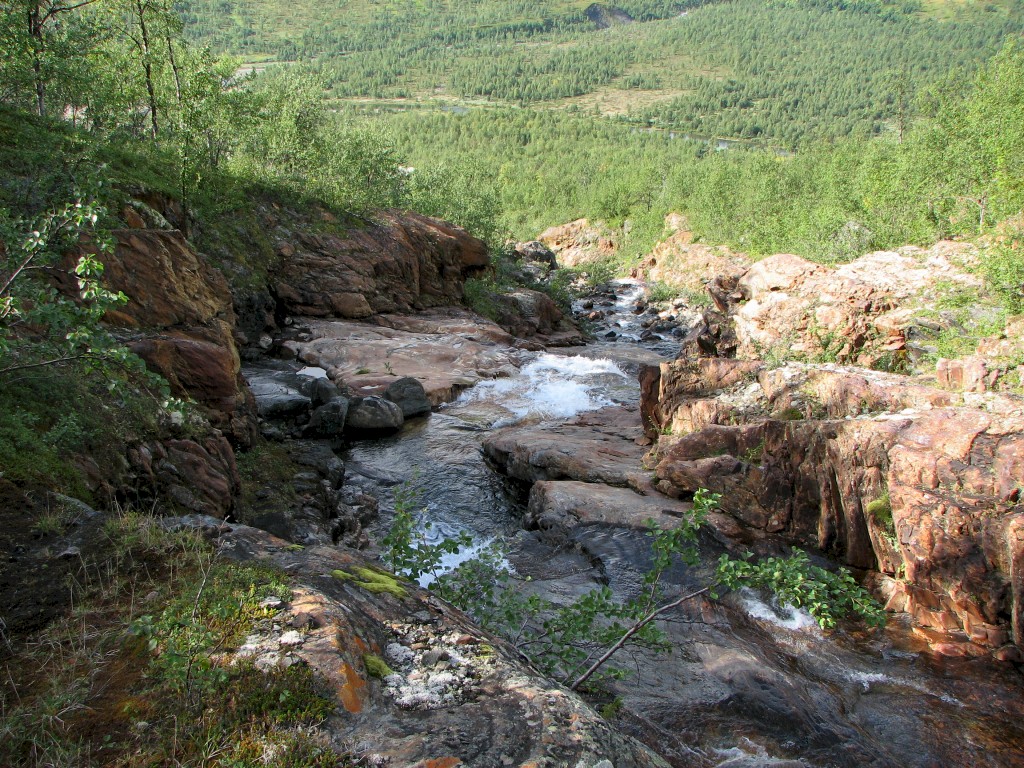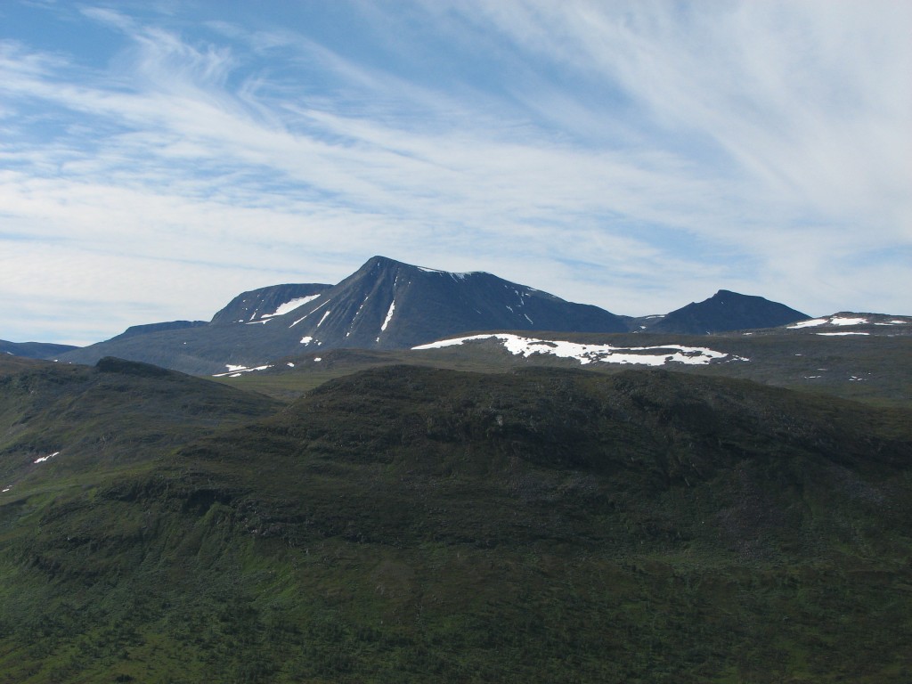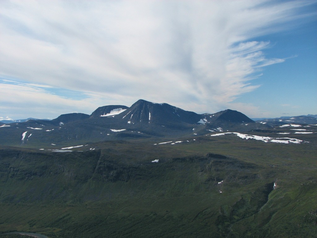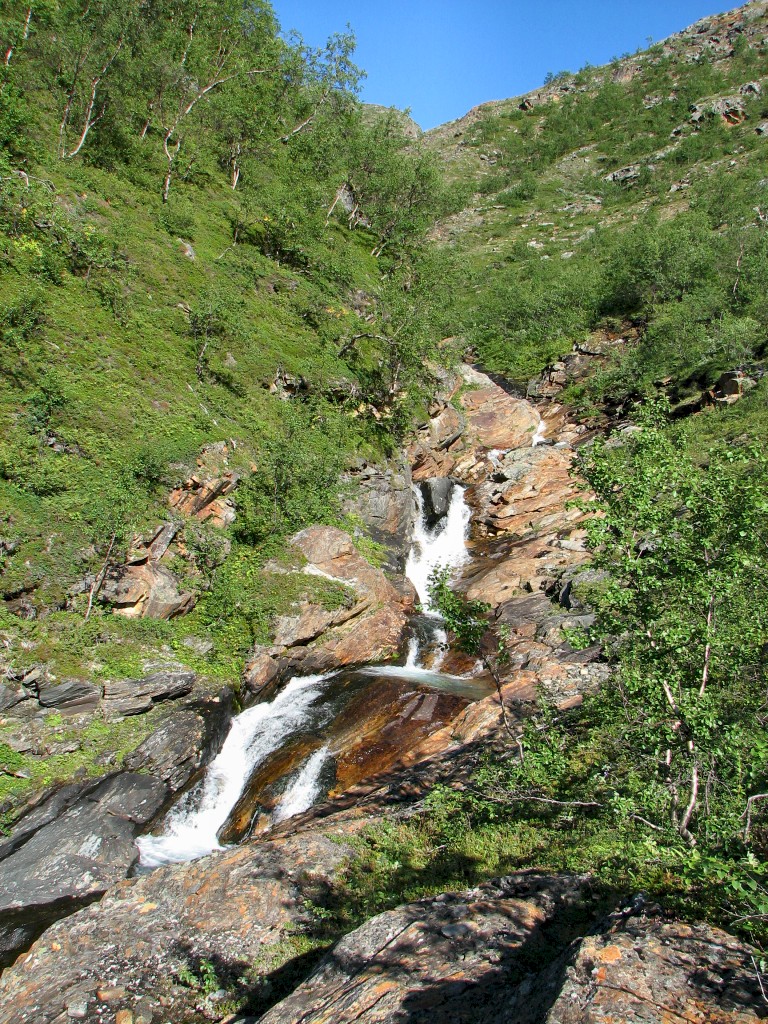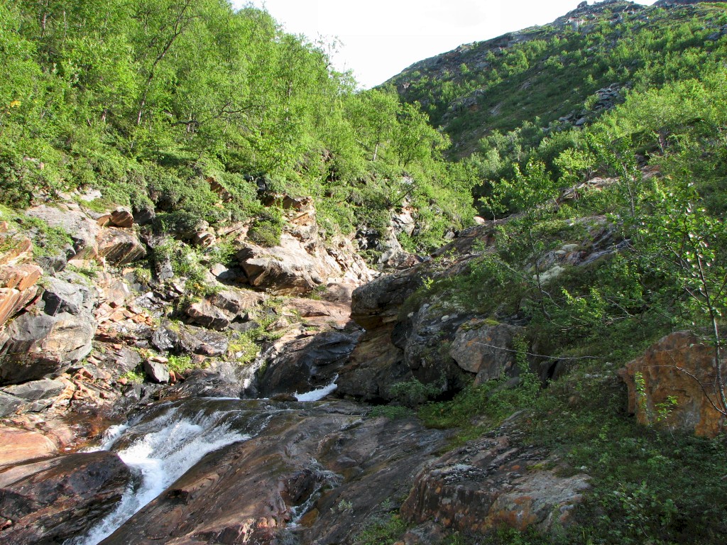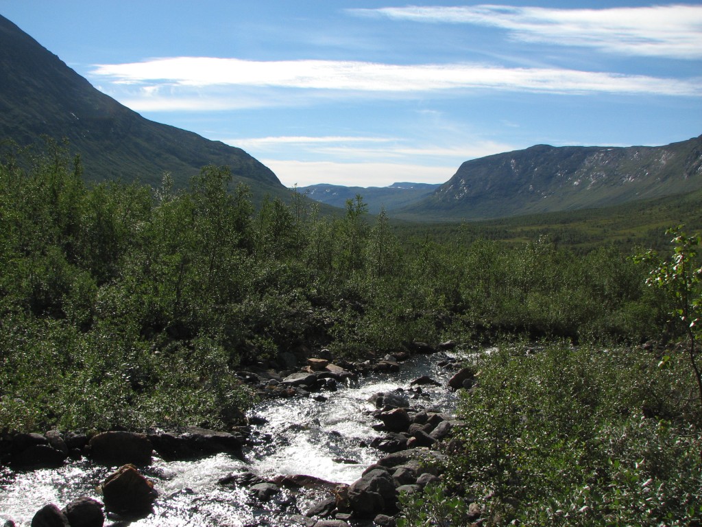 When I got going it was warm and very fair, with some high streaks of cloud in the form a large feather that spread out from the west. I continued upwards in a straight line when the path turned to the south, making my way through some bushes until I reached the stream from Såmmárgårsså, which was easily crossed. On the other side there were some more bushes, but then I found a path – I did, however, only walk a few paces upon it, for it emerged at the stream just where the cleft started to get deep, so I turned up the slope instead.