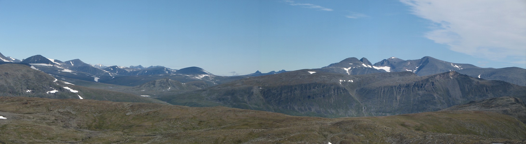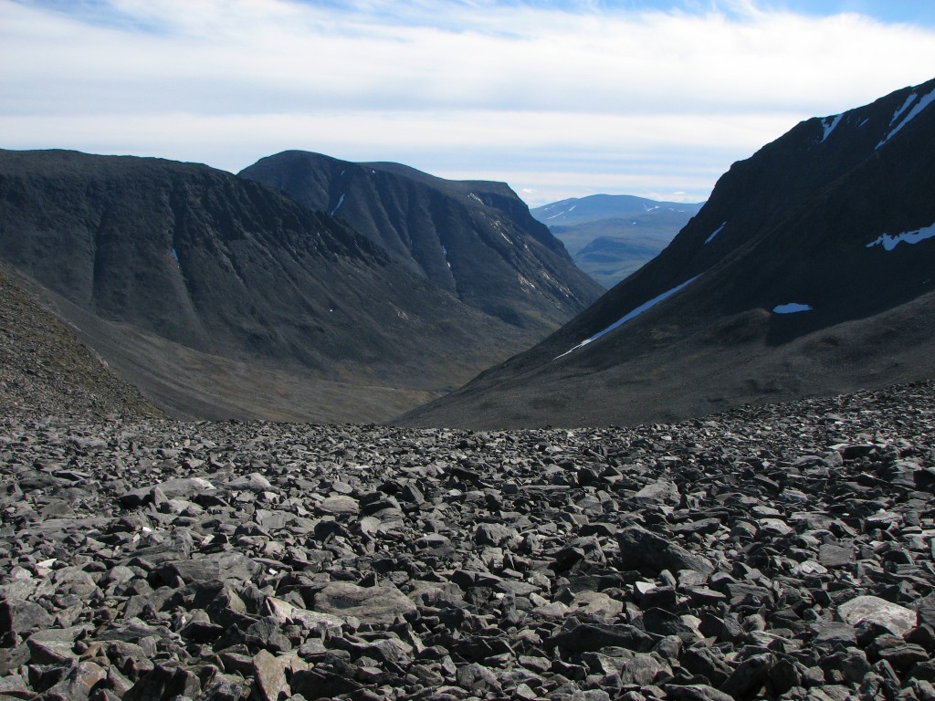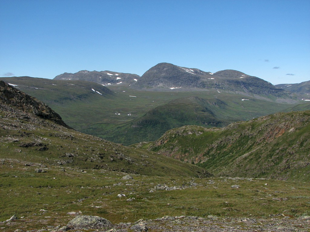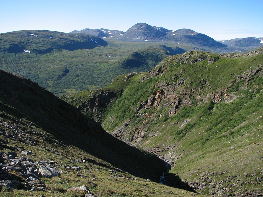 When I got going again I aimed for the saddle between Måskásjgájsse and Såmmártjåhkkå proper, which was still some distance away. Since there was a bit of wind up there on the heights I walked with the wind jacket on, and soon the upper parts of the huge cleft of Bádurgårsså came into view. I went over to the edge to get a good look, seeing all the way to Darrávrre in the remote distance, and then I walked a little bit to the east before turning back north to where the incline grew steep; at this altitude there was nothing but rocks to tread on. I maintained my elevation along this edge as I went westwards, and the further I got the larger the areas of non-stones became. I had a very good view of Ruonasvágge before I started descending for real, zigzagging my way down on what was mainly grass, feeling the toll it was taking on my knees.