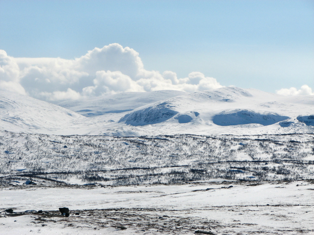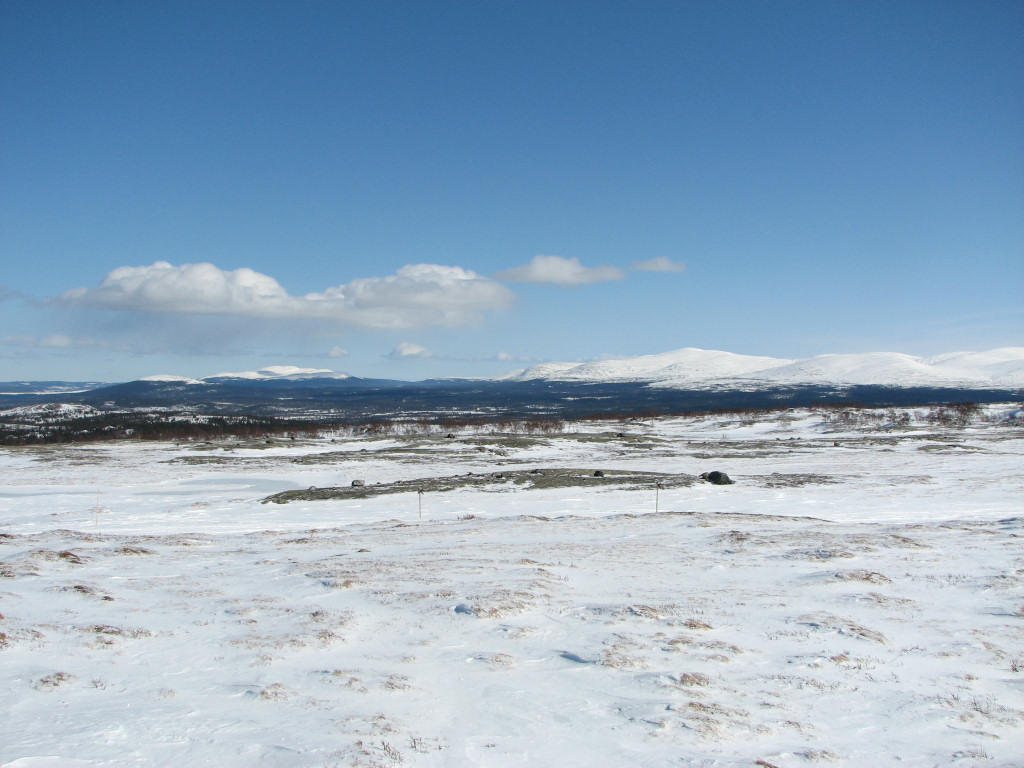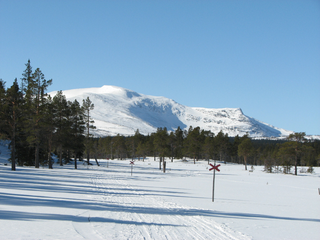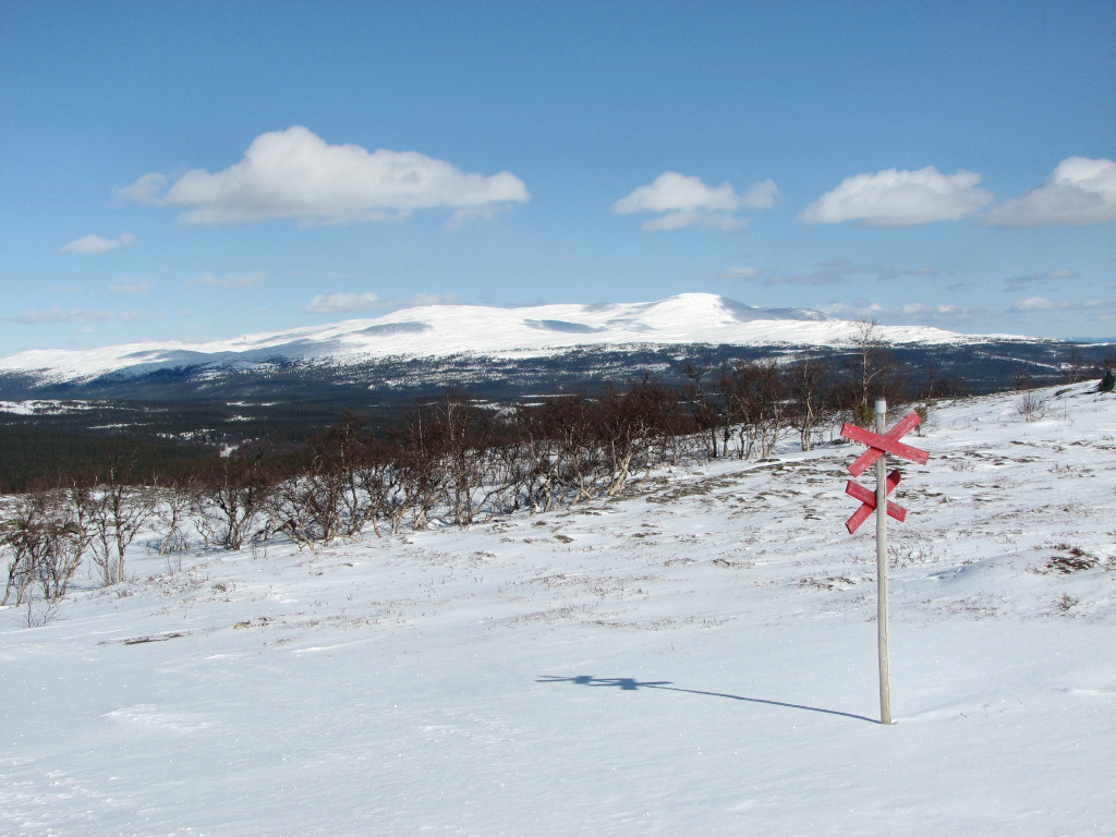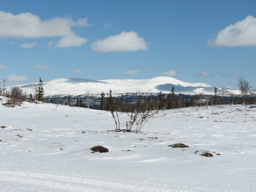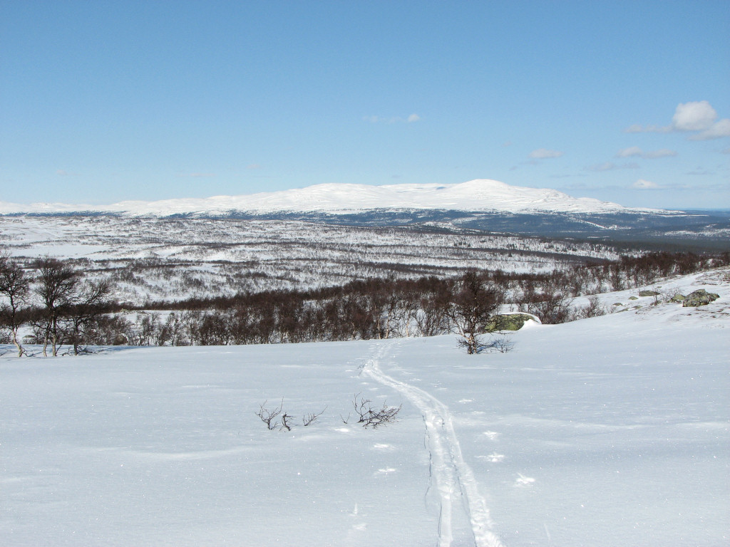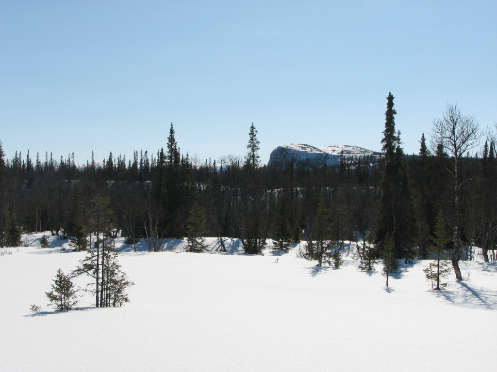 I passed Stensån beside the bridge, as the ice was well suited for this, and started the long, slow ascent up through the forest. The distance up to the point where the snowmobile trail makes contact again felt somewhat long, and I skied on at a good tempo. As I neared the tree line I skied beside the trail, where the snow was of the nice soft-upon-hard variety, and finally attained the wide view over the Vålådalen basin. I crossed the trail from the east a bit further ahead, skiing over to a large rock which I climbed around 12:30.