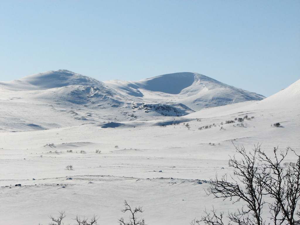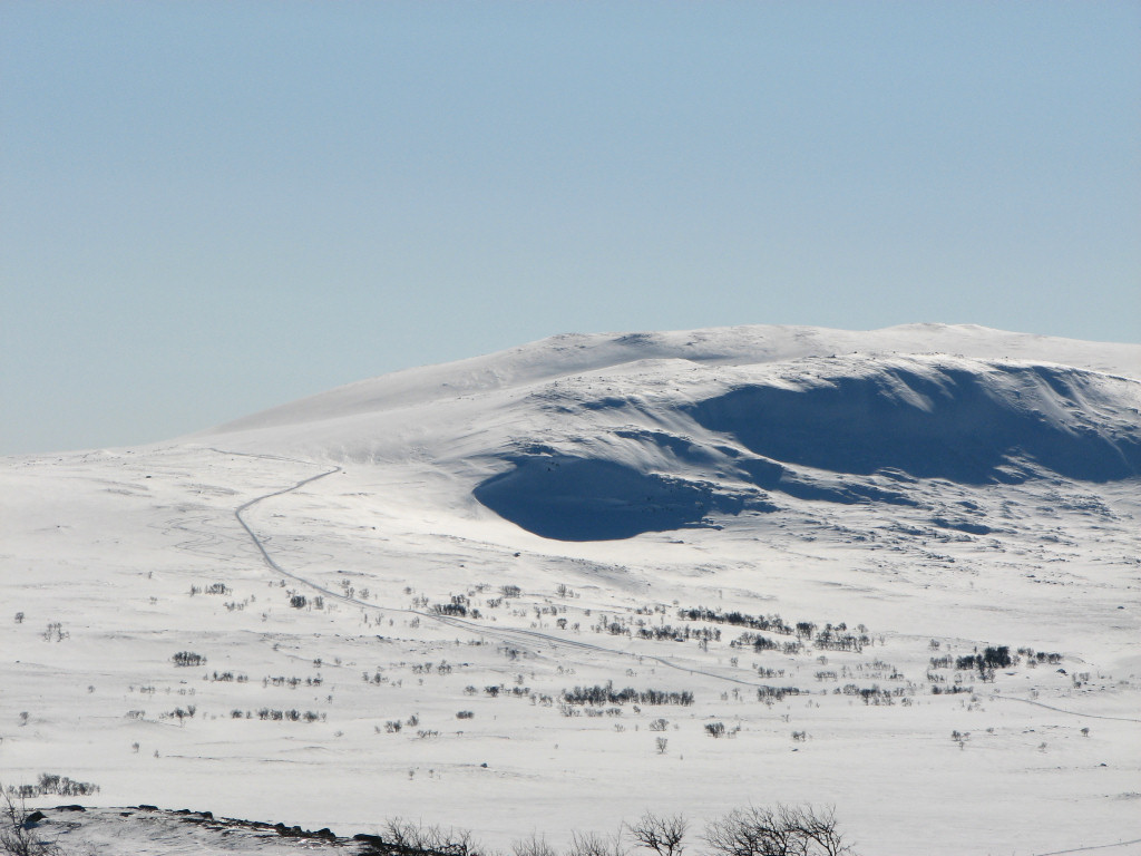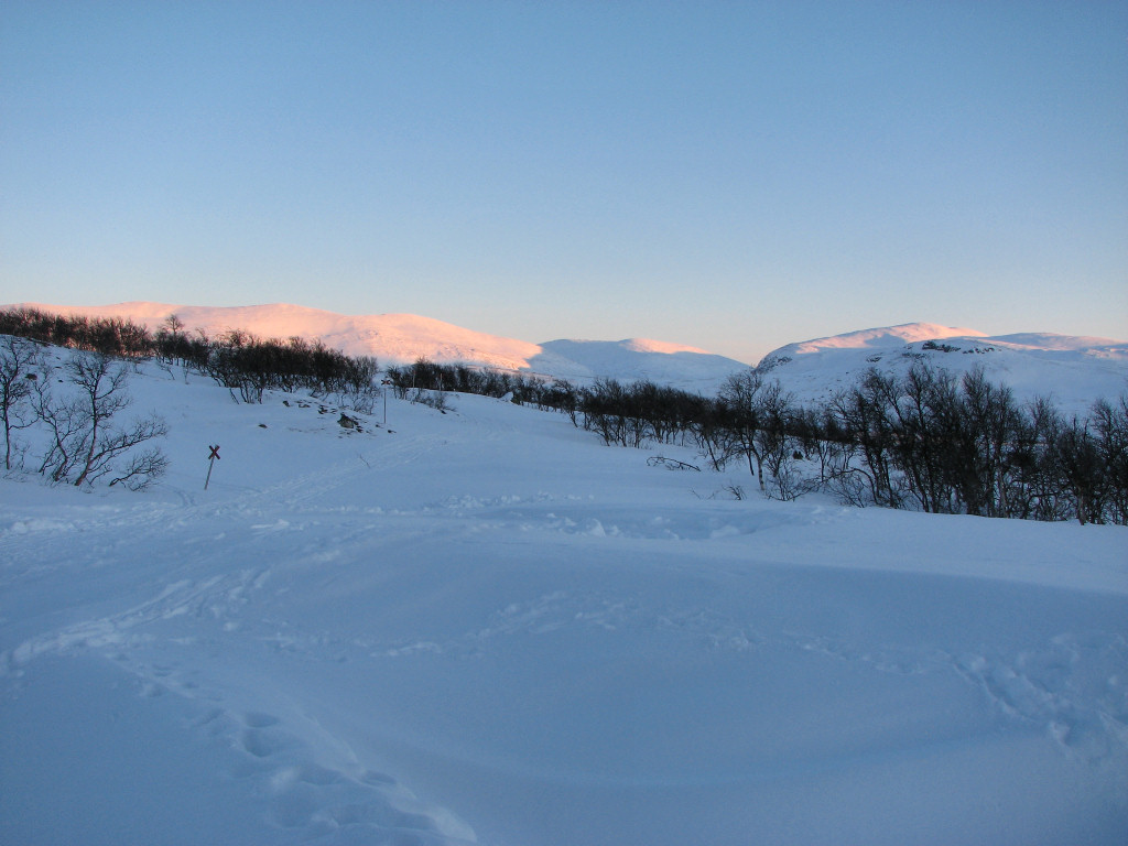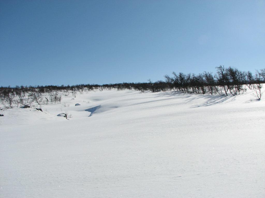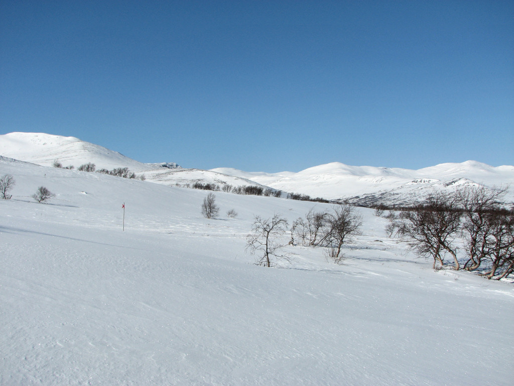 While I sat on my rock a total of five people and a dog passed by from the north, but that was the only bout of activity. After lunch I skied on the trail for a bit, meeting two snowmobiles, but then left it again as it turned just before Kroktjärnarna. These I crossed lengthwise and then proceeded straight up through the sparse forest, where the snow was completely untouched. However, I had begun feeling a sore around one of my malleoli, and it appeared to be getting worse rather than better. I continued up among the hills at the base of which the Vålå cottages are situated, proceeding east of the highest rise, before hitting other ski tracks. Some winding later saw me arriving at the cottages from the east after 14:45.