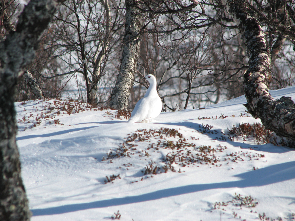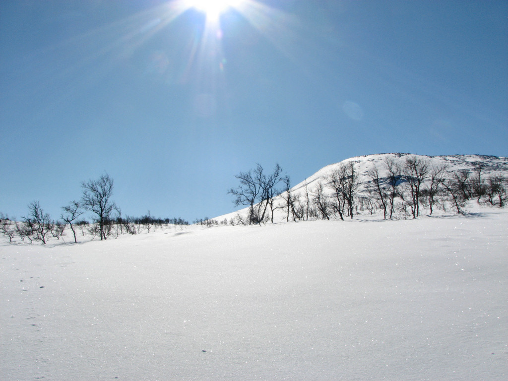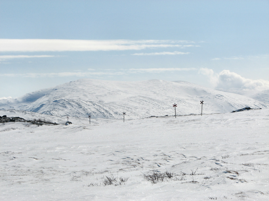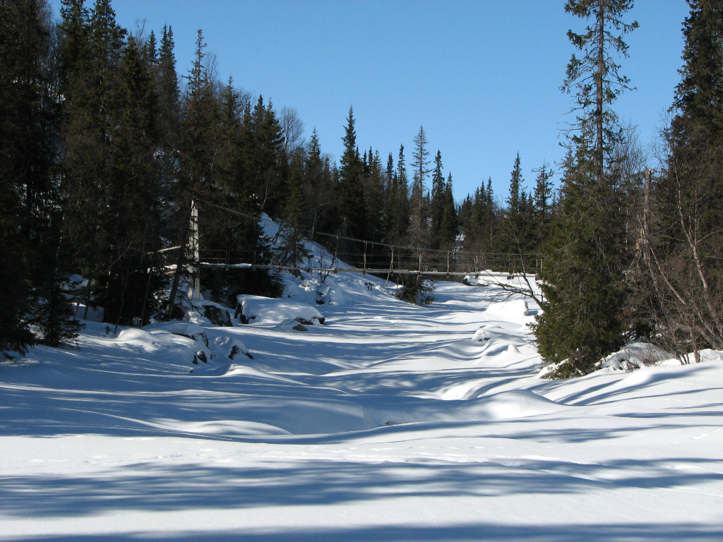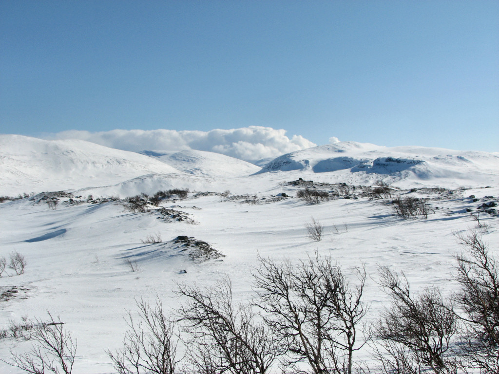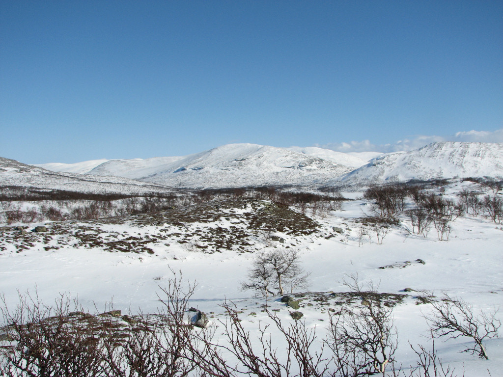 While I sat on my rock a total of five people and a dog passed by from the north, but that was the only bout of activity. After lunch I skied on the trail for a bit, meeting two snowmobiles, but then left it again as it turned just before Kroktjärnarna. These I crossed lengthwise and then proceeded straight up through the sparse forest, where the snow was completely untouched. However, I had begun feeling a sore around one of my malleoli, and it appeared to be getting worse rather than better. I continued up among the hills at the base of which the Vålå cottages are situated, proceeding east of the highest rise, before hitting other ski tracks. Some winding later saw me arriving at the cottages from the east after 14:45.
