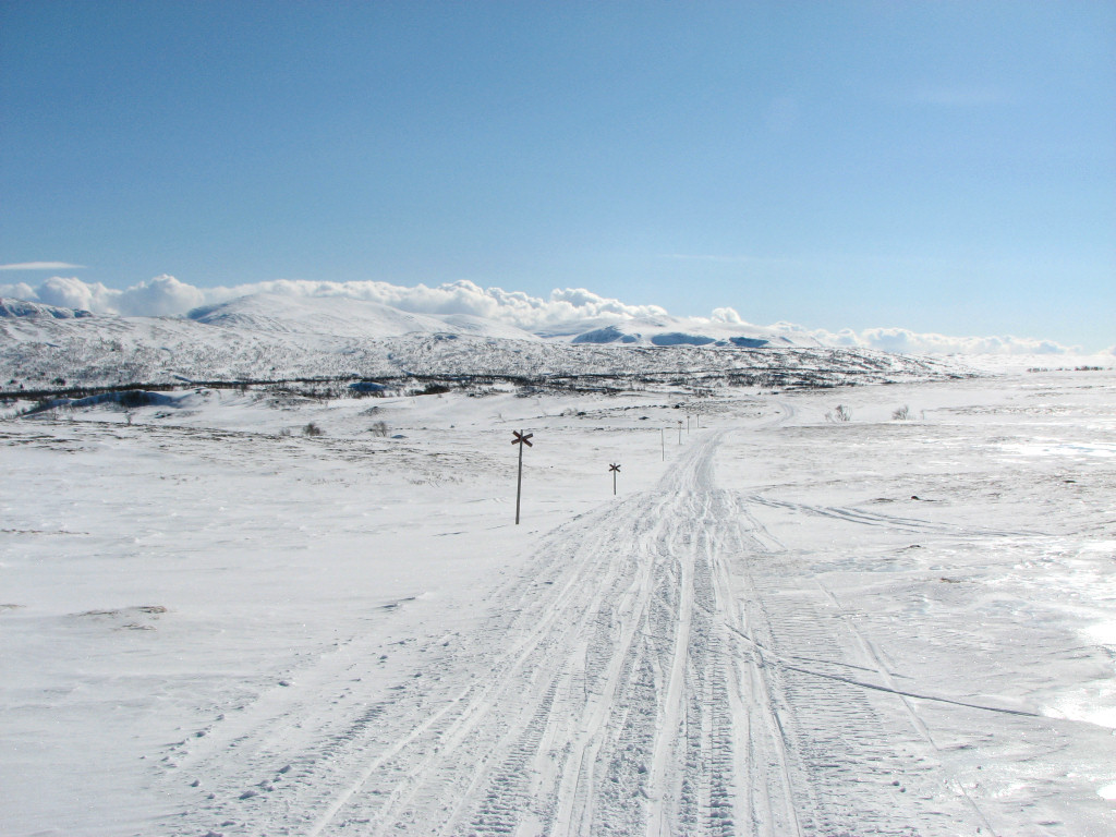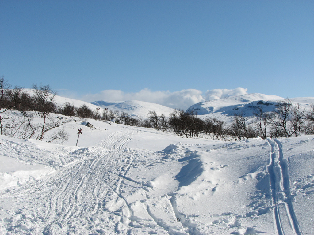 I passed one person immediately after entering the forest, where the track was so polished by frequent use that I found better grip on the side. At a short but steep slope a few kilometers later I caught up with four other skiers, whom I passed and then outran. The majority of the "polishers" seemed to have followed the branch to Kyrkstenen (Church Rock), so after that the track was better skiing-wise. Just after passing a mere I was overtaken without warning by a man and a dog travelling at high speed, but just ahead a pair with another dog going the opposite way caused some commotion before they could convince the canines to keep moving. There was some wind out on the large open mires before the trail split to Stensdalen, after which the track shrank noticeably.