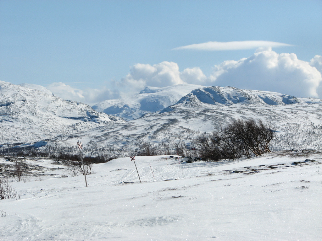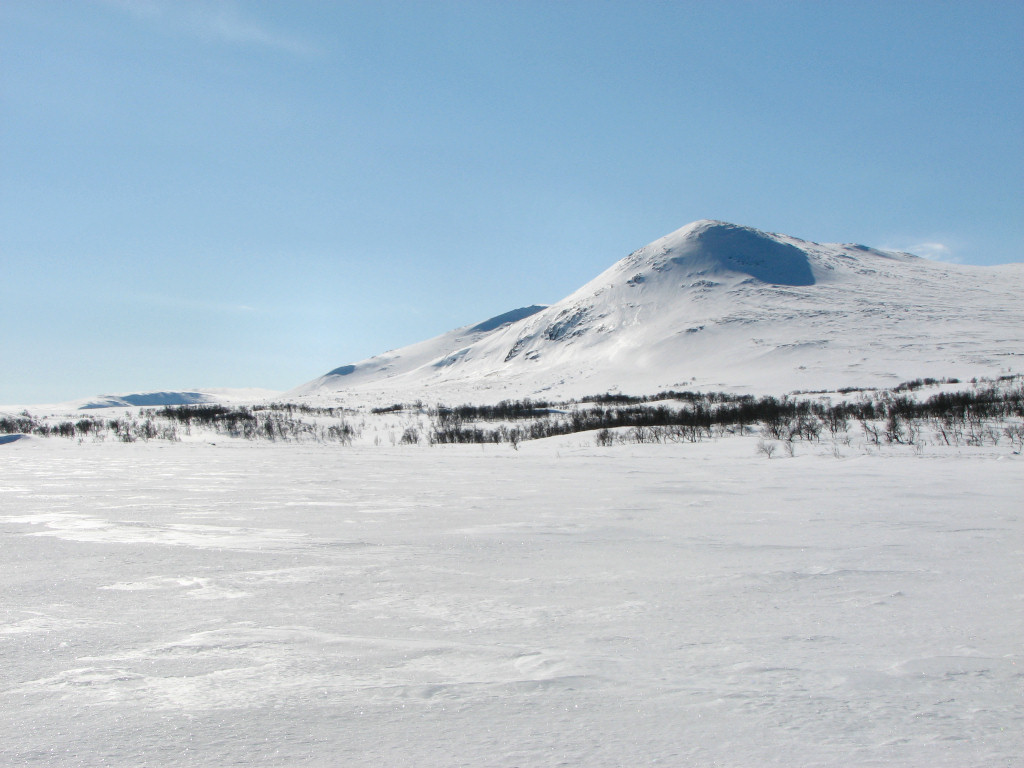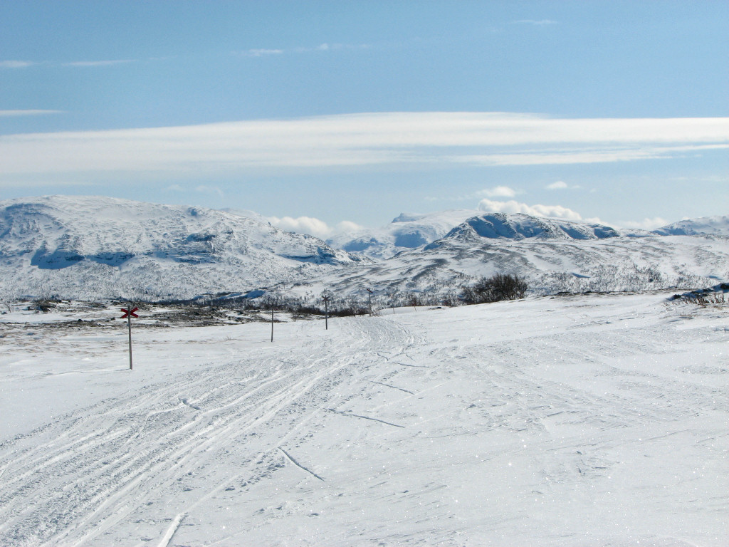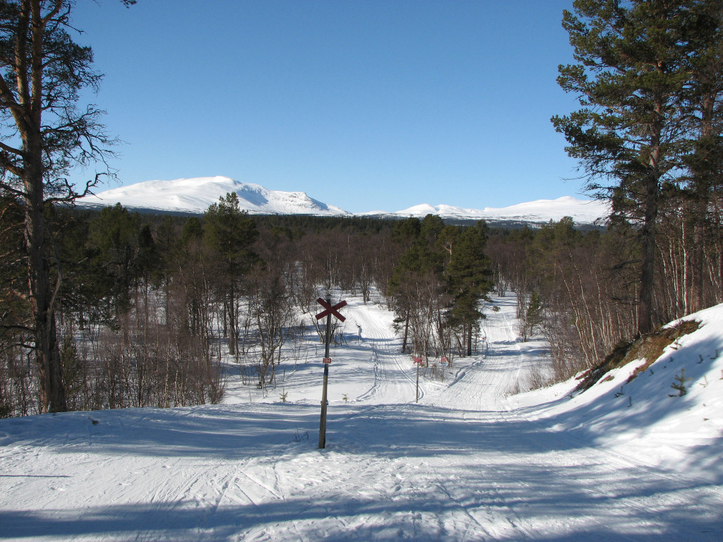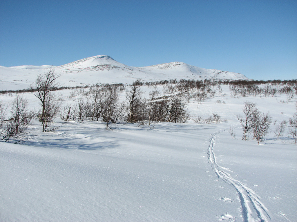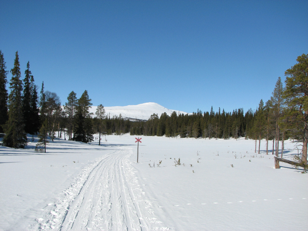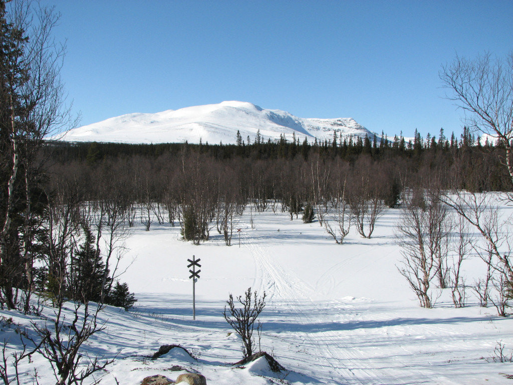 My train was on time, but the one supposed to arrive well before it wasn't, so the taxi-bus still had to wait in Undersåker. The weather was entirely clear and there appeared to be quite a bit of snow in the terrain, both of which boded well. After finalizing the (small) pack at the Vålådalen fjeld station I carried my skis down to the "trail field", since there was no snow on the road that needed to be crossed, and then started the tour before 10.