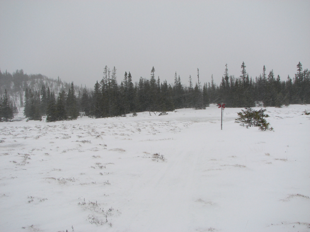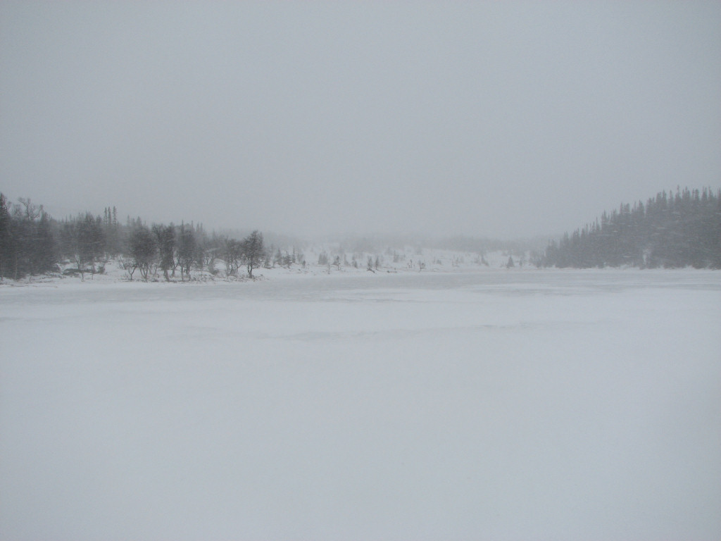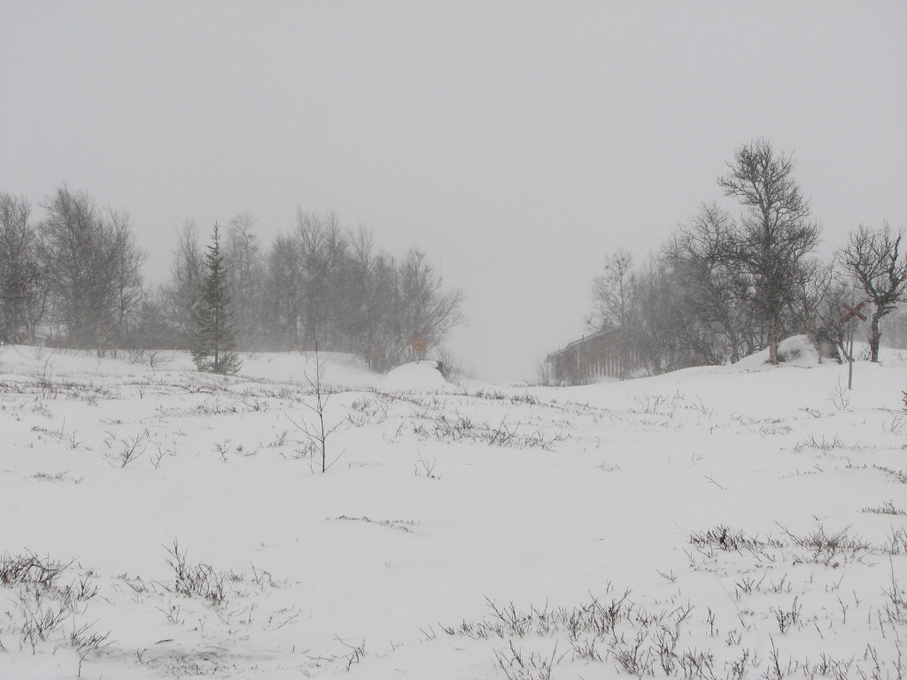 As I sat eating the snowfall intensified (hooray, sort of), and just when I left I spotted more people with dogs coming behind. The snow continued to be sticky at times – the temperature was now steady above freezing – and the dog people were catching up. More and more wind and snow hit me as I neared the mere that signals the start of the last slope up to the cottages, and I paused on its northern side for a bit. Visibility was very bad, especially since my glasses were wet from both perspiration and snow. I thought the others would overtake me for sure, but as they didn't I surmised that they were also pausing just behind. I kept to the western side of the ice where there was a bit more snow, and found the trail again at the southern end. Going up was easy – too easy, since the skis stuck quite admirably – even with the strong headwind, and I heard the smacking of the flagpole line in advance of catching sight of the cottages before 12:45.